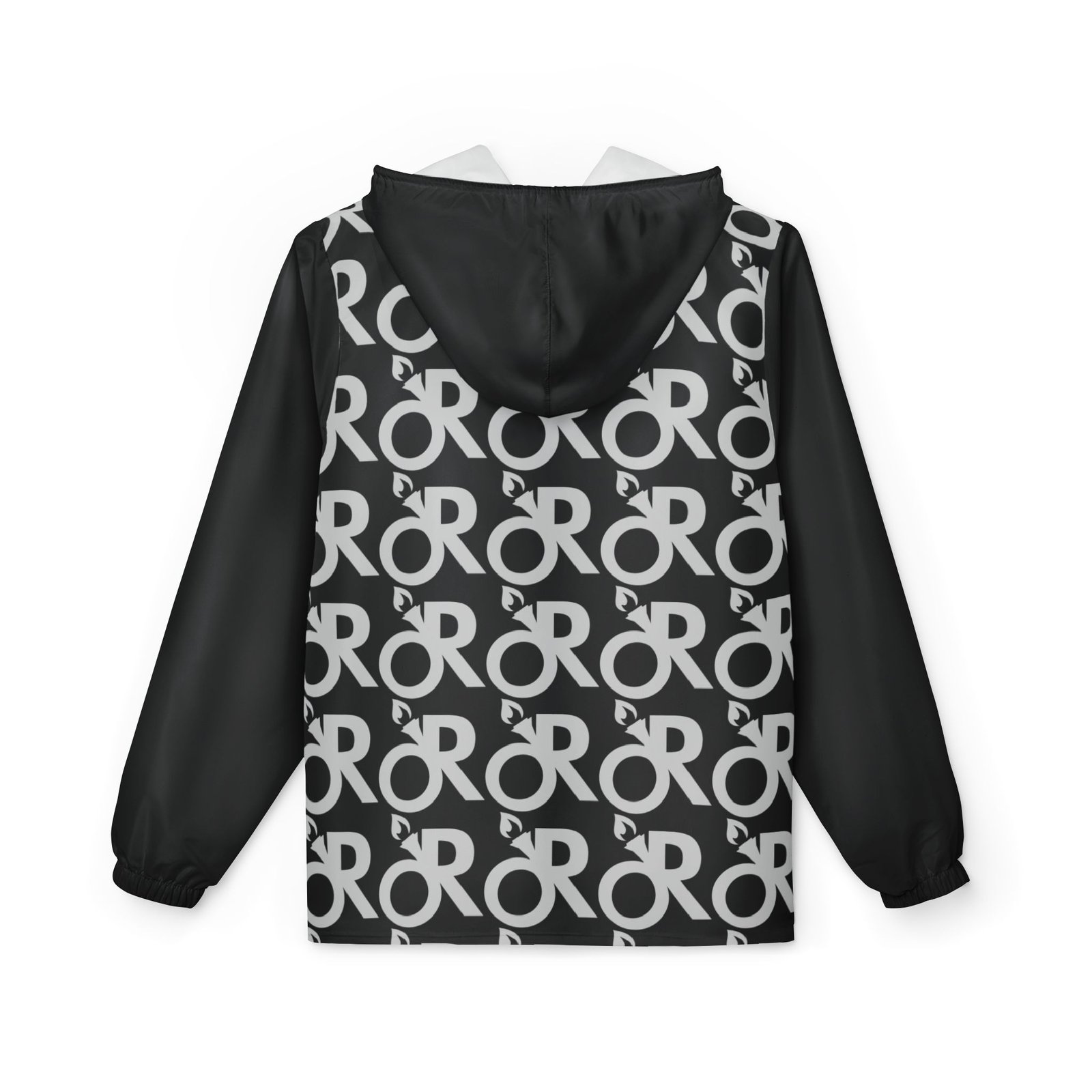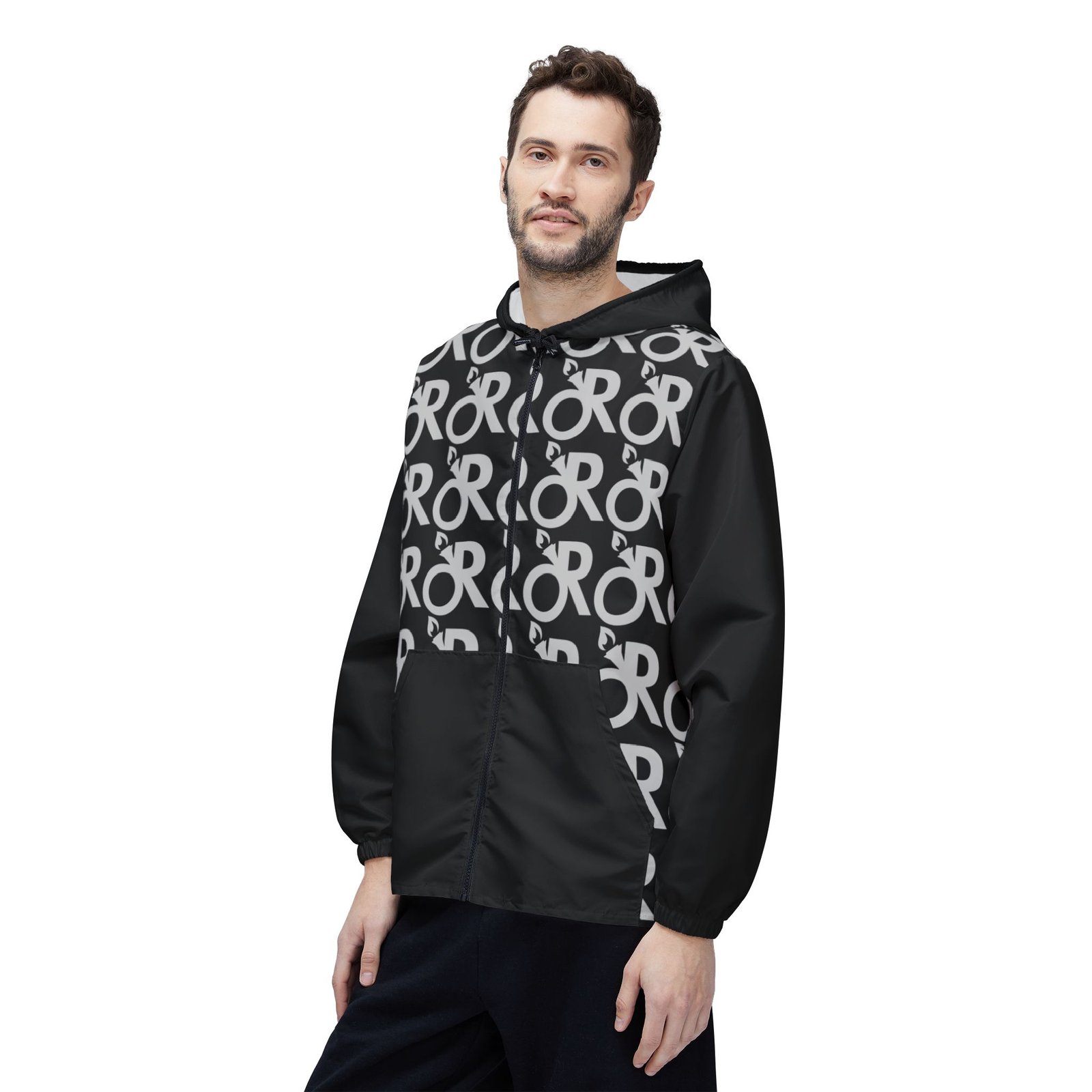 This lightweight windbreaker brings a city-ready edge to rainy rides and blustery commutes. The all-over monochrome pattern repeats a bold, circular logo across the front and back, while solid black sleeves and hood frame the design for a streamlined look. Thin and quick-drying polyester layers shrug off drizzle and gusts without weighing you down. Elastic cuffs seal out drafts and the full front zipper makes layering simple. It’s the kind of jacket you pull on for early-morning coffee runs, late-night bike rides, or when you want a subtle, graphic statement that reads modern and purposeful.