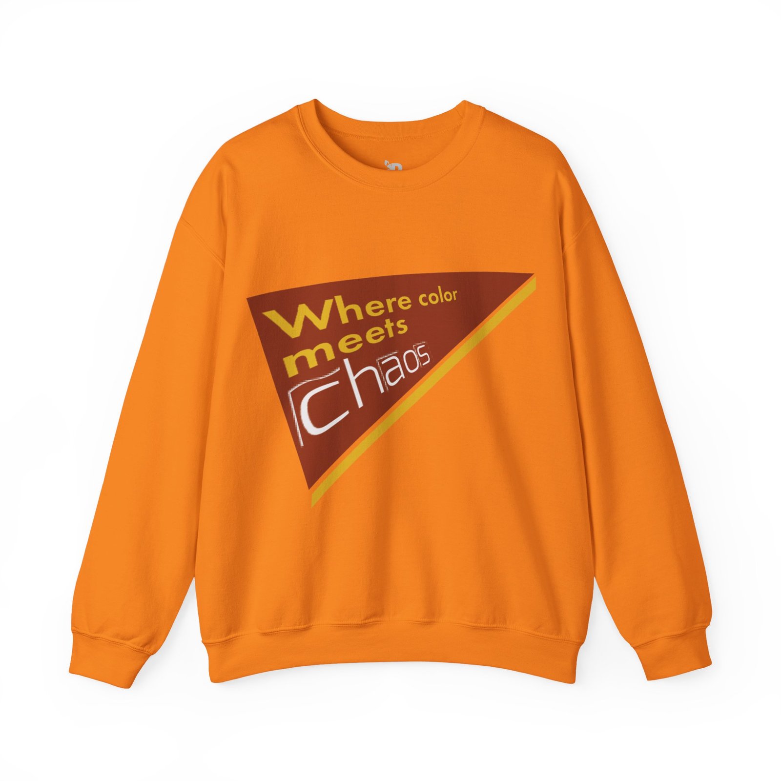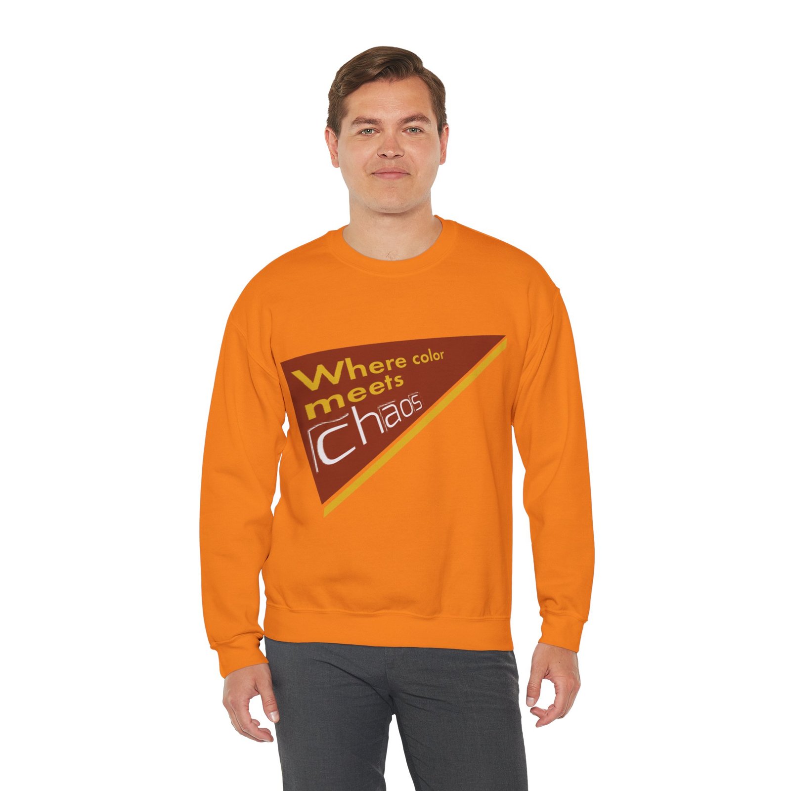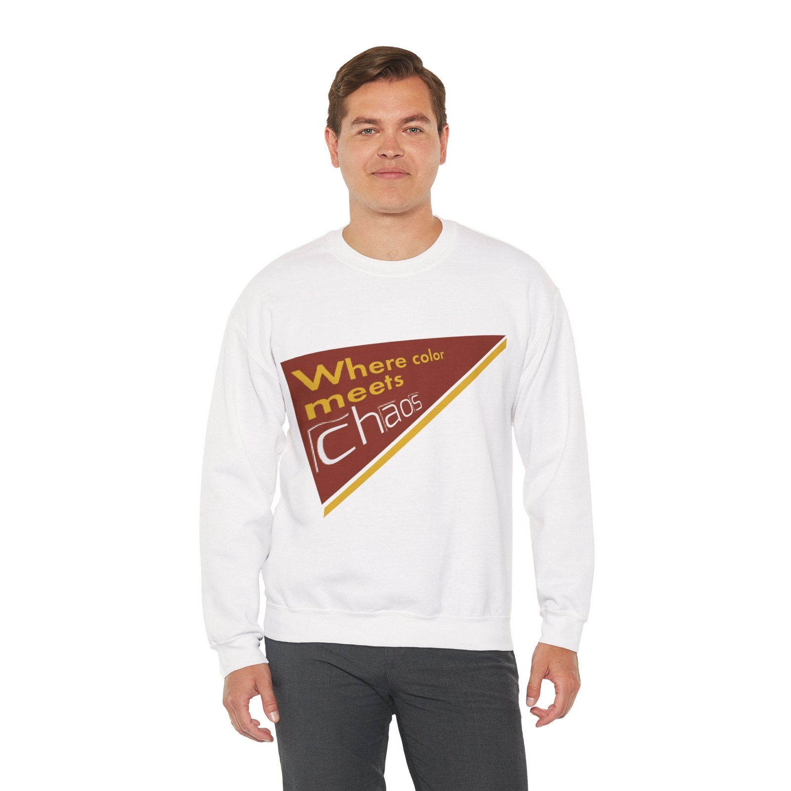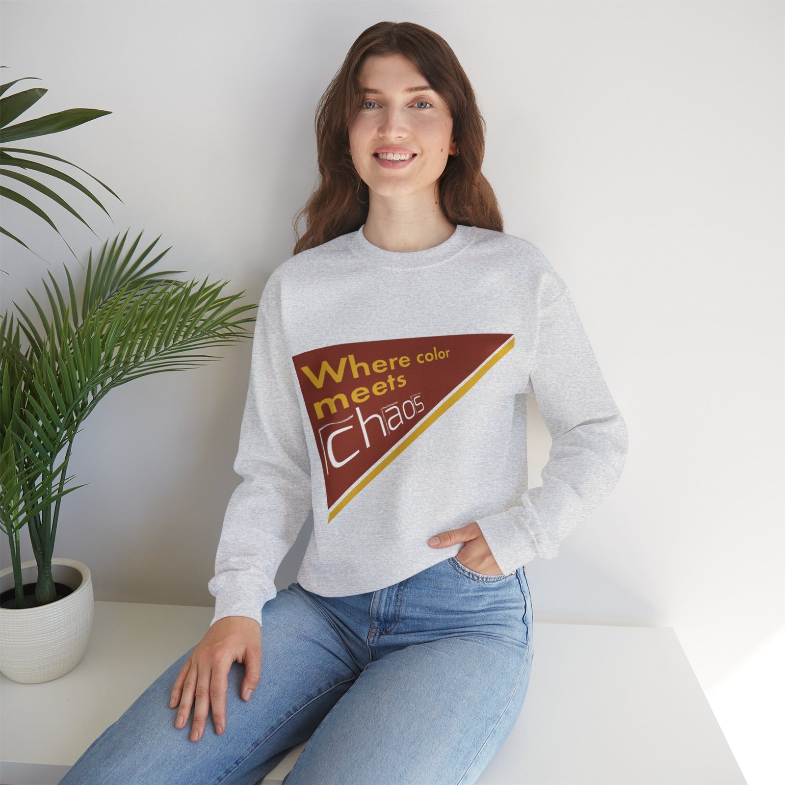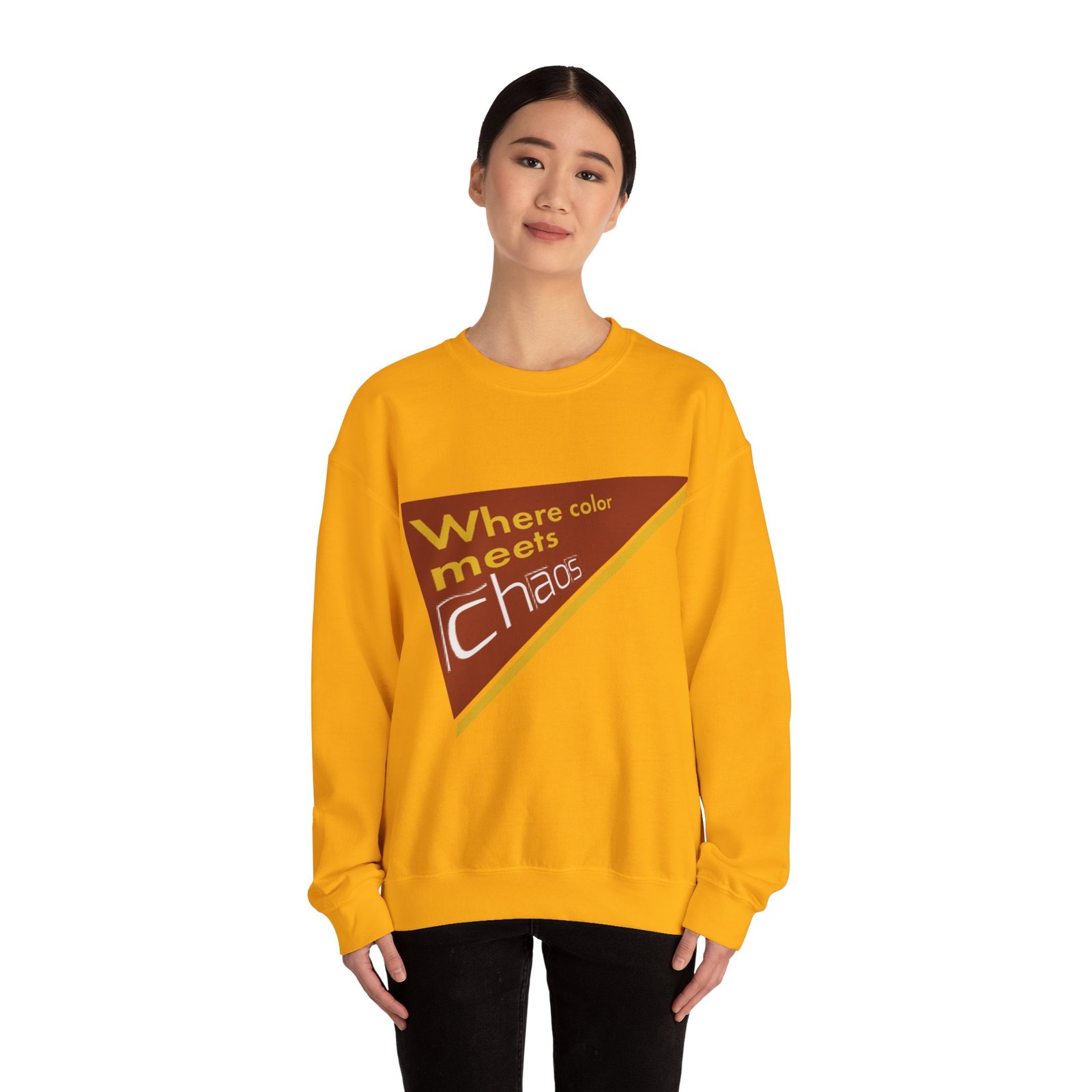 This cozy crewneck sweatshirt wears its personality on the chest — a retro-inspired geometric patch in warm rust, gold, and cream that reads “Where color meets chaos.” It feels like wrapping yourself in a creative mood board: soft midweight fabric, a relaxed classic fit, and thoughtful construction that keeps the shape wash after wash. Wear it while sketching, running errands between galleries, or teaming with jeans for a low-key studio day. The design nods to vintage graphics without shouting, so it blends into everyday life while still starting conversations about color, process, and playful disorder.