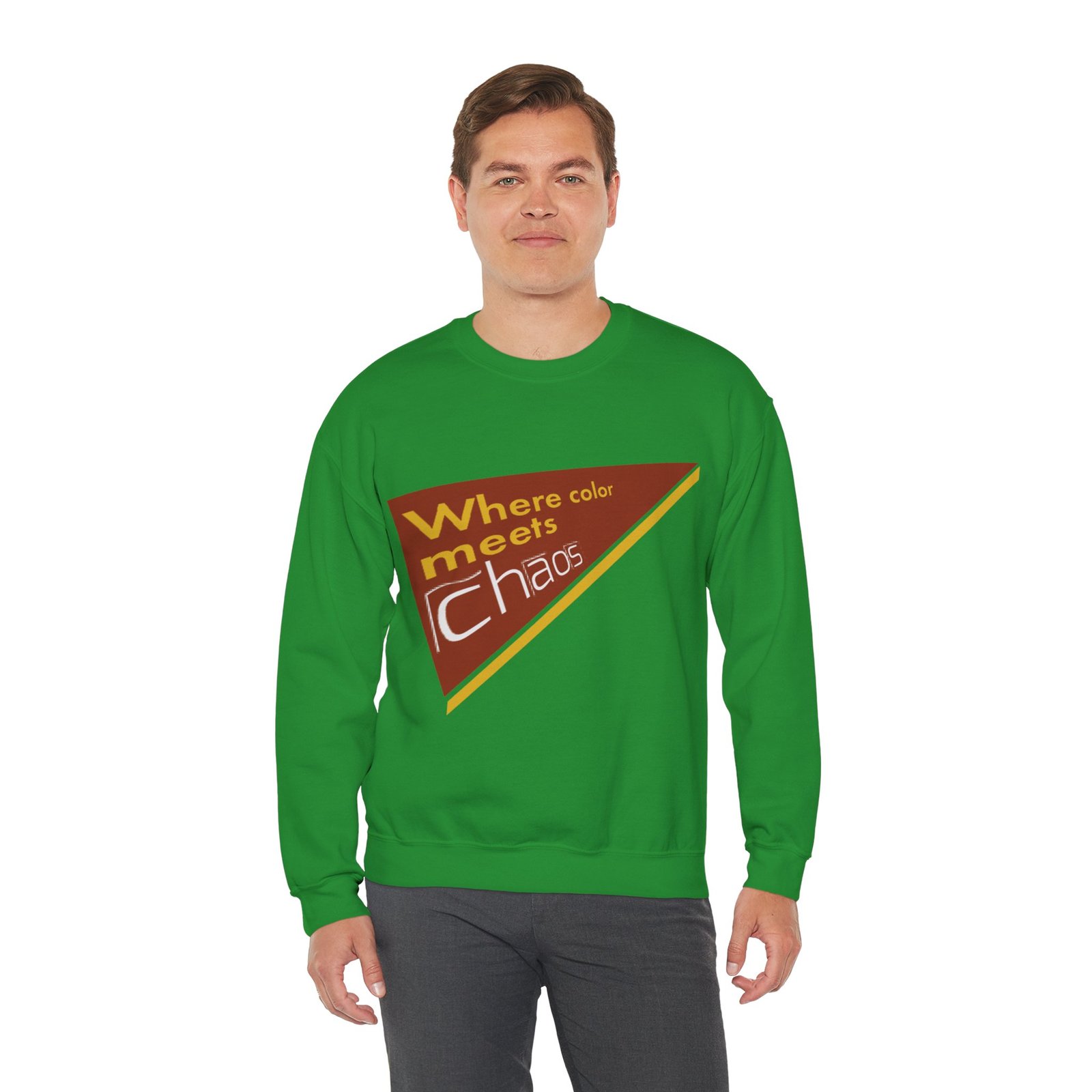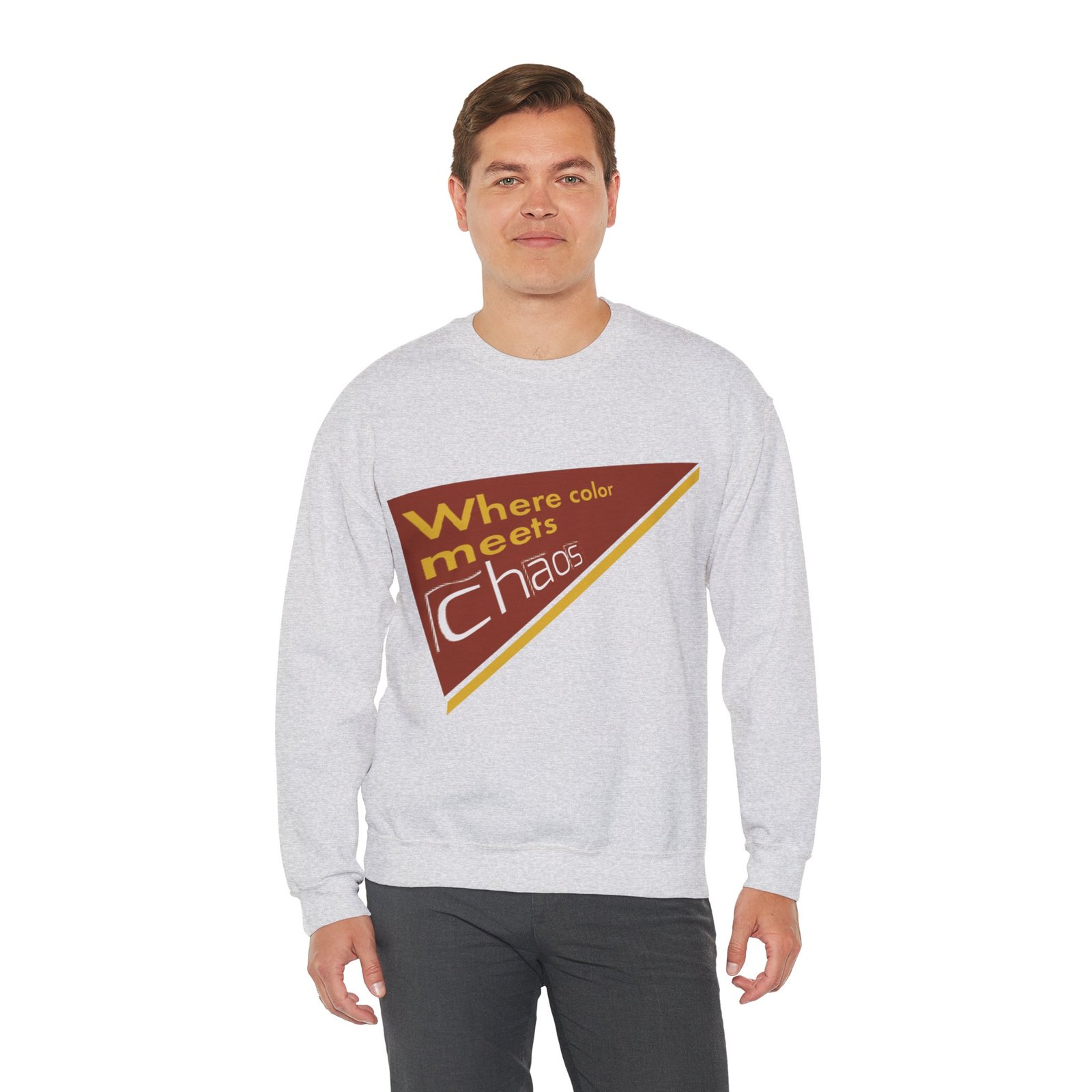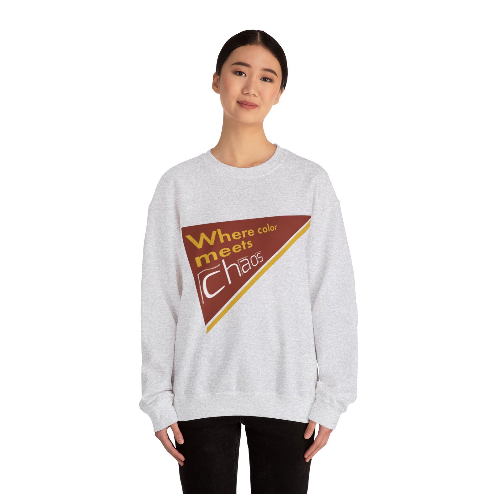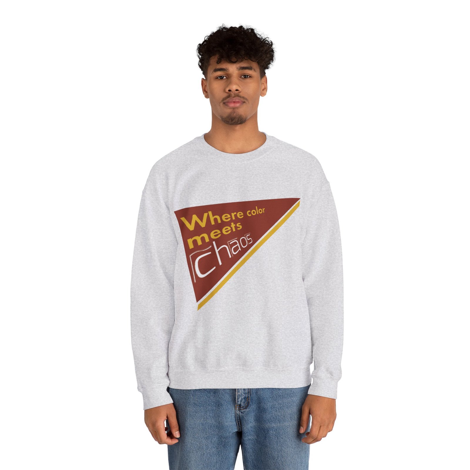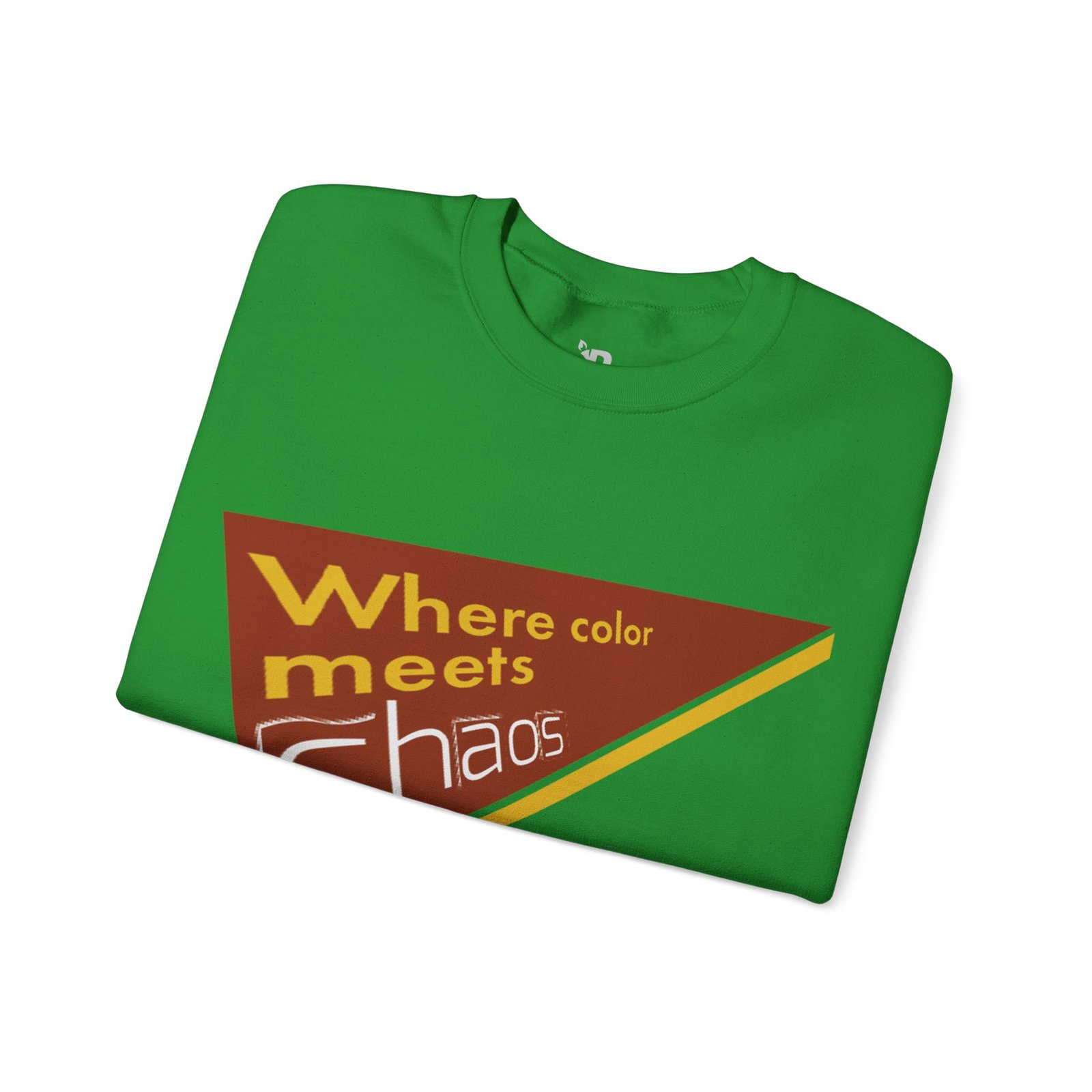 This cozy crewneck sweatshirt wears its personality on the chest — a retro-inspired geometric patch in warm rust, gold, and cream that reads “Where color meets chaos.” It feels like wrapping yourself in a creative mood board: soft midweight fabric, a relaxed classic fit, and thoughtful construction that keeps the shape wash after wash. Wear it while sketching, running errands between galleries, or teaming with jeans for a low-key studio day. The design nods to vintage graphics without shouting, so it blends into everyday life while still starting conversations about color, process, and playful disorder.