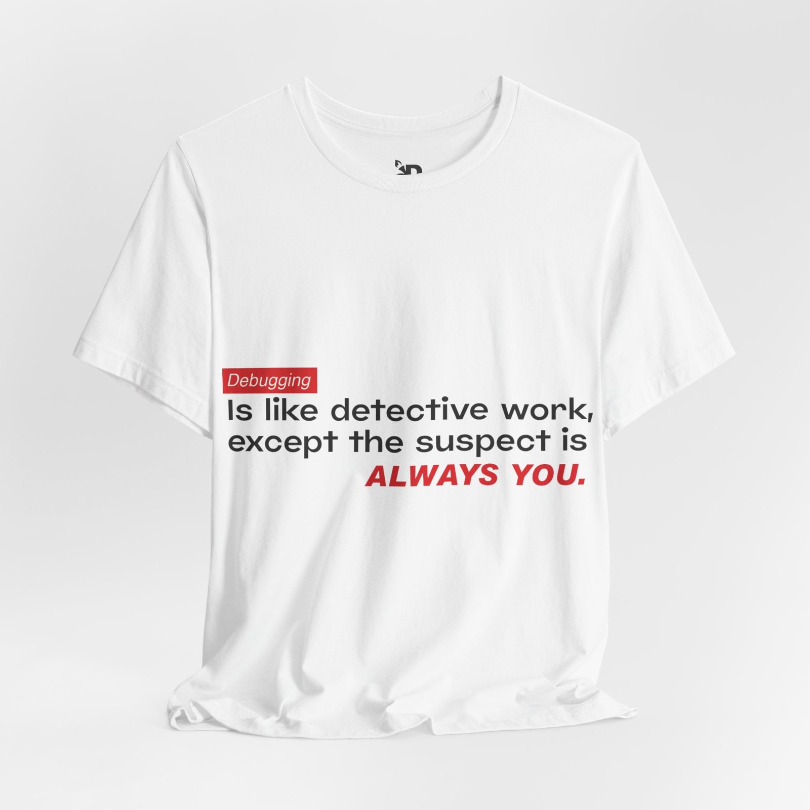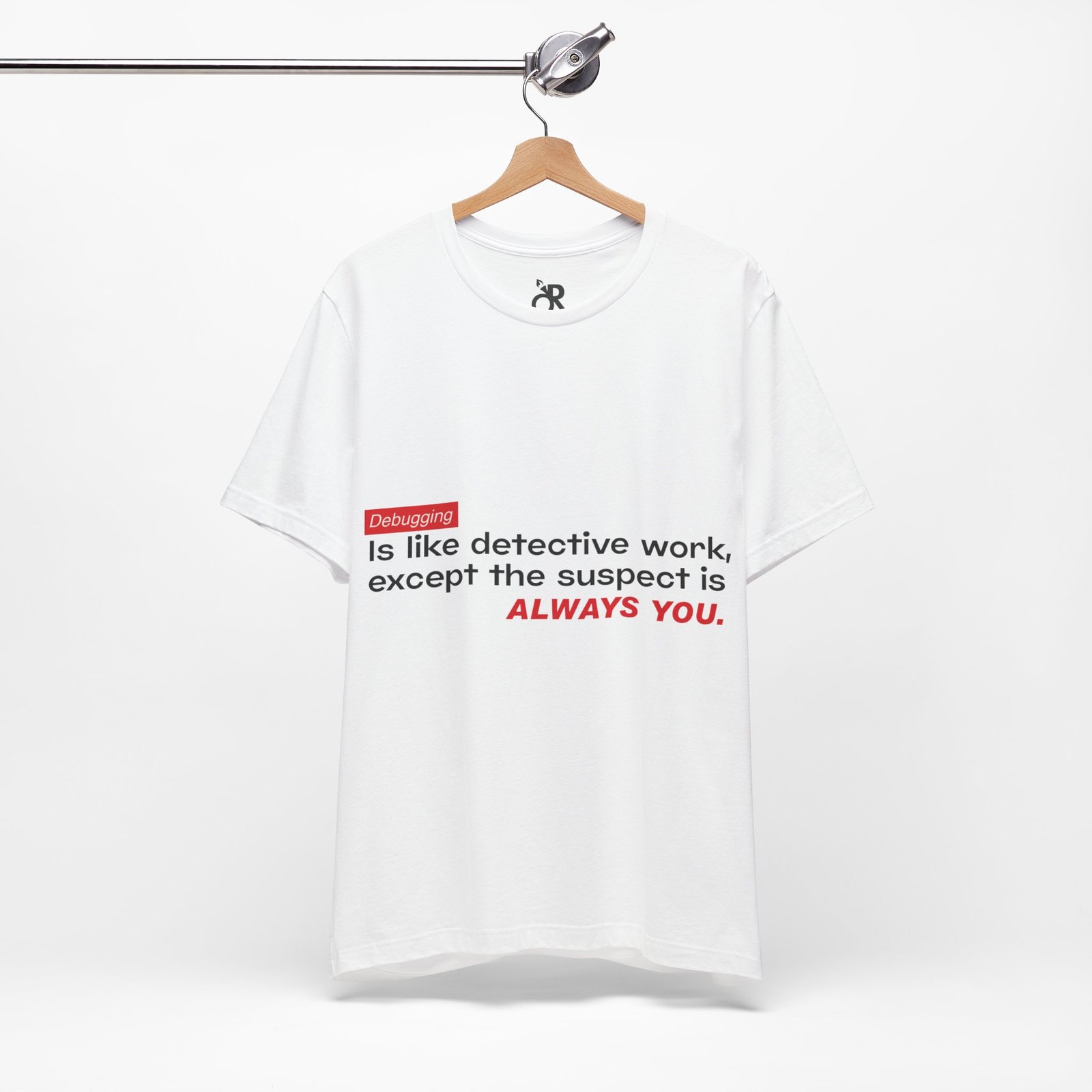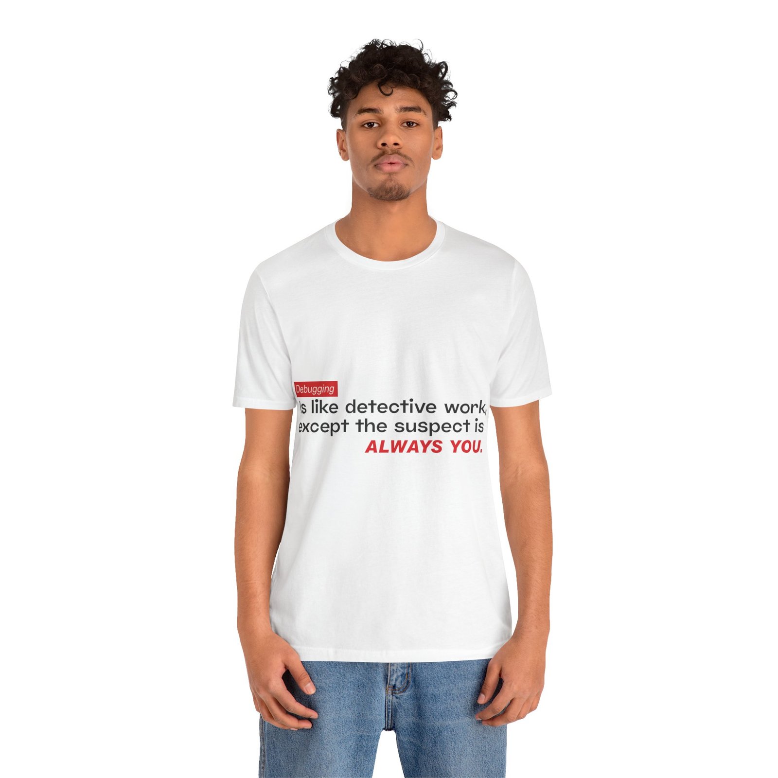 Lightweight, breathable, and quietly clever — this jersey tee speaks to the coder who’s spent nights tracing invisible logic and chasing phantom bugs. The front features a clean, minimal text design that reads like a wry briefing: short, sharp, and slightly conspiratorial. Slip it on between sprints, at meetups, or for low-key café debugging. The soft Airlume combed cotton feels gentle on the skin during long sessions, while the retail cut and crew neckline keep the silhouette tidy under a hoodie or blazer. Subtle construction details — side seams, ribbed collar, shoulder tape, and a tear-away label — keep the shirt comfortable and durable through repeat wears and washes. REACH certified and responsibly produced, this tee fits into a developer’s life as a pragmatic, witty staple that hints at late-night problem solving without shouting for attention.