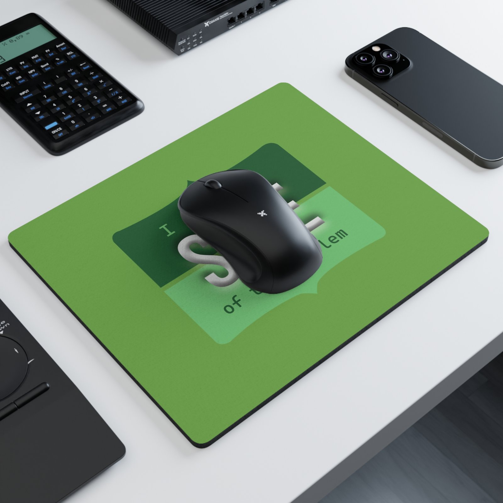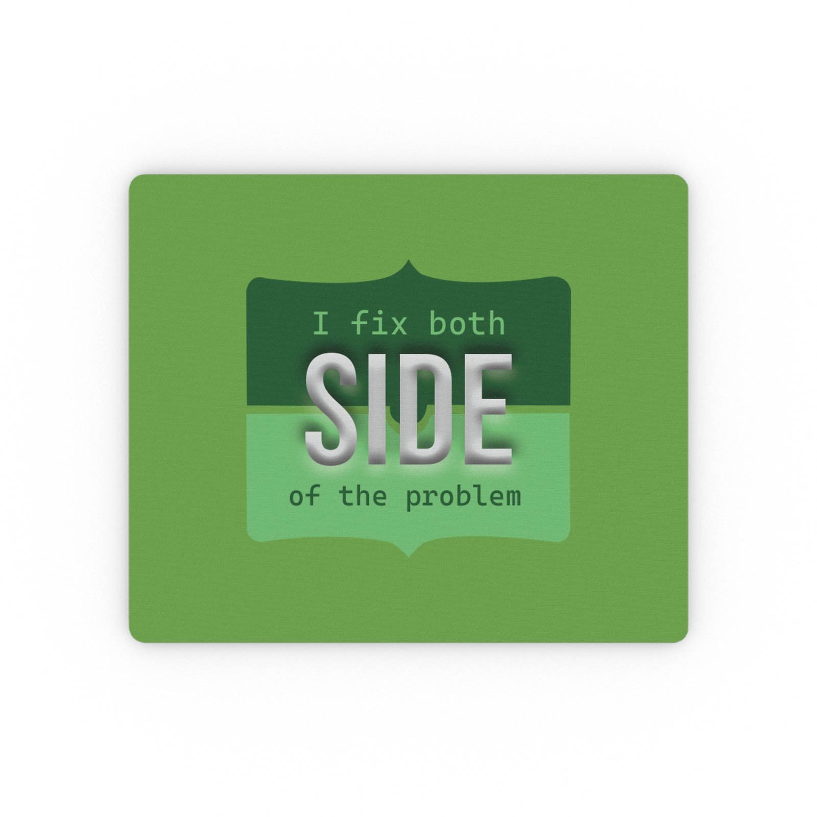 Bright green, rectangular mouse pad with a cheeky, tech-support inspired design: “I fix both SIDE of the problem.” The cloth surface shows crisp, layered type and a subtle 3D effect on the word “SIDE,” giving the artwork depth while keeping tracking smooth. It sits low and steady on your desk thanks to a non-slip rubber backing, so your mouse movement stays steady during long work sessions, late-night troubleshooting, or casual browsing. The compact 9.3″ × 7.8″ size fits neatly beside laptops or full-size keyboards without crowding your workspace. This mouse pad brings a little humor and personality to coding desks, home offices, and service counters — an easy way to remind yourself (or a colleague) that you handle the tricky parts with skill and a wink.