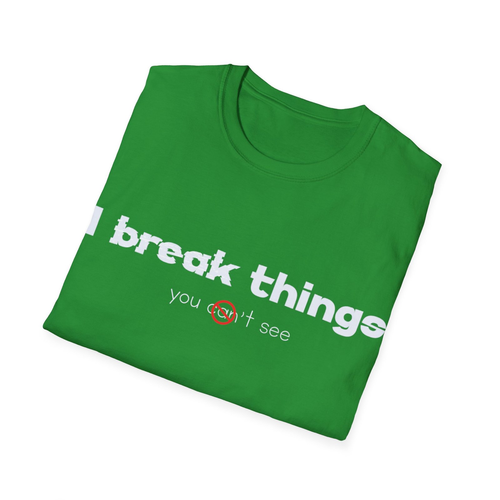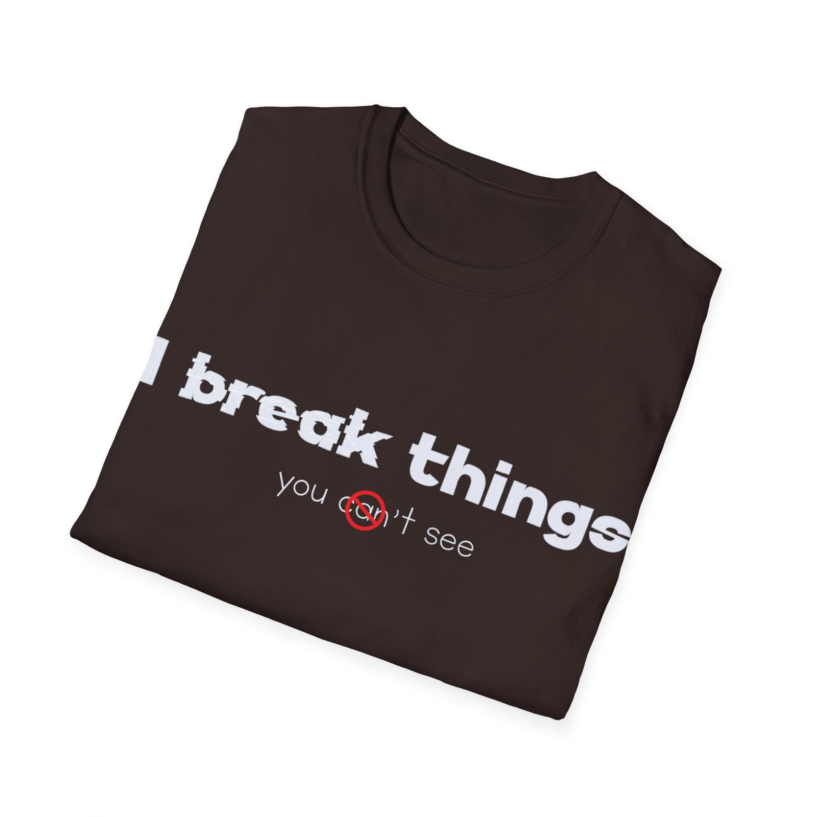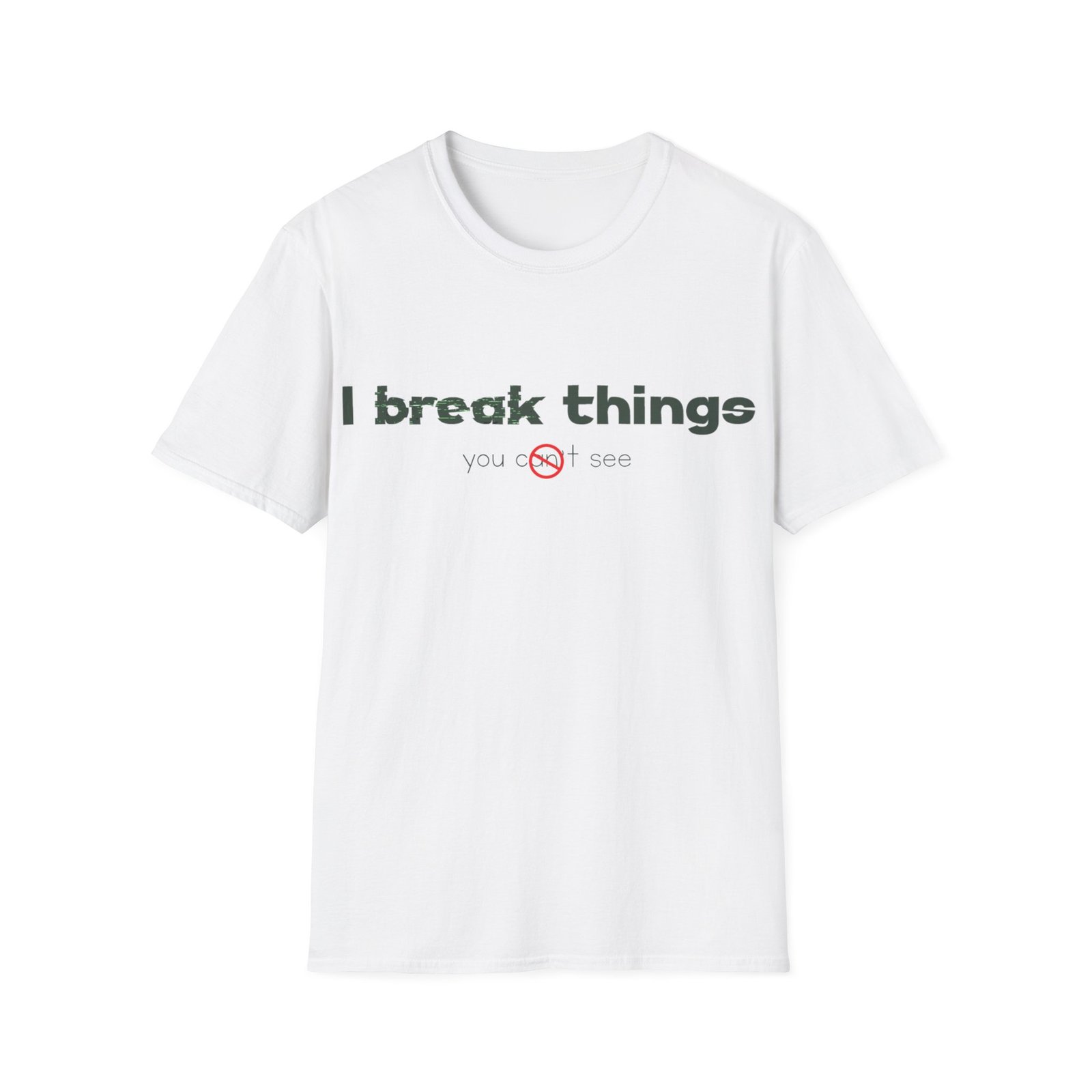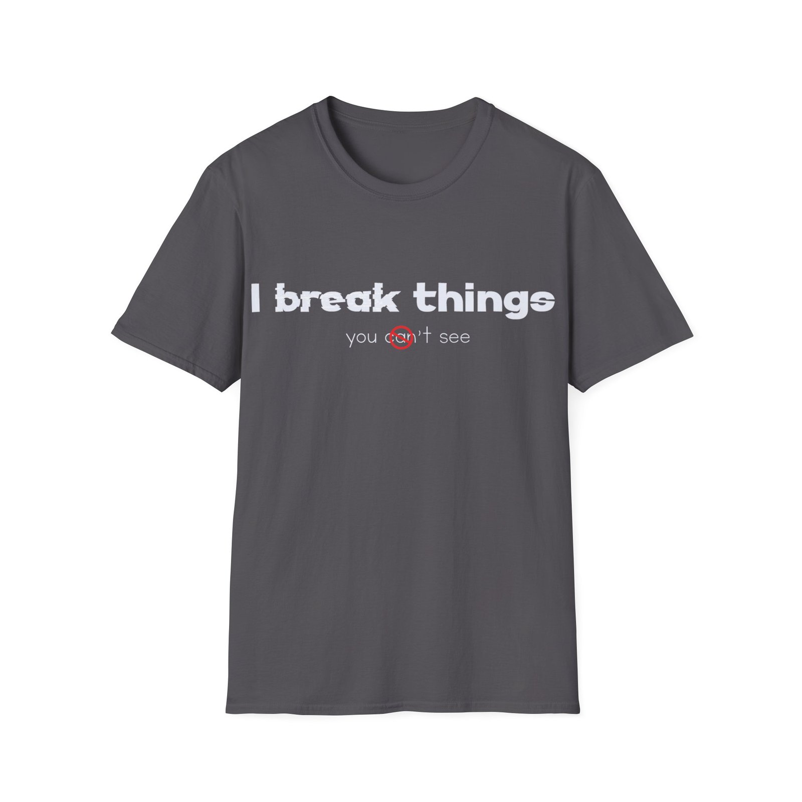 Lightweight, soft, and printed with care — this crewneck tee carries a quiet confidence. The front reads “I break things” in an intentionally distressed type, with a small circled ‘o’ beneath that hints at curiosity and glitchy humor. The back bears a subtle, single-color logo that sits low and unobtrusive. Wear it when you want your work-to-play ethos to speak for you: comfortable enough for long builds or late-night debugging, breathable for layered outfits, and understated enough to fit into a minimalist wardrobe. The feel is smooth against the skin and the silhouette stays clean thanks to a classic crew neckline and tear-away label.
