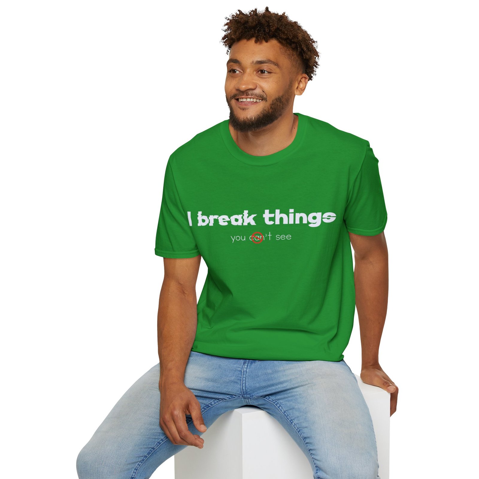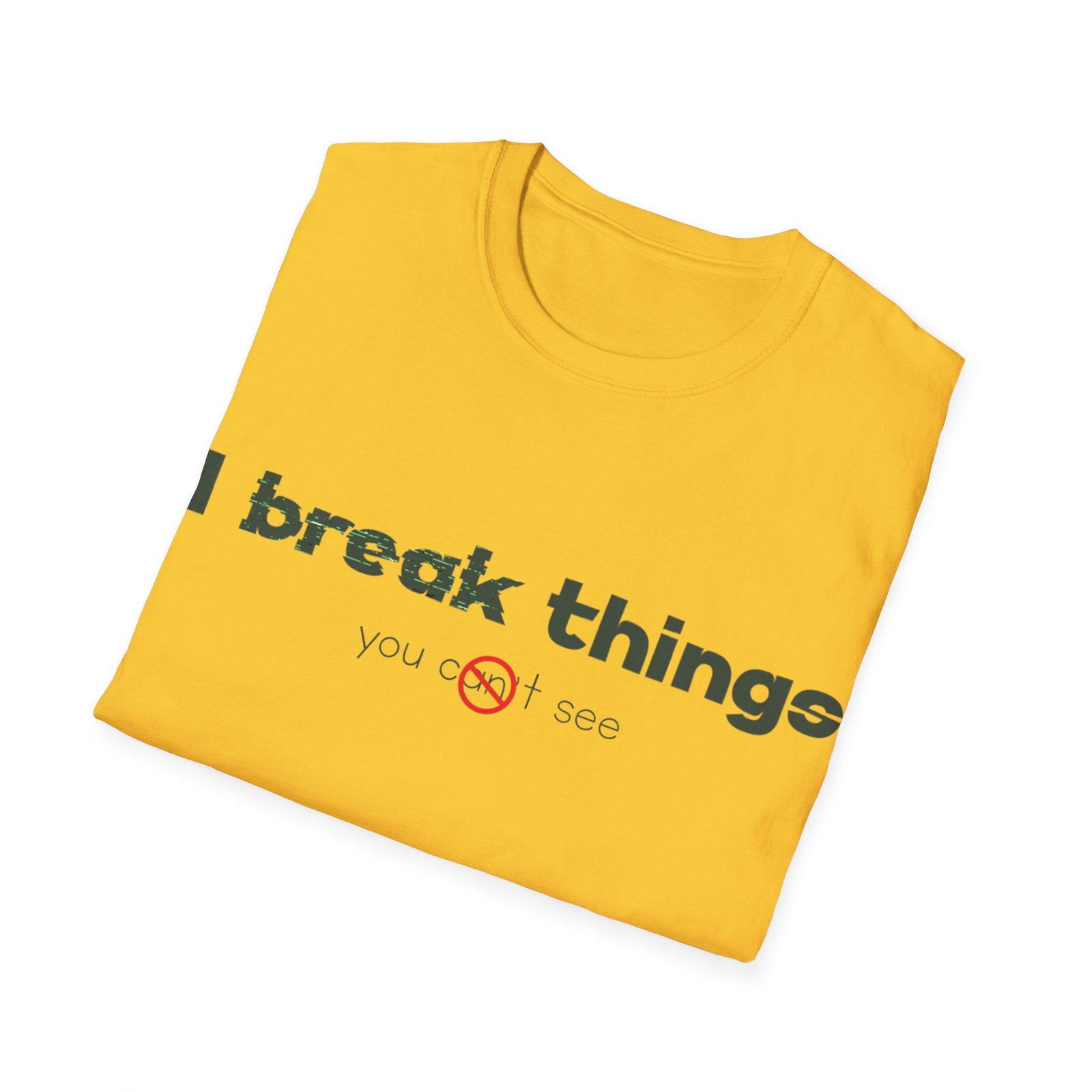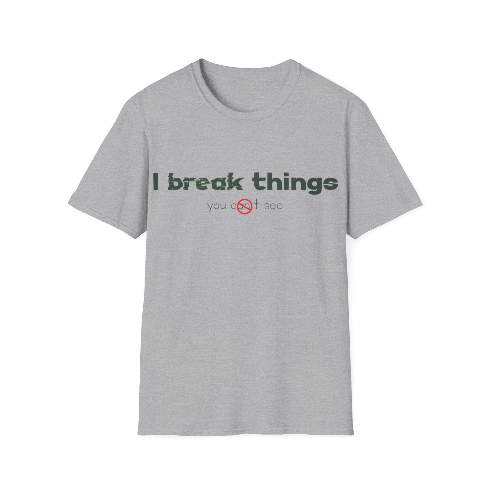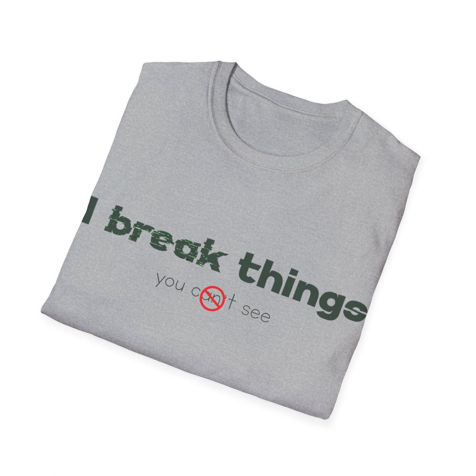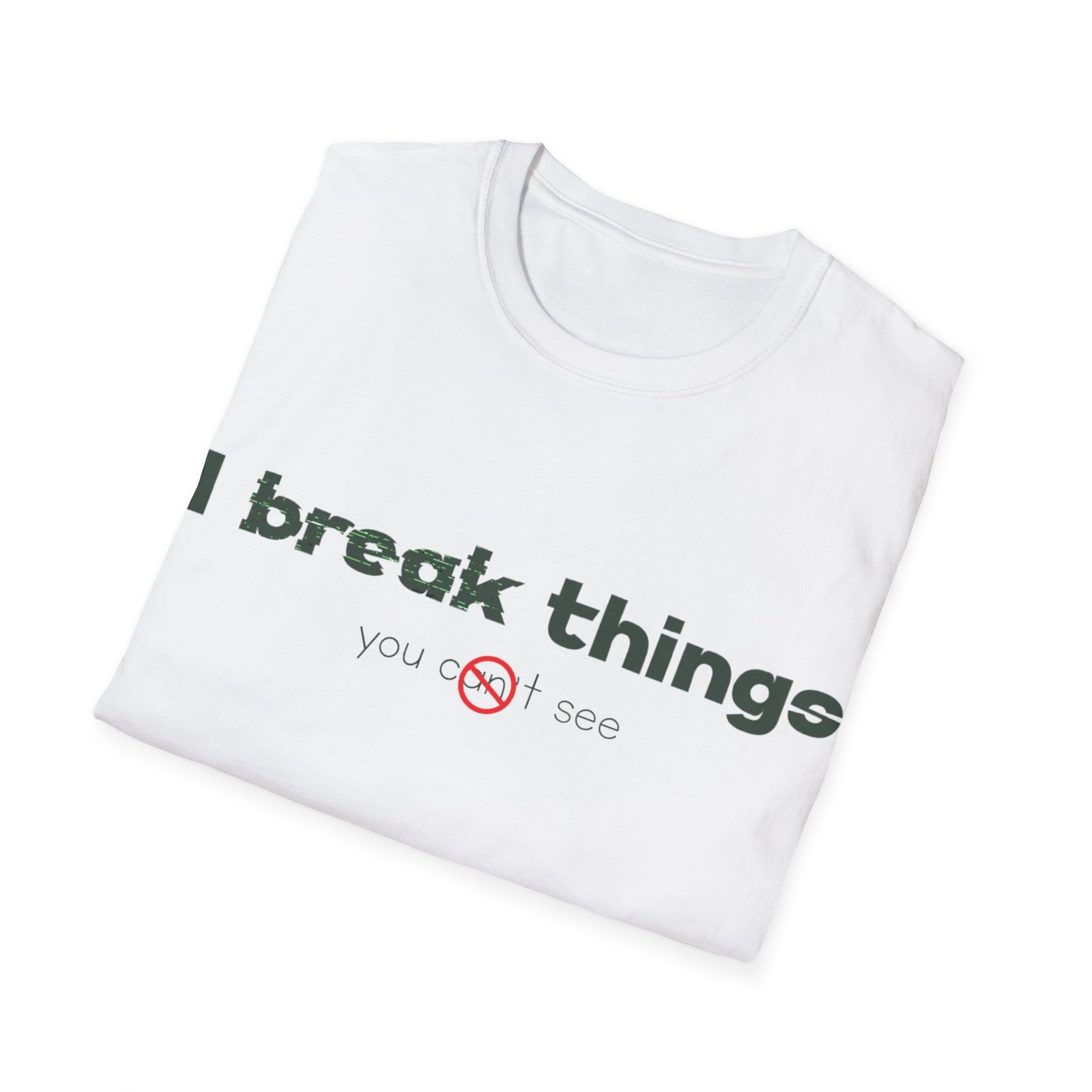 Lightweight, soft, and printed with care — this crewneck tee carries a quiet confidence. The front reads “I break things” in an intentionally distressed type, with a small circled ‘o’ beneath that hints at curiosity and glitchy humor. The back bears a subtle, single-color logo that sits low and unobtrusive. Wear it when you want your work-to-play ethos to speak for you: comfortable enough for long builds or late-night debugging, breathable for layered outfits, and understated enough to fit into a minimalist wardrobe. The feel is smooth against the skin and the silhouette stays clean thanks to a classic crew neckline and tear-away label.