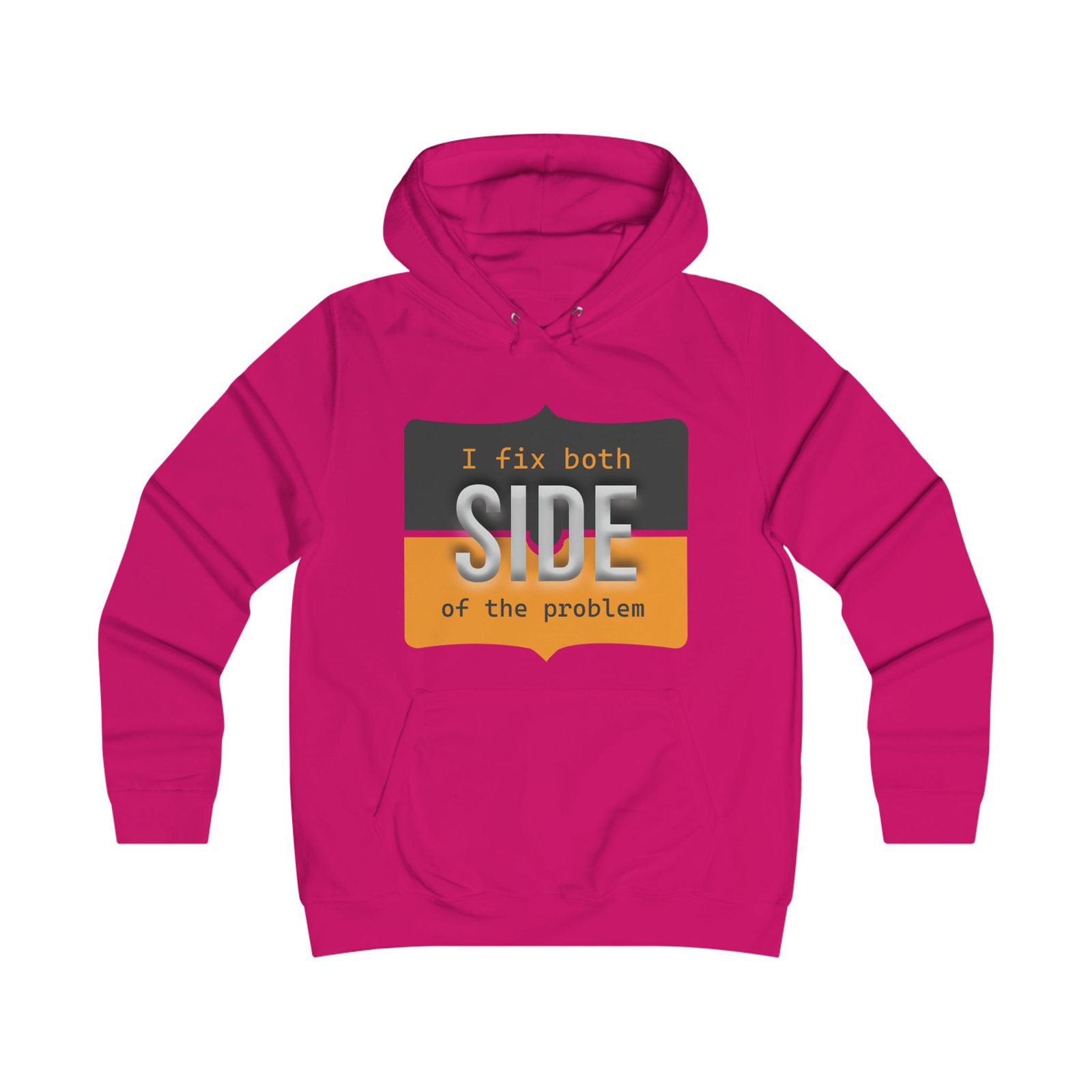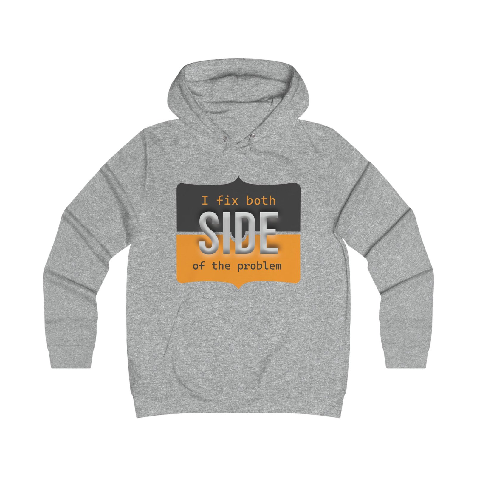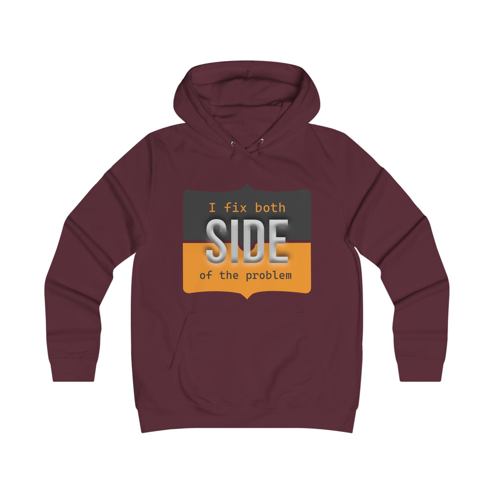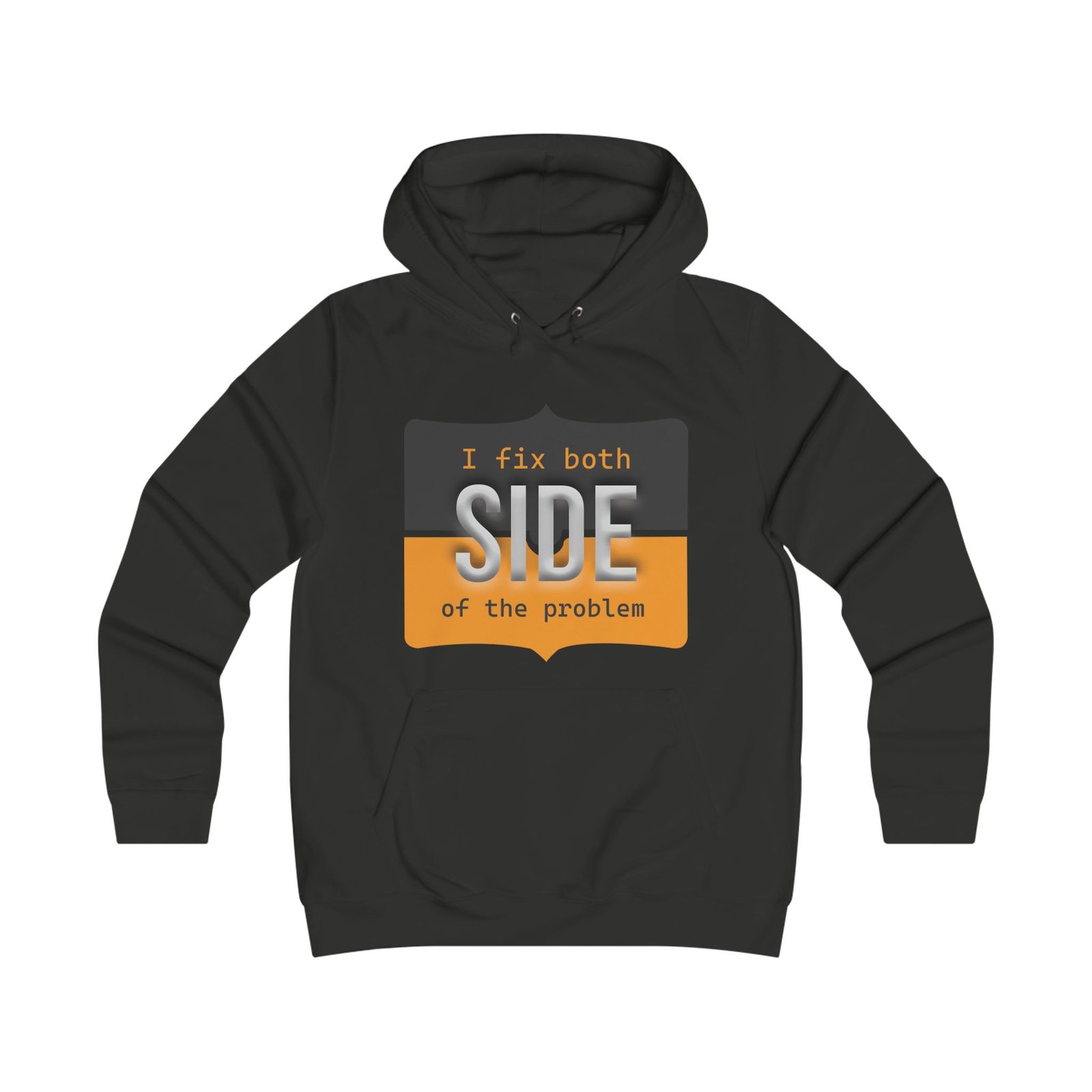 This relaxed hoodie blends playful rebellion with everyday comfort. The front graphic reads “I fix both SIDE of the problem” in bold type and warm ochre and charcoal blocks, giving the design a vintage signboard vibe. A minimalist emblem sits on the back near the shoulders, echoing the front’s palette for a cohesive look. Wear it on slow mornings, long study sessions, or evenings out when you want a subtle, witty statement that reads smart and slightly irreverent. The roomy hood and kangaroo pocket make it feel like a practical companion — cozy during walks between campus buildings, layered over a tee at coffee runs, or thrown on for late-night group projects.