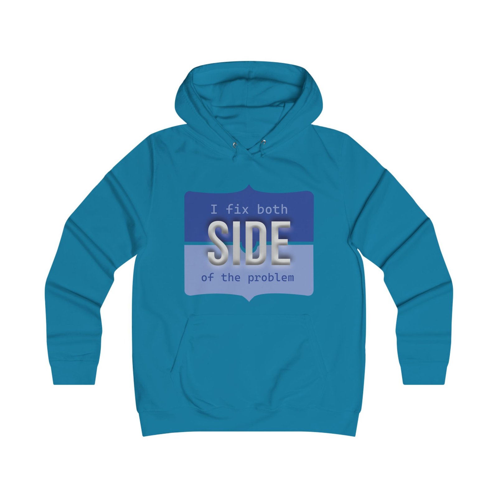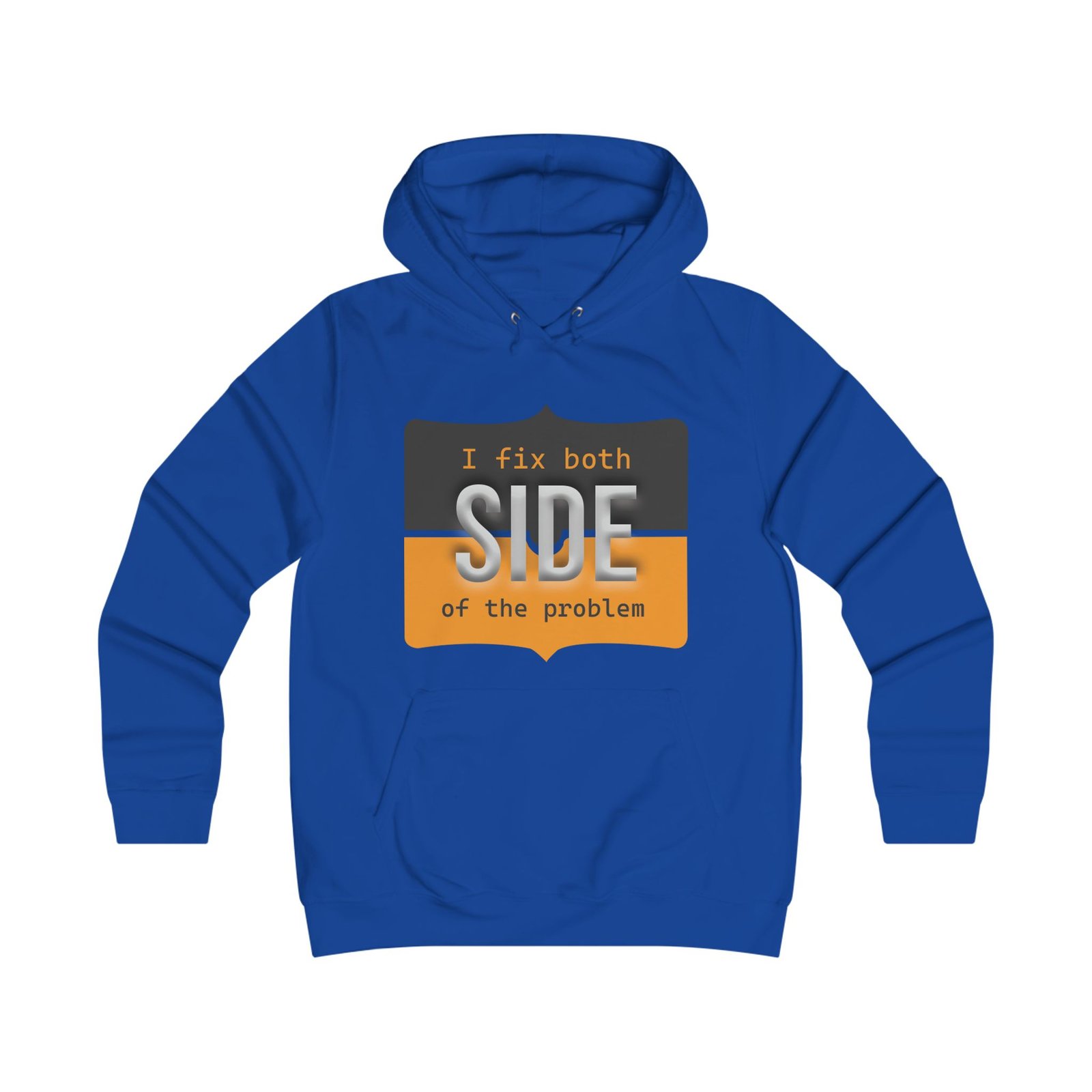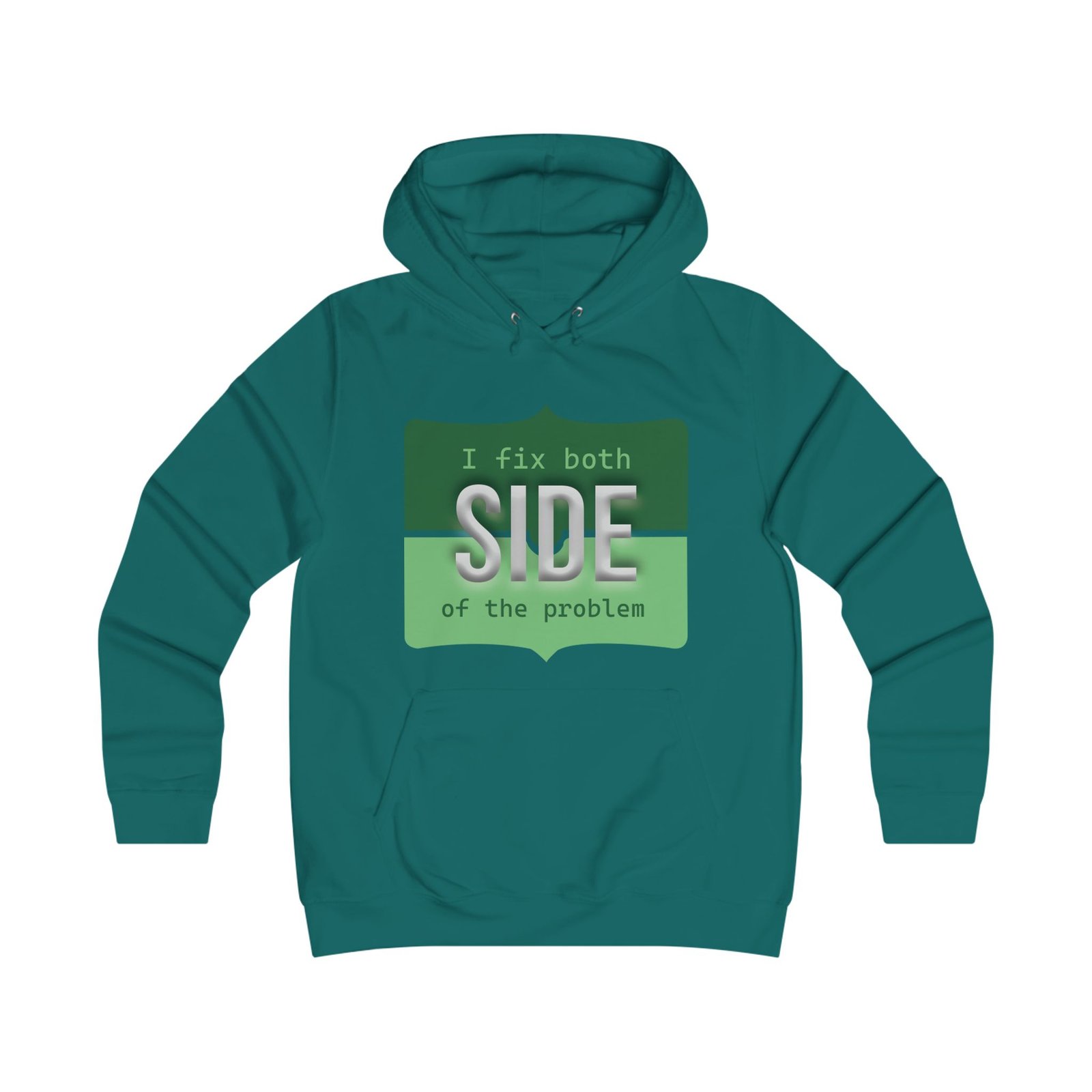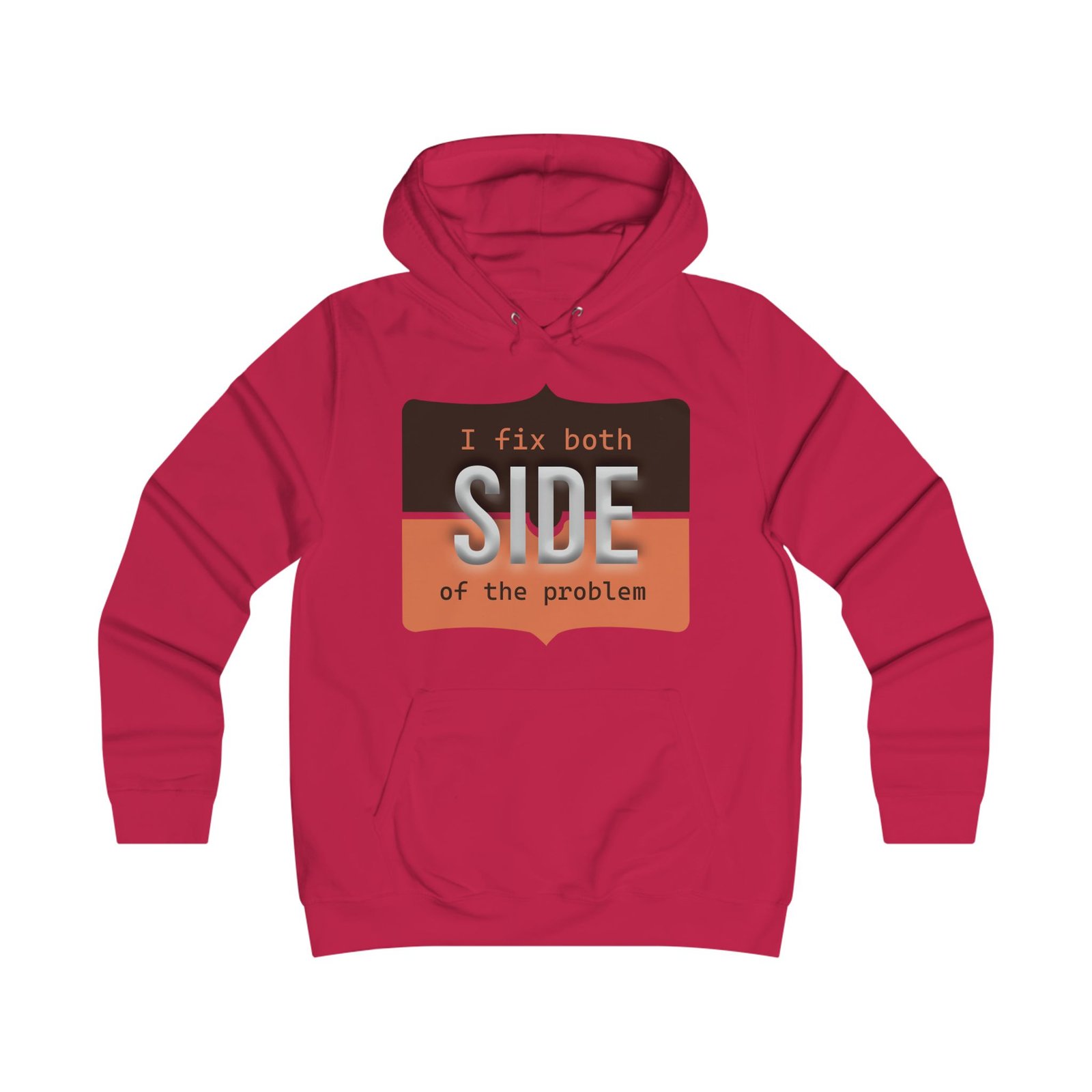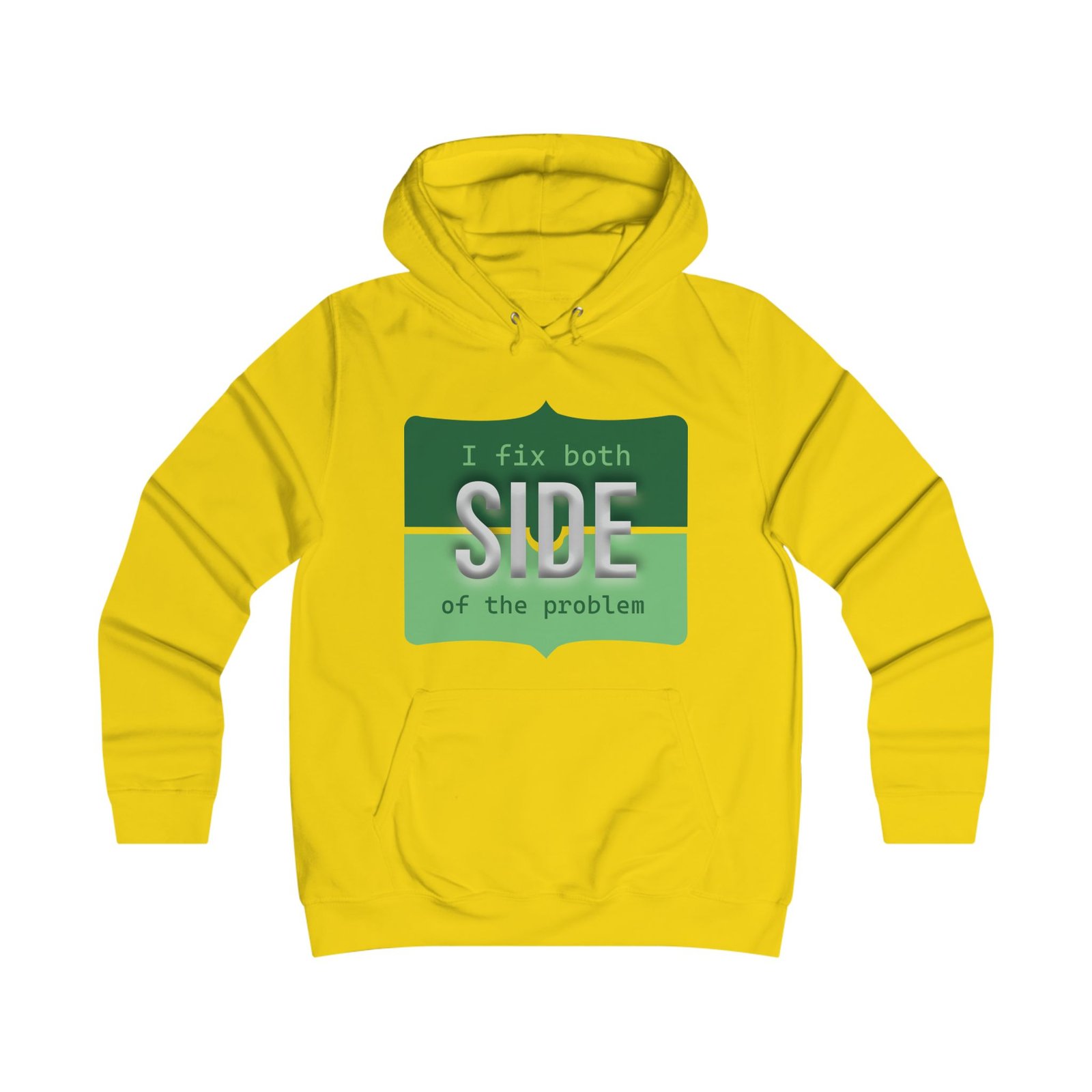 This relaxed hoodie blends playful rebellion with everyday comfort. The front graphic reads “I fix both SIDE of the problem” in bold type and warm ochre and charcoal blocks, giving the design a vintage signboard vibe. A minimalist emblem sits on the back near the shoulders, echoing the front’s palette for a cohesive look. Wear it on slow mornings, long study sessions, or evenings out when you want a subtle, witty statement that reads smart and slightly irreverent. The roomy hood and kangaroo pocket make it feel like a practical companion — cozy during walks between campus buildings, layered over a tee at coffee runs, or thrown on for late-night group projects.
