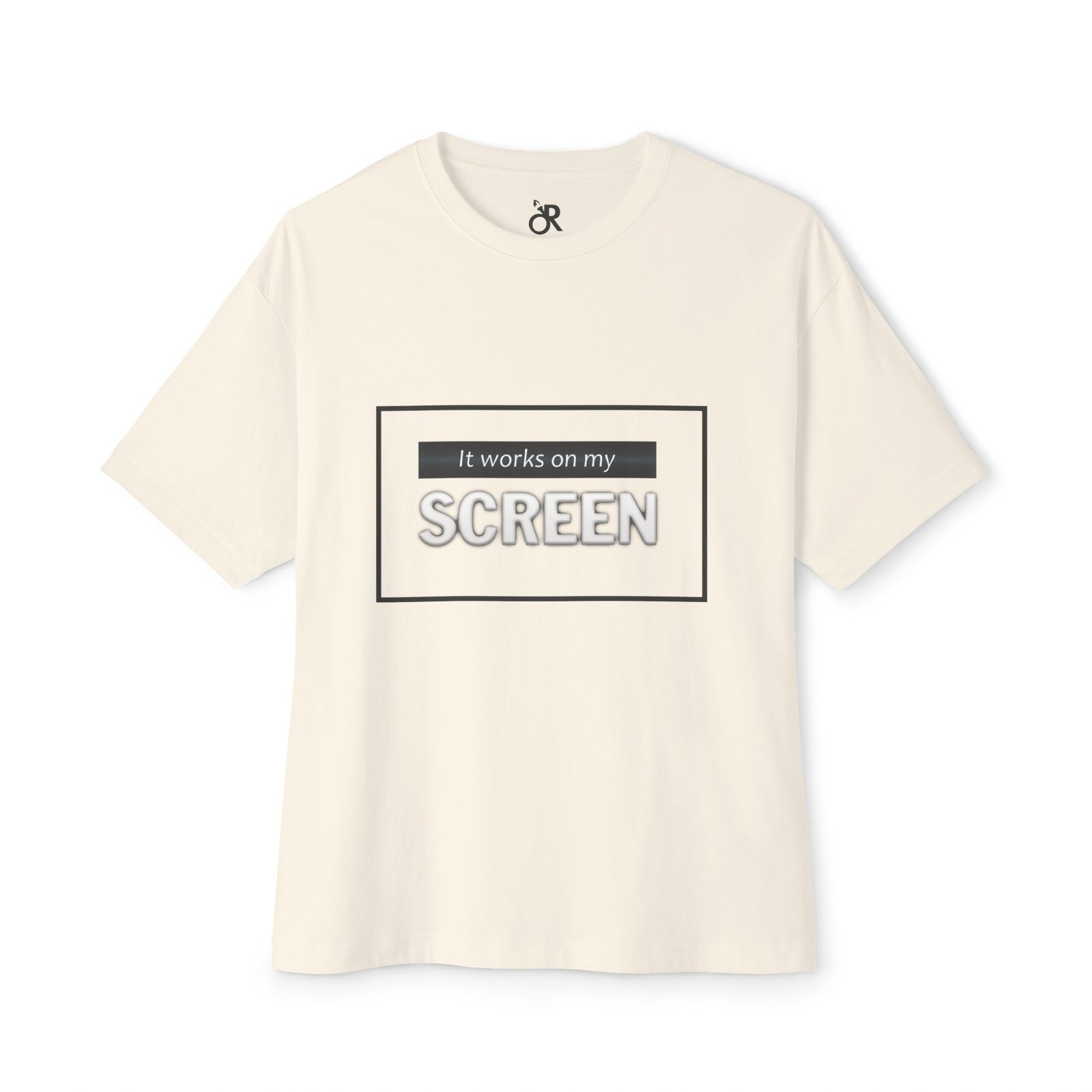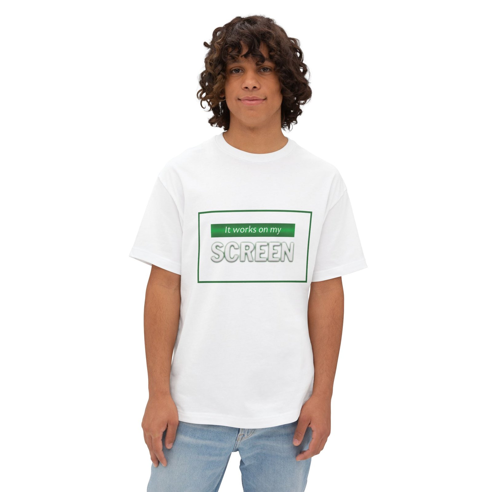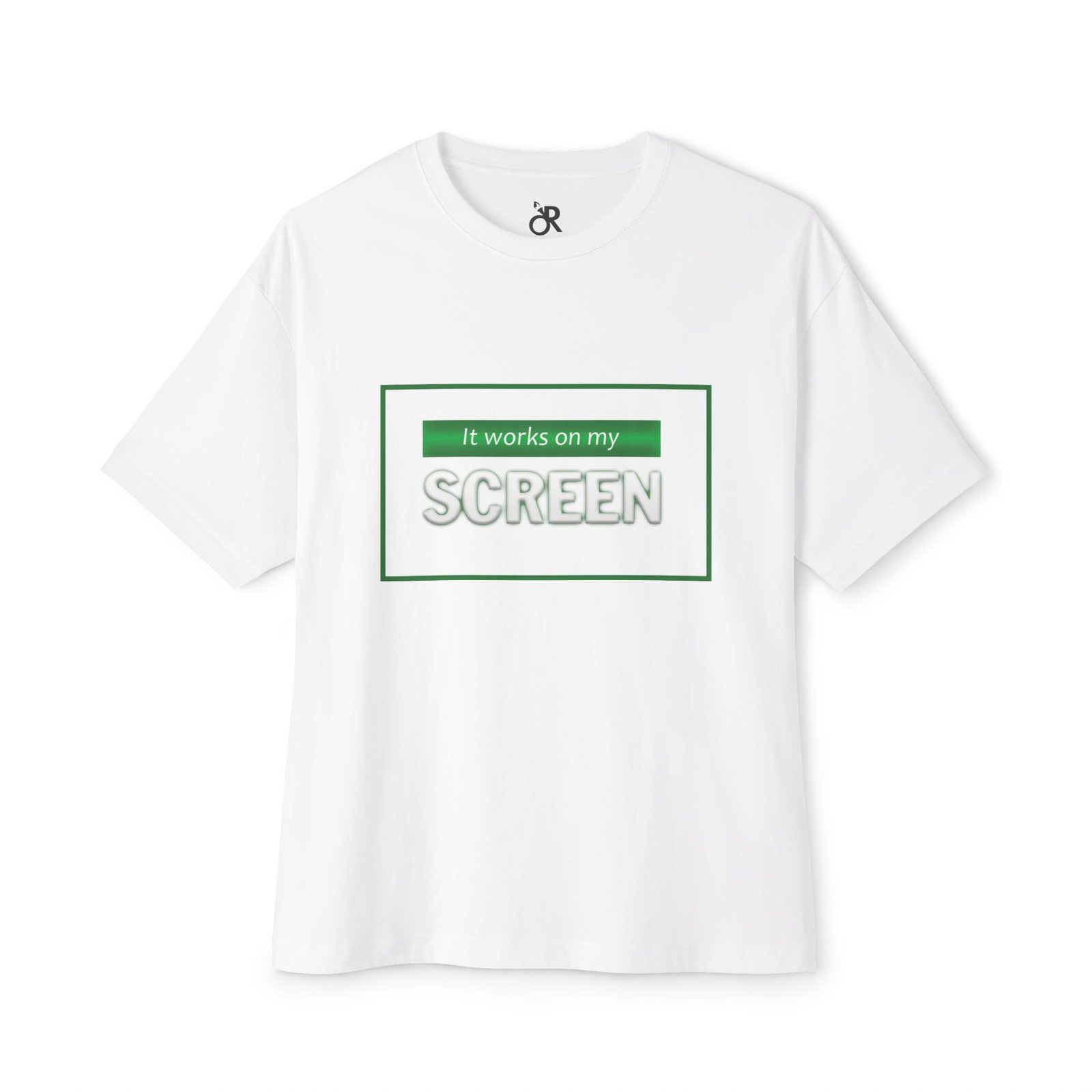 Soft, roomy, and quietly humorous — this boxy tee carries a laid-back attitude with a green-accented graphic that reads “It works on my SCREEN.” It drapes with dropped shoulders and a relaxed silhouette, sitting like a lived-in favorite whether you’re debugging code, testing designs, or scrolling through late-night feeds. The medium-weight cotton feels substantial without being stiff, and the tear-away label keeps the collar itch-free. Wear it with loose jeans, under an open flannel, or layered beneath a zip hoodie for a casual, confident look that speaks the language of makers, devs, and screen-first creatives.