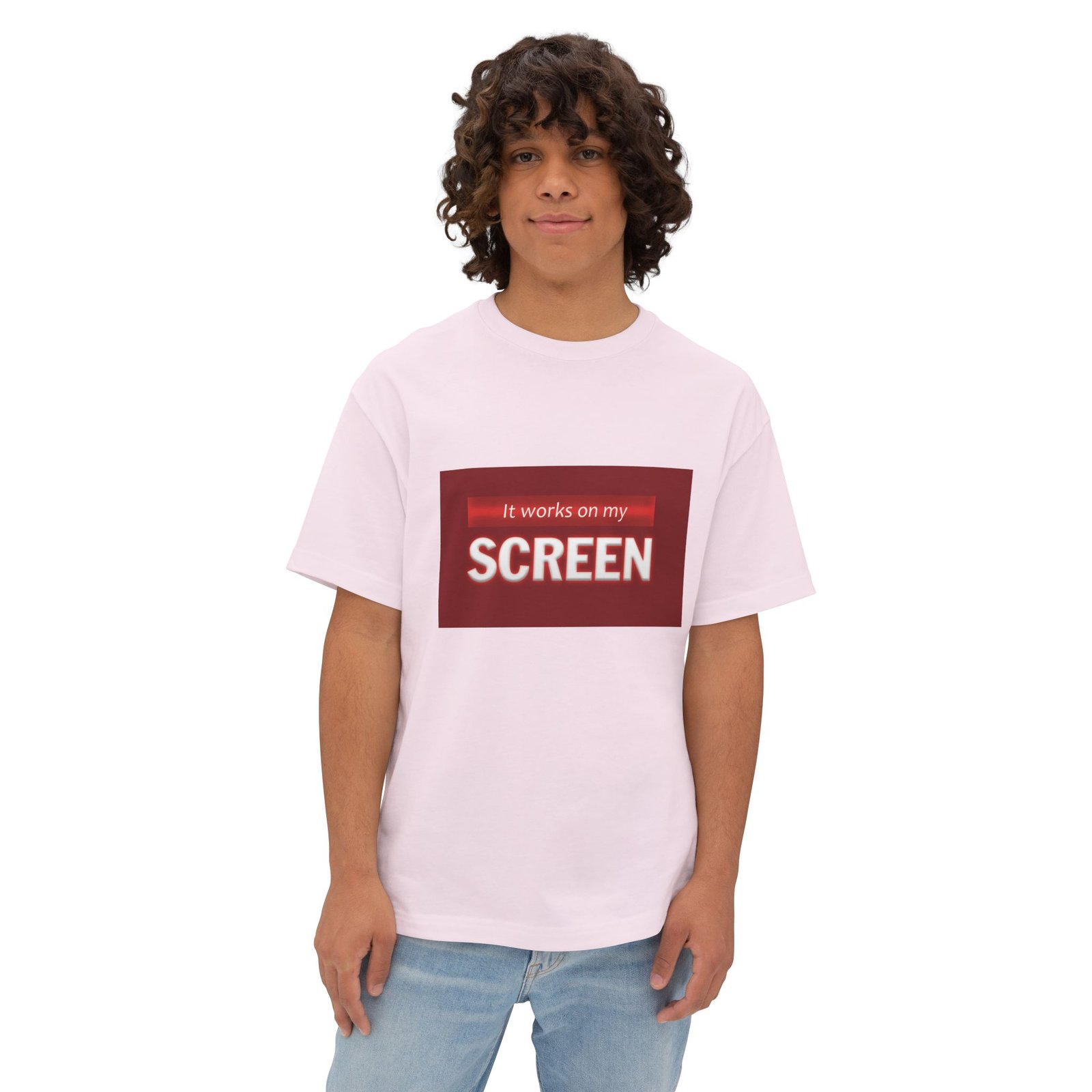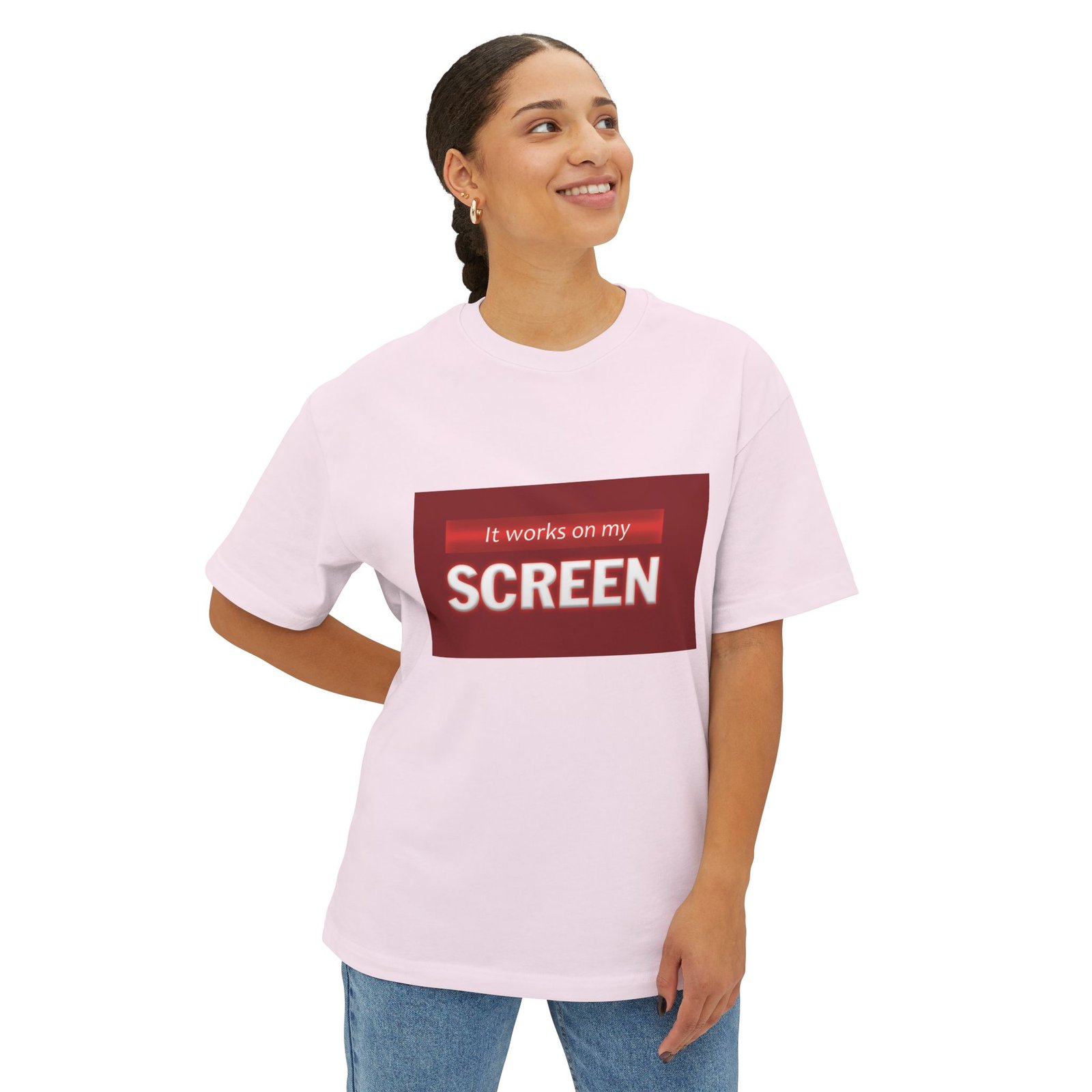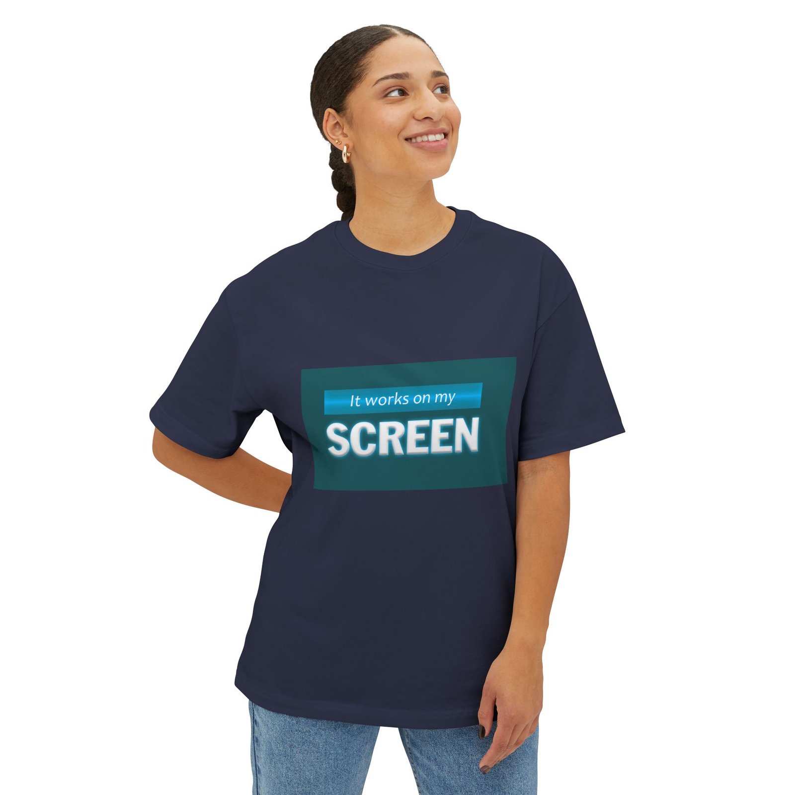 Soft, roomy, and quietly humorous — this boxy tee carries a laid-back attitude with a green-accented graphic that reads “It works on my SCREEN.” It drapes with dropped shoulders and a relaxed silhouette, sitting like a lived-in favorite whether you’re debugging code, testing designs, or scrolling through late-night feeds. The medium-weight cotton feels substantial without being stiff, and the tear-away label keeps the collar itch-free. Wear it with loose jeans, under an open flannel, or layered beneath a zip hoodie for a casual, confident look that speaks the language of makers, devs, and screen-first creatives.