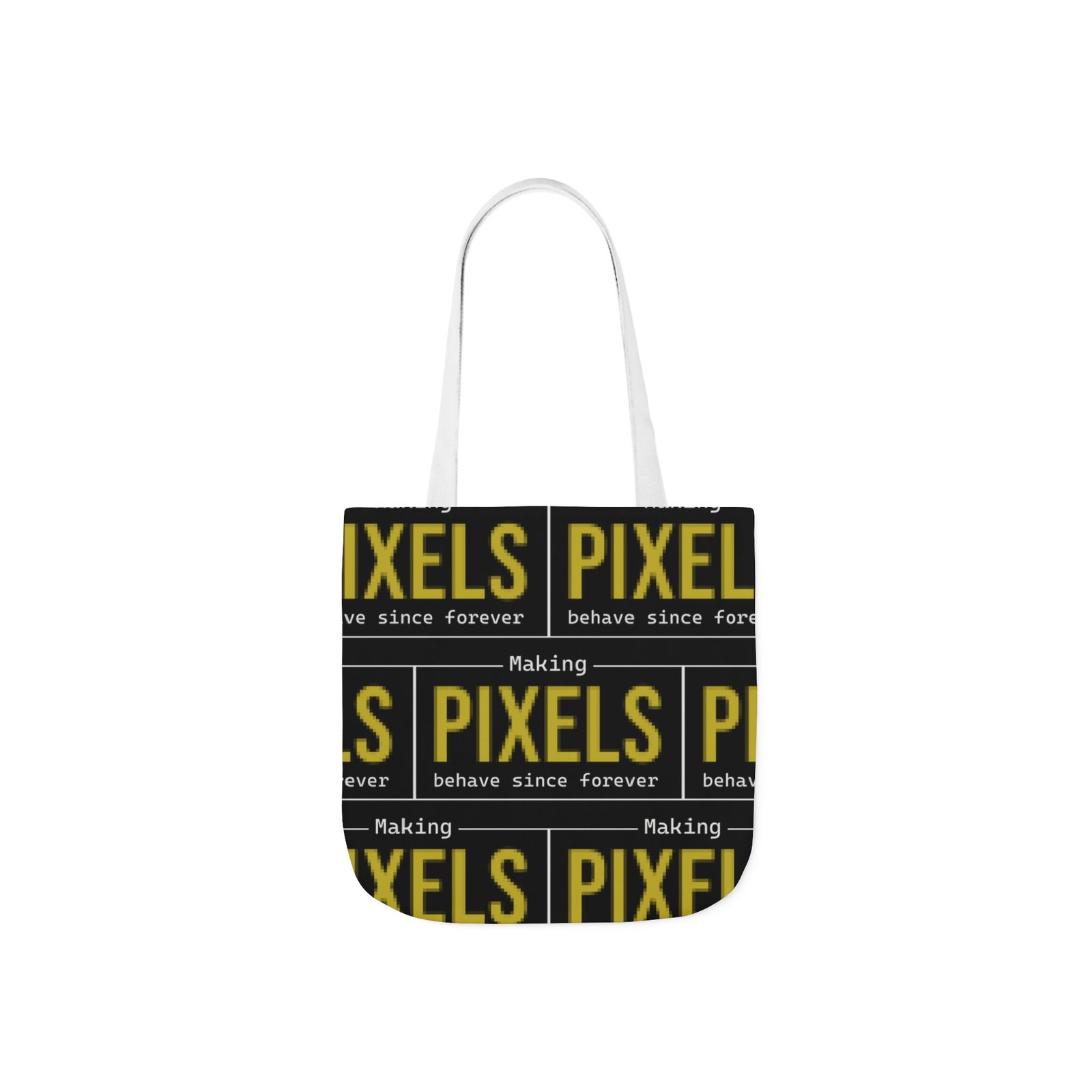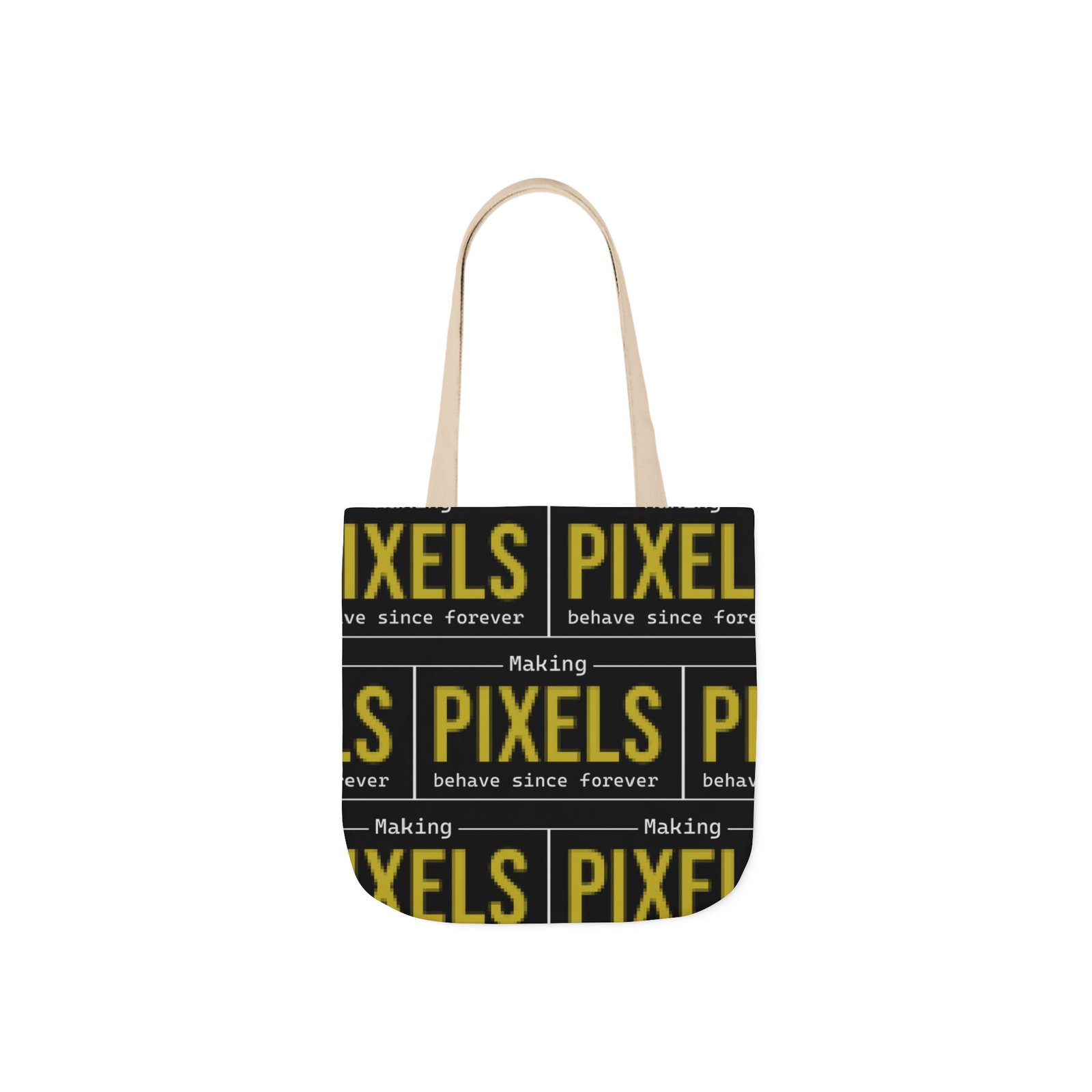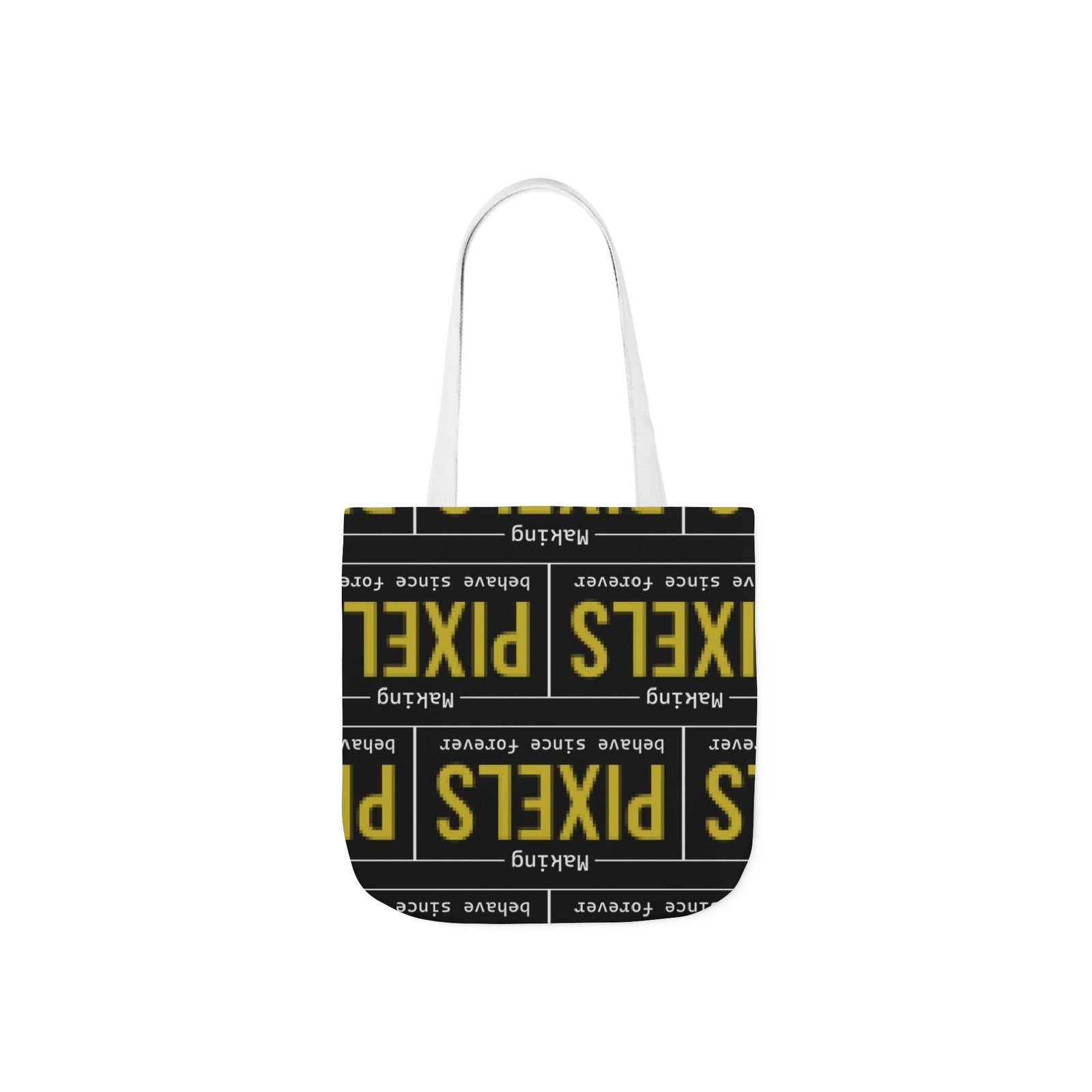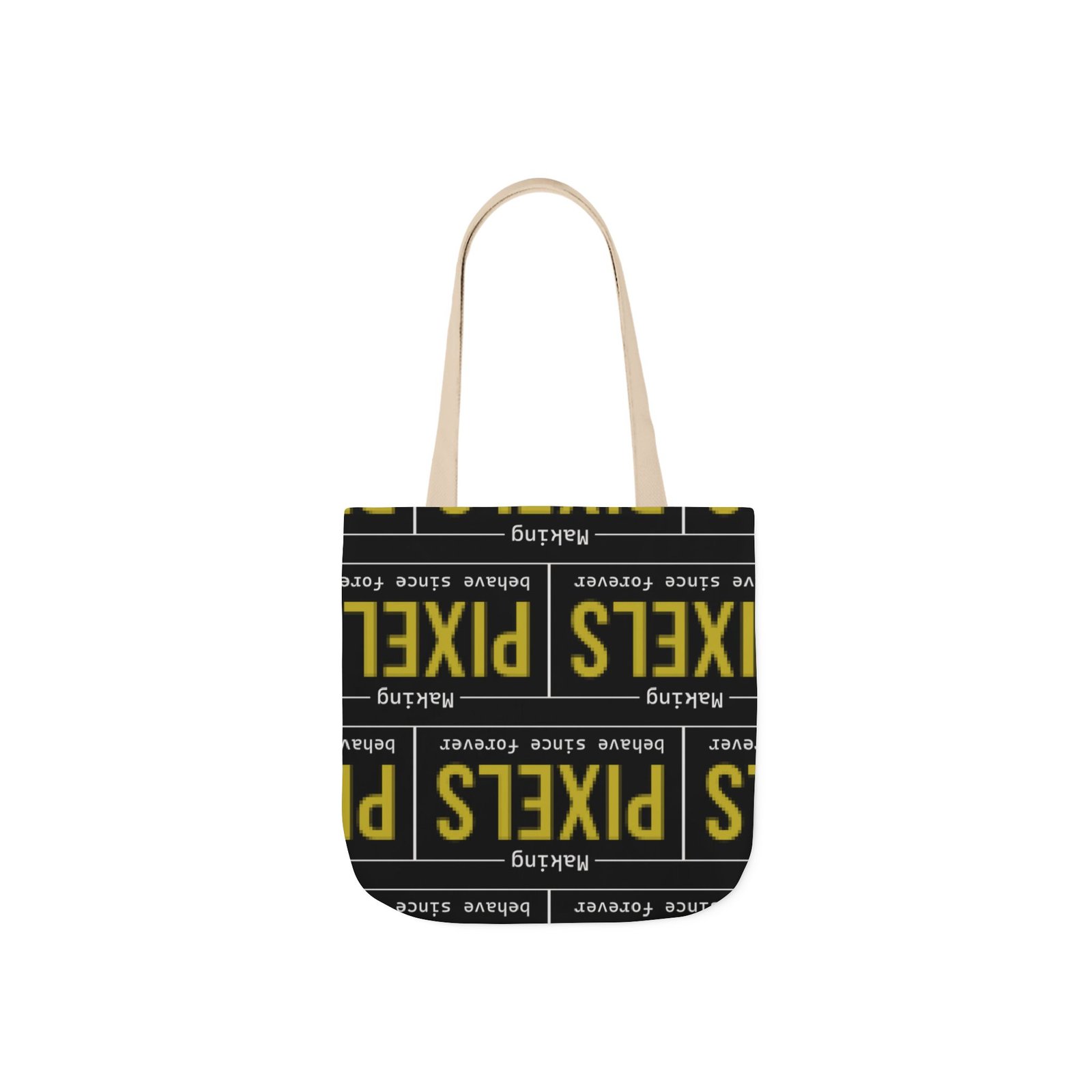This canvas tote brings bold, graphic energy to everyday carry. The all-over print repeats a high-contrast yellow-and-black “PIXELS” motif that feels like a cheeky nod to retro signage and digital culture. Boxed corners give the bag structure and extra room for notebooks, a water bottle, or market finds, while the black interior hides wear and keeps the look clean. Lightweight but sturdy polyester canvas and a foamed lining make the surface pleasantly soft to the touch. Choose from five strap colors to add a personal accent—neutral straps keep the focus on the print, while brighter straps turn the whole thing into a statement. It’s the sort of tote someone who loves bold typography, pixel art, or vintage digital aesthetics will reach for again and again, whether grabbing coffee, heading to class, or carrying projects between studios.