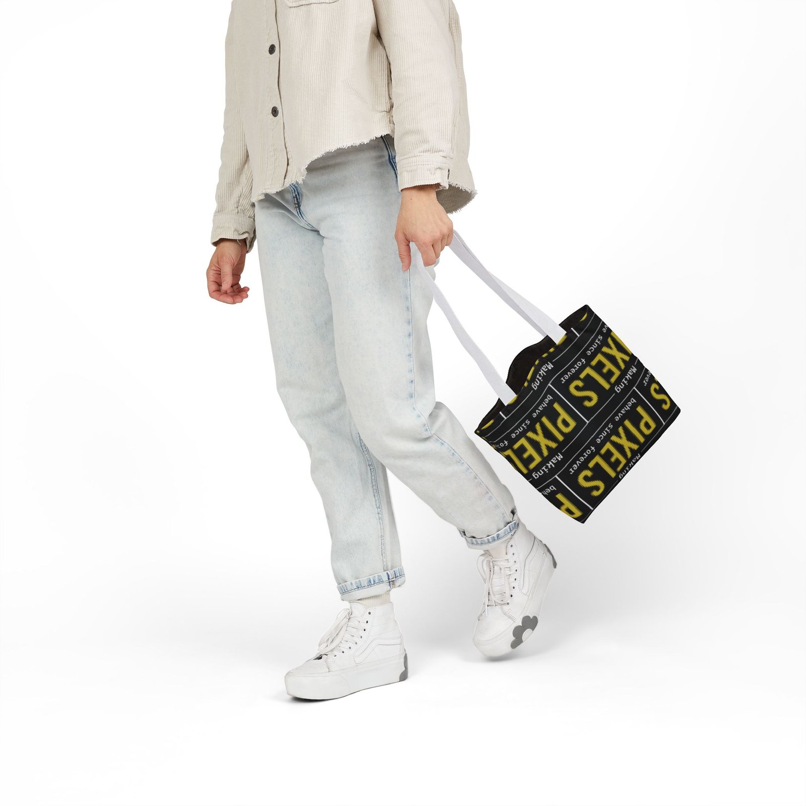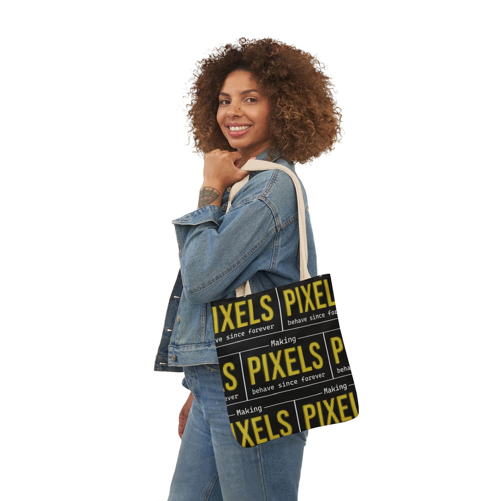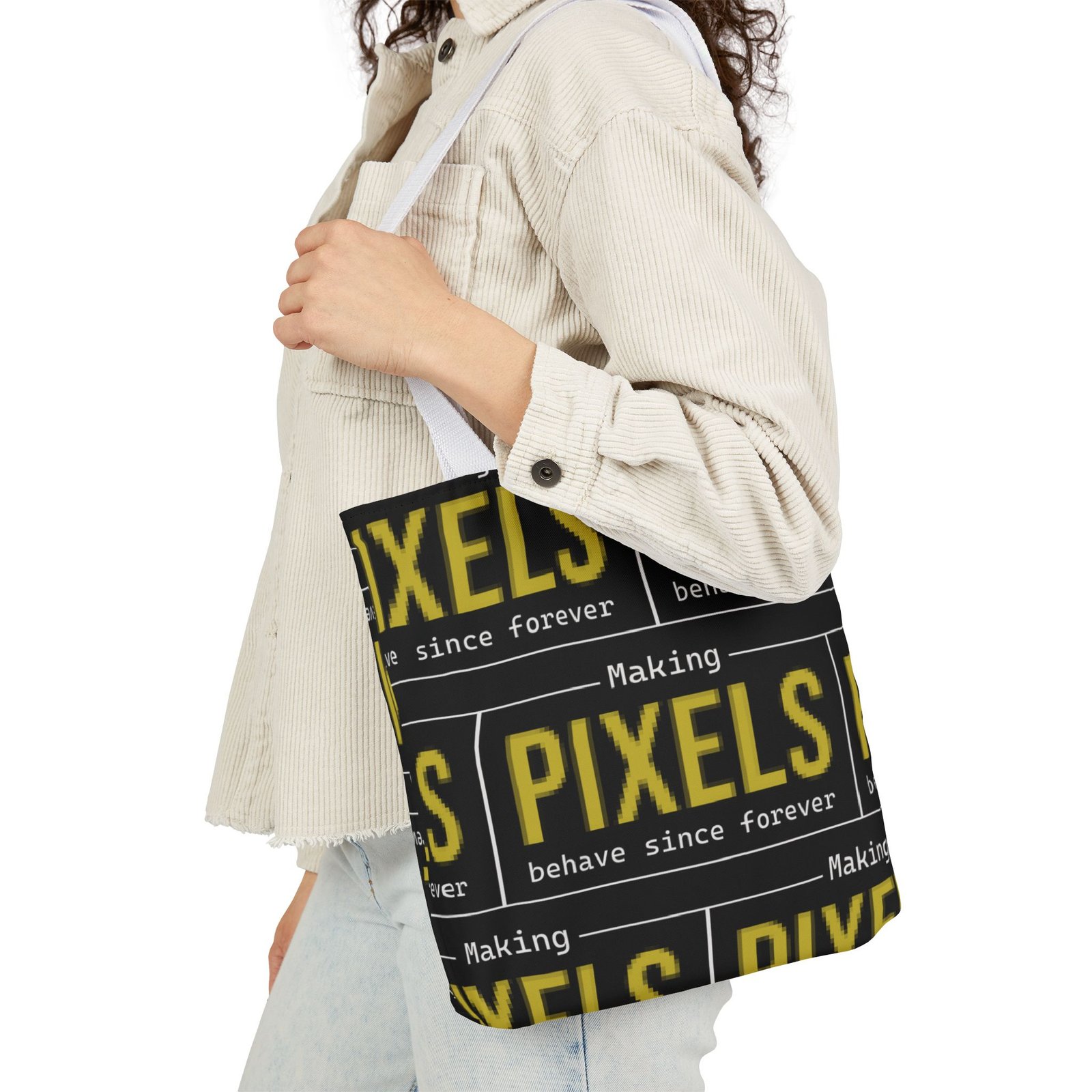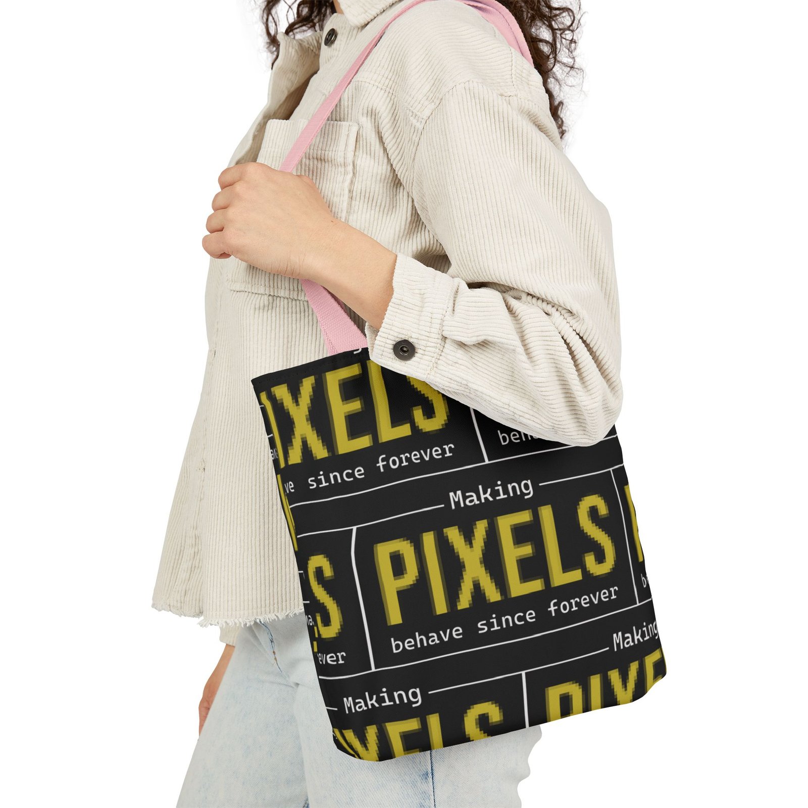 This canvas tote brings bold, graphic energy to everyday carry. The all-over print repeats a high-contrast yellow-and-black “PIXELS” motif that feels like a cheeky nod to retro signage and digital culture. Boxed corners give the bag structure and extra room for notebooks, a water bottle, or market finds, while the black interior hides wear and keeps the look clean. Lightweight but sturdy polyester canvas and a foamed lining make the surface pleasantly soft to the touch. Choose from five strap colors to add a personal accent—neutral straps keep the focus on the print, while brighter straps turn the whole thing into a statement. It’s the sort of tote someone who loves bold typography, pixel art, or vintage digital aesthetics will reach for again and again, whether grabbing coffee, heading to class, or carrying projects between studios.