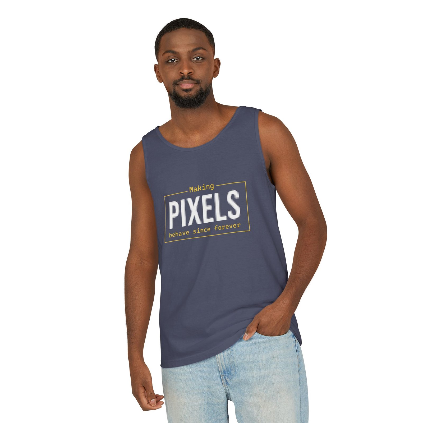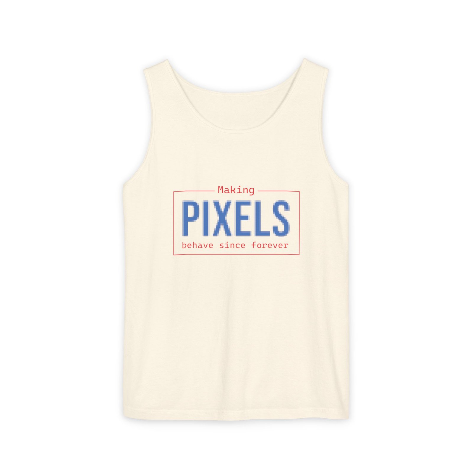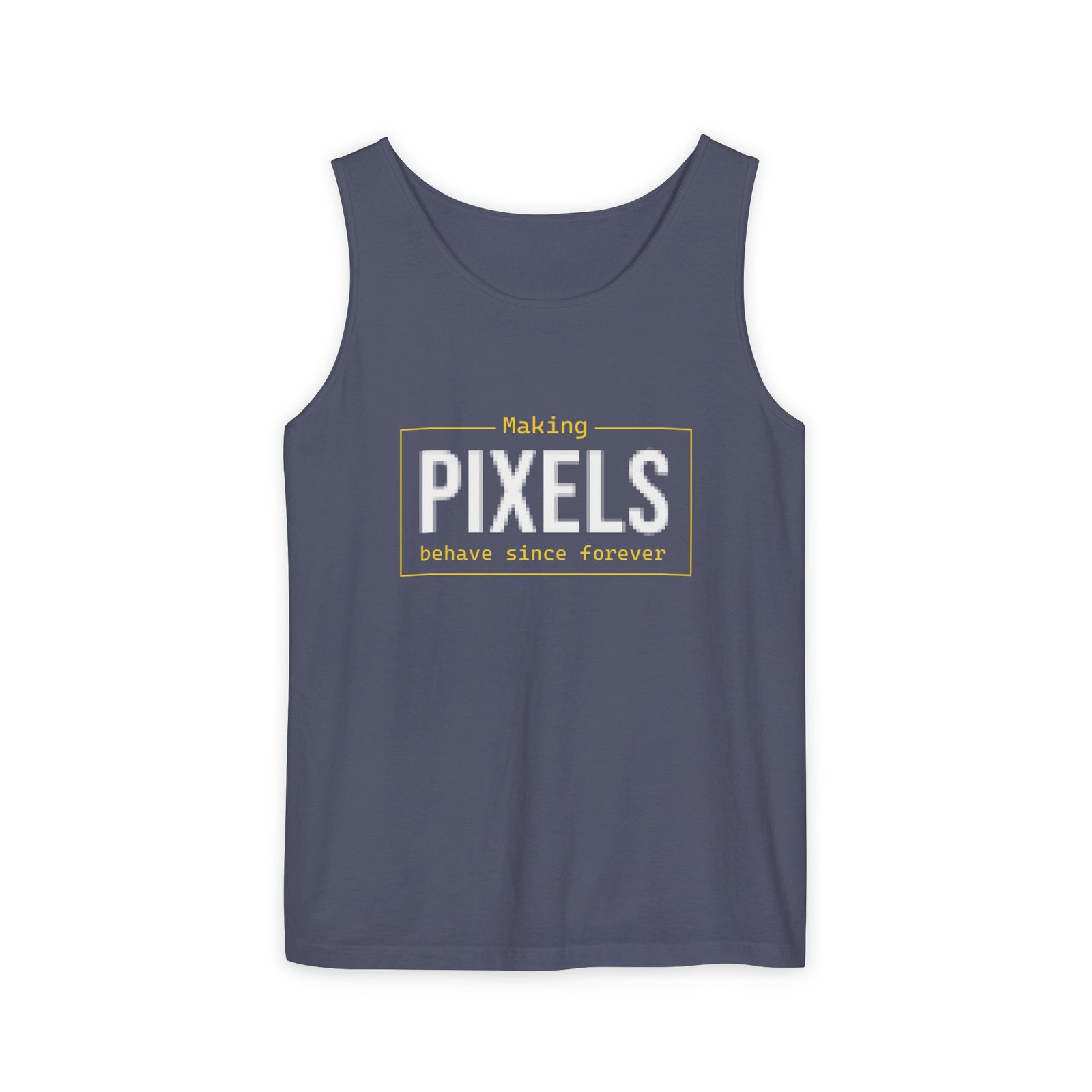 Lightweight, garment-dyed tank made from soft ringspun cotton with a relaxed cut and a clean, tech-inspired design that reads “PIXELS” in bold type with subtle supporting text. The tubular knit and self-fabric binding create a smooth, seam-free feel at the sides and armholes. Wear it to coding sprints, meetups, or warm-weather side projects — it layers easily under a hoodie or stands alone when the sun’s out. The washed-in color and medium-weight fabric give it a lived-in softness that grows more comfortable with every wash.