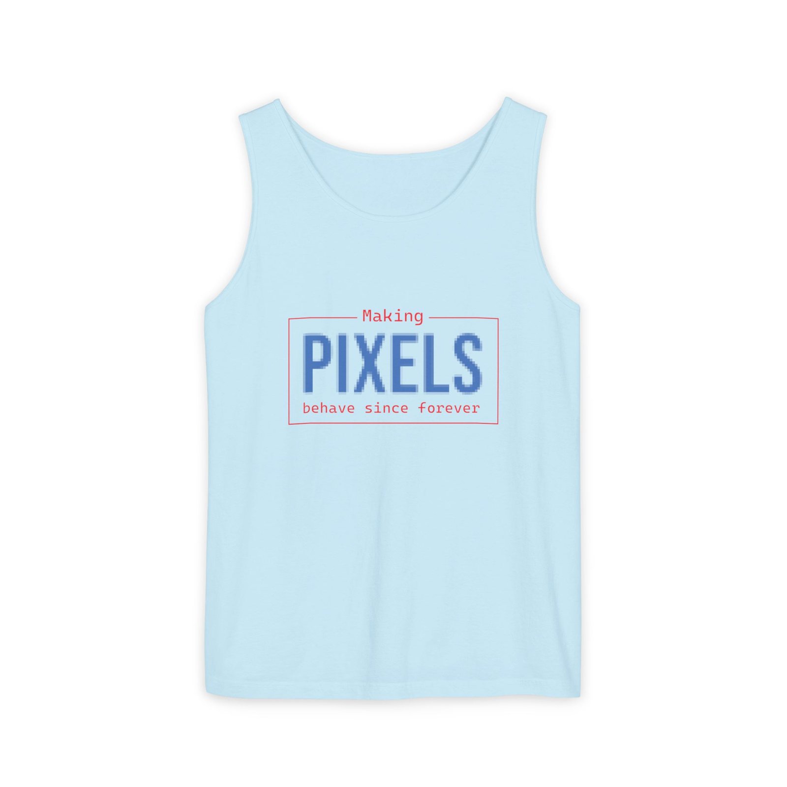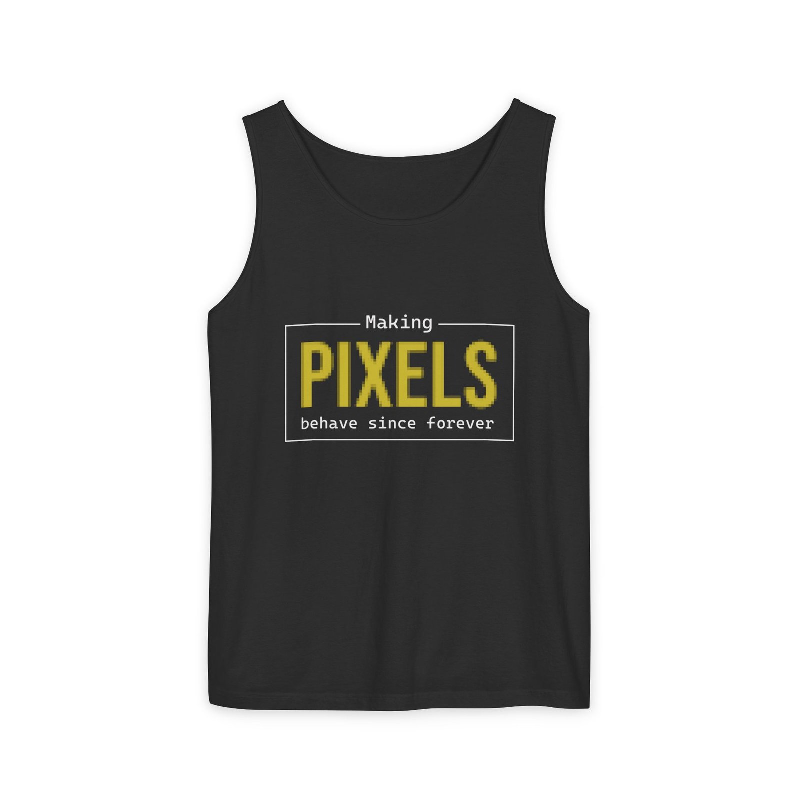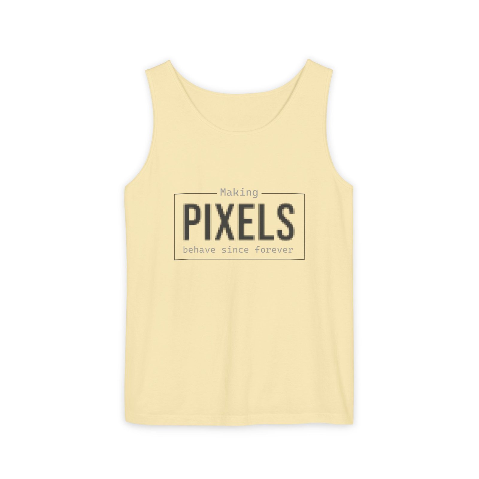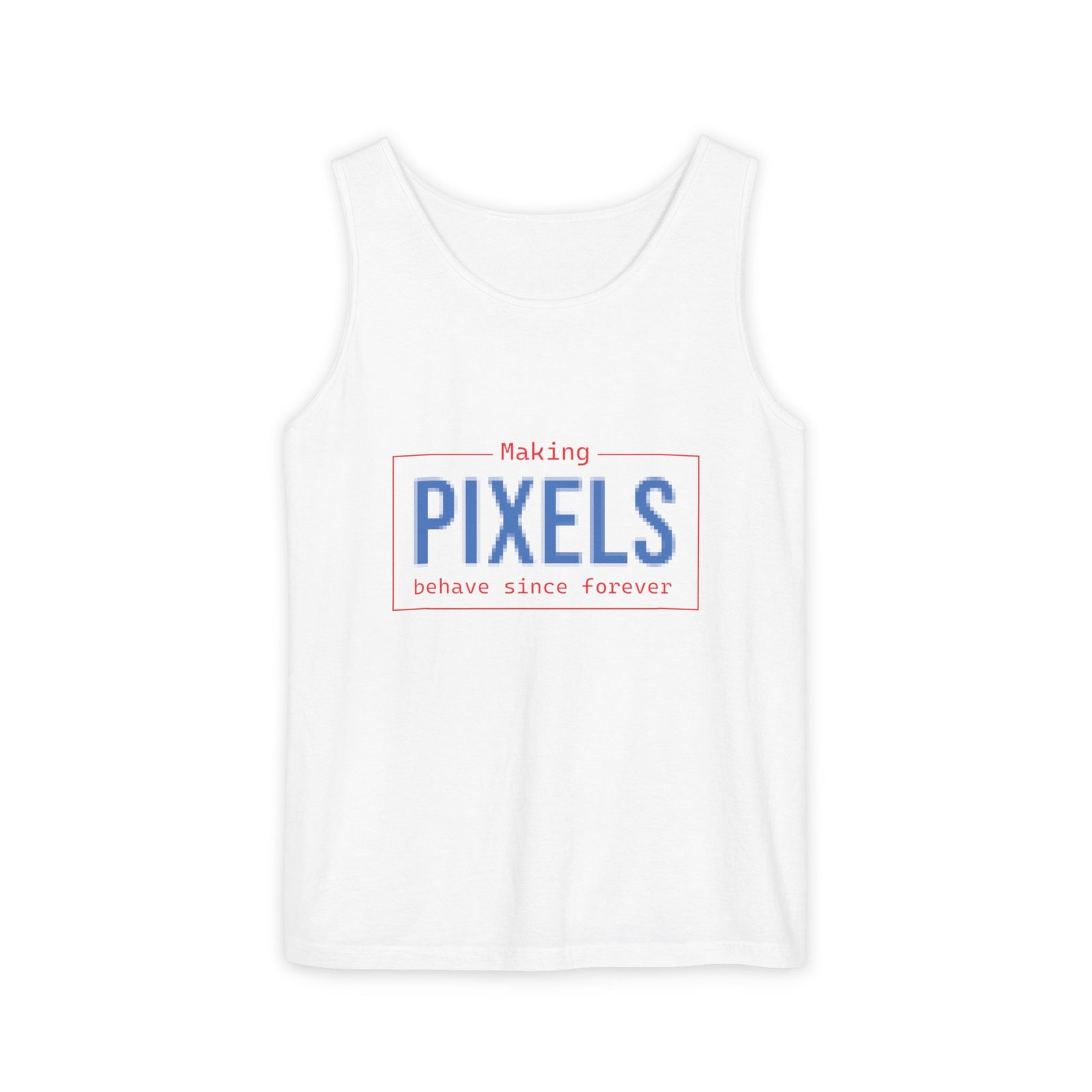 Lightweight, garment-dyed tank made from soft ringspun cotton with a relaxed cut and a clean, tech-inspired design that reads “PIXELS” in bold type with subtle supporting text. The tubular knit and self-fabric binding create a smooth, seam-free feel at the sides and armholes. Wear it to coding sprints, meetups, or warm-weather side projects — it layers easily under a hoodie or stands alone when the sun’s out. The washed-in color and medium-weight fabric give it a lived-in softness that grows more comfortable with every wash.