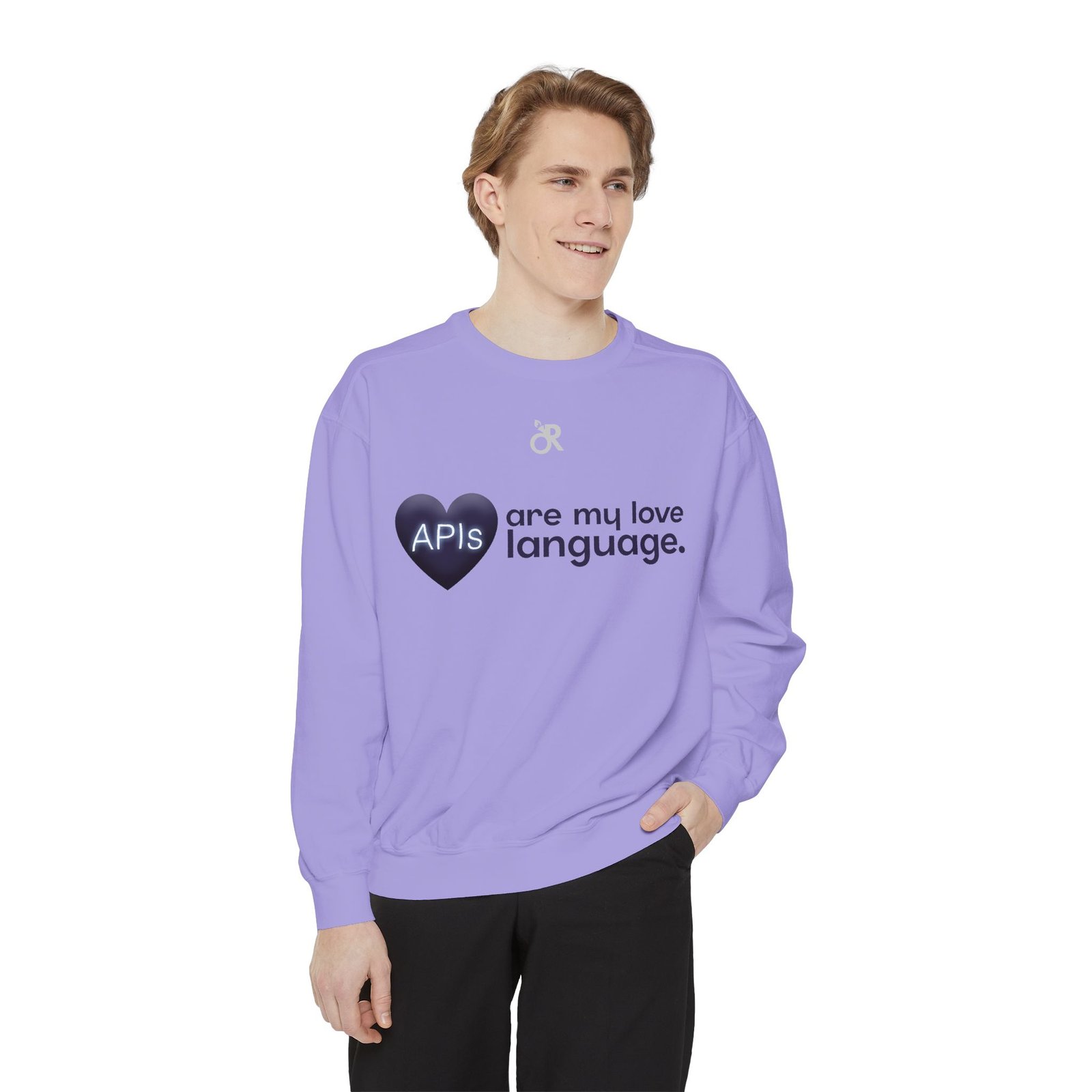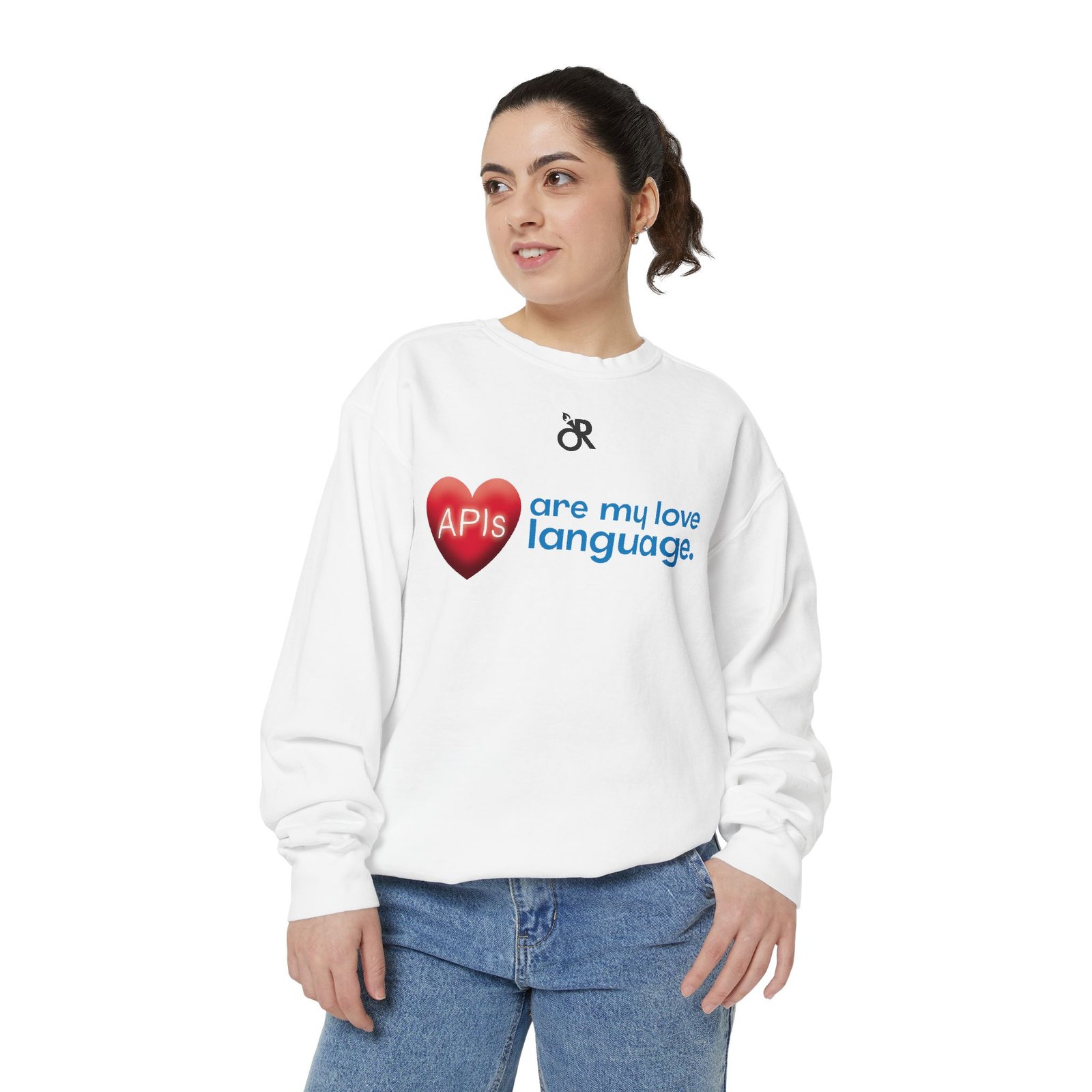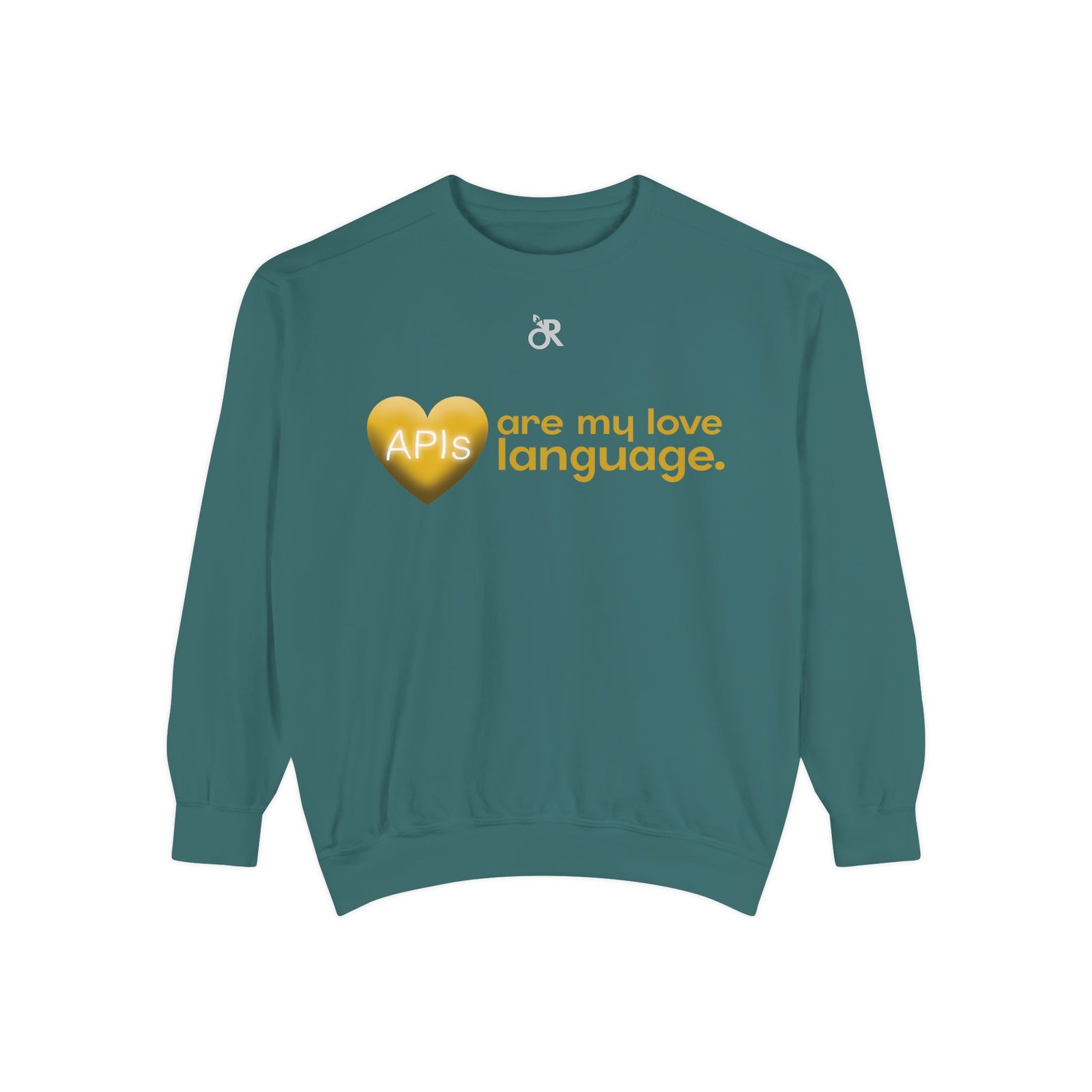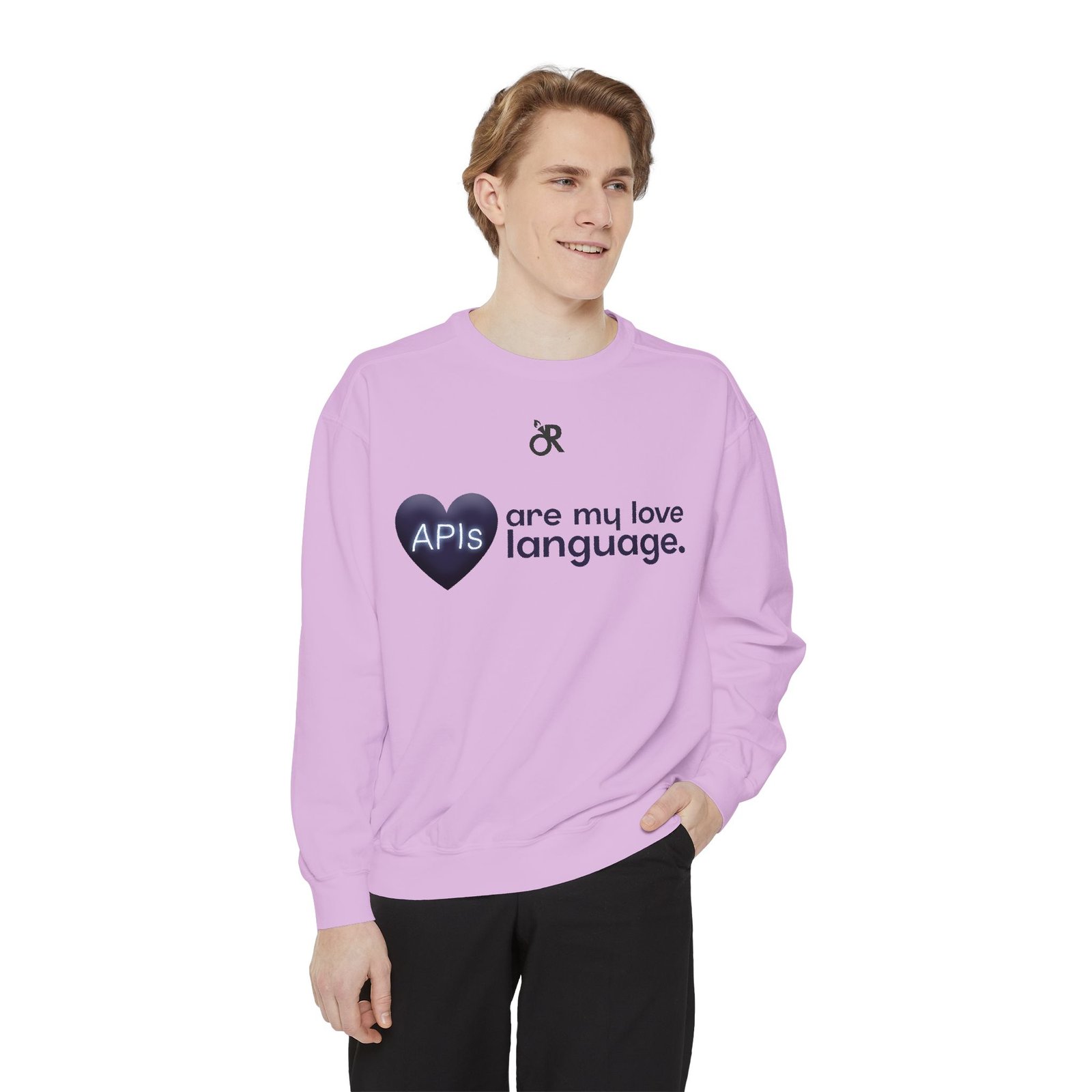 Soft, lived-in warmth meets coder humor. This relaxed-fit sweatshirt carries a subtle, modern print that says what you feel when you’d rather debug than talk: a glossy heart graphic labeled “APIs” beside the phrase “are my love language.” It settles comfortably over hoodies or tees, the medium-heavy fabric giving a cozy weight without feeling bulky. Thoughtful details — ribbed collar, cuffs and hem that stretch and return, a half-moon neck patch, and a sewn-in twill label — keep it feeling neat after wear. The ring-spun cotton blend is smooth and soft against skin and holds printed or embroidered artwork cleanly. OEKO-TEX low-impact dyes and durable construction make it a dependable piece for late-night deploys, conference meetups, or casual office days.