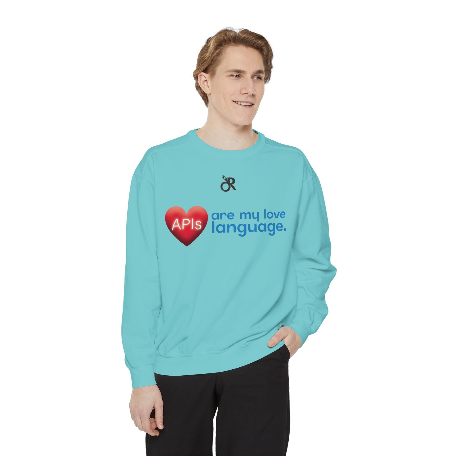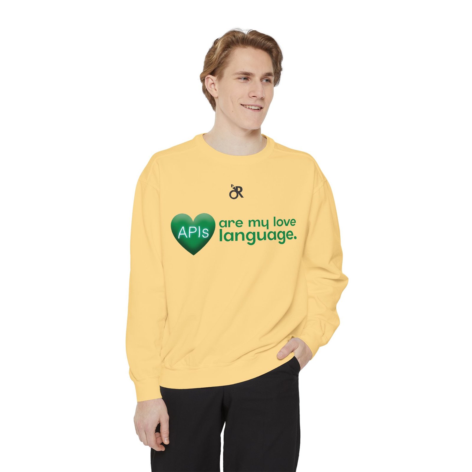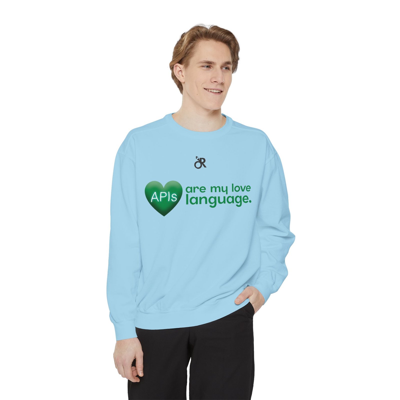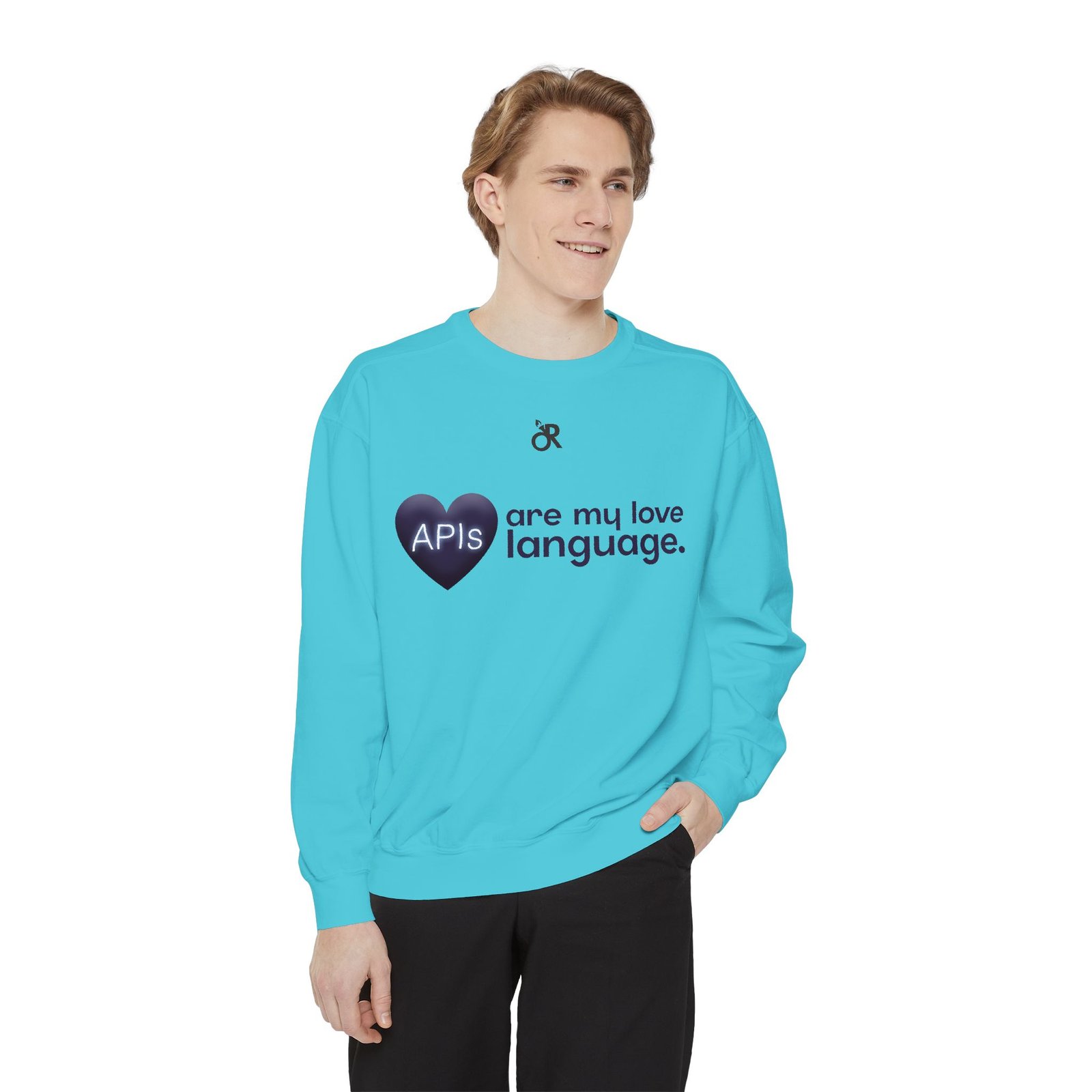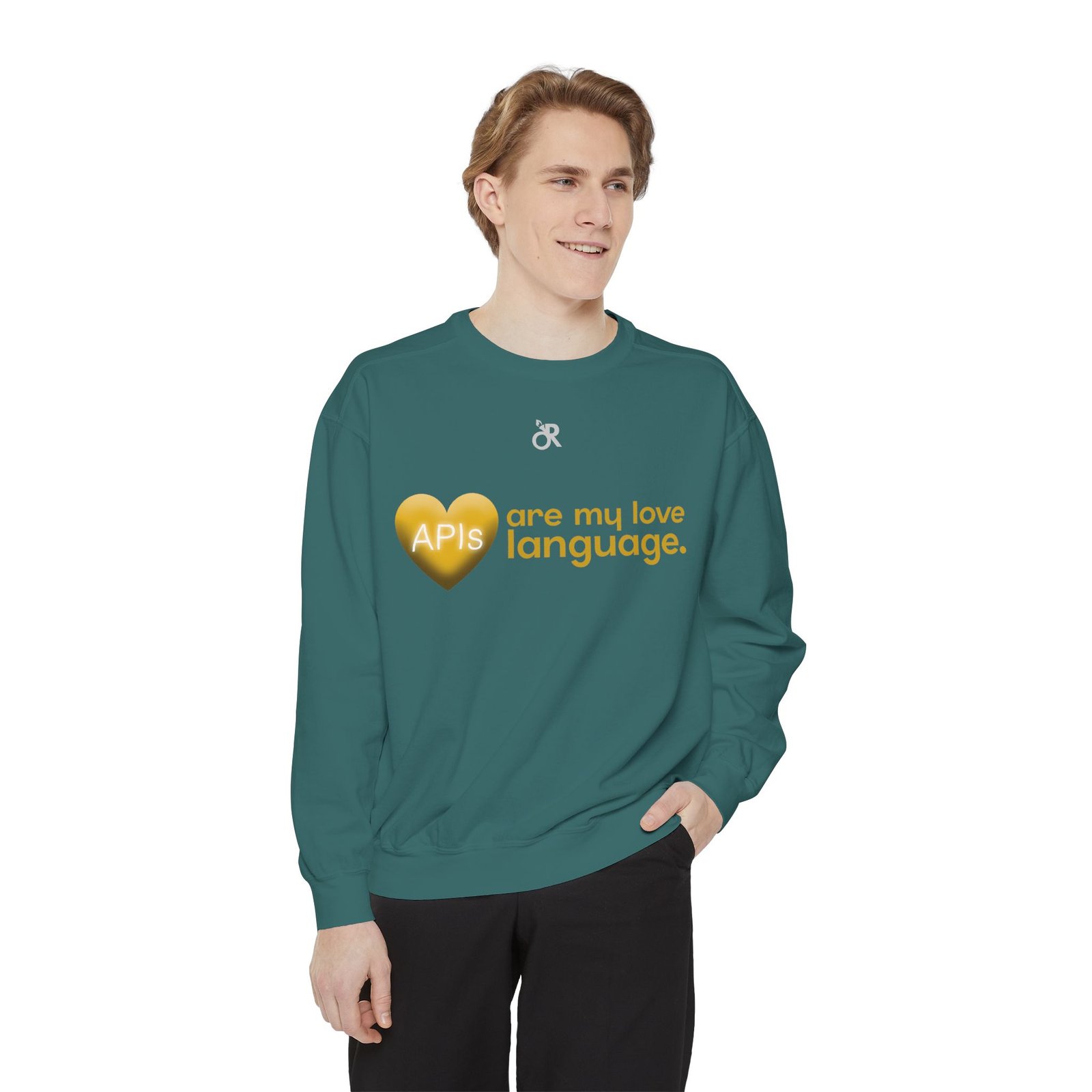 Soft, lived-in warmth meets coder humor. This relaxed-fit sweatshirt carries a subtle, modern print that says what you feel when you’d rather debug than talk: a glossy heart graphic labeled “APIs” beside the phrase “are my love language.” It settles comfortably over hoodies or tees, the medium-heavy fabric giving a cozy weight without feeling bulky. Thoughtful details — ribbed collar, cuffs and hem that stretch and return, a half-moon neck patch, and a sewn-in twill label — keep it feeling neat after wear. The ring-spun cotton blend is smooth and soft against skin and holds printed or embroidered artwork cleanly. OEKO-TEX low-impact dyes and durable construction make it a dependable piece for late-night deploys, conference meetups, or casual office days.