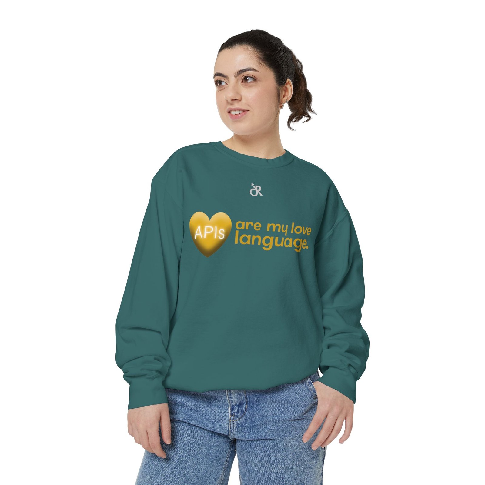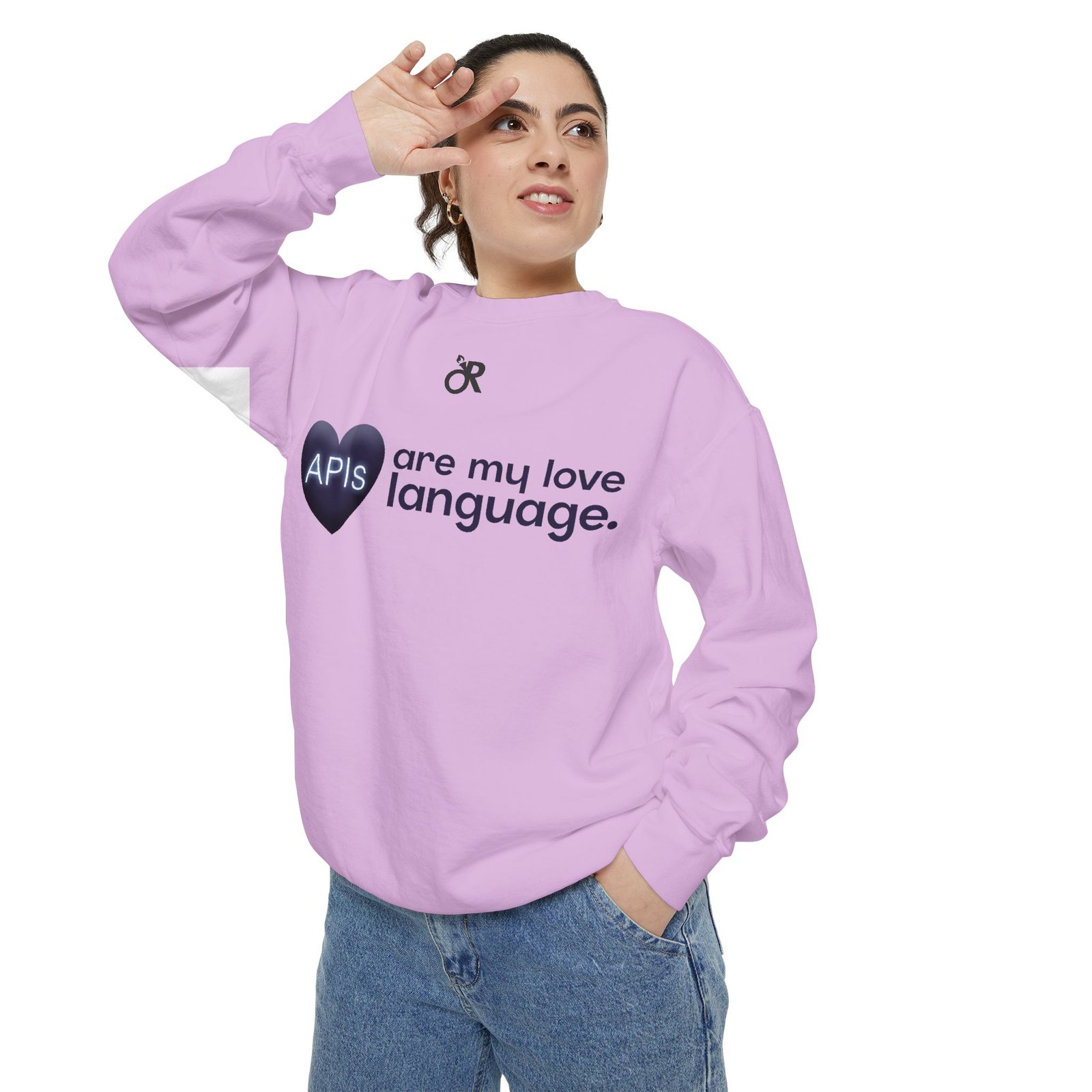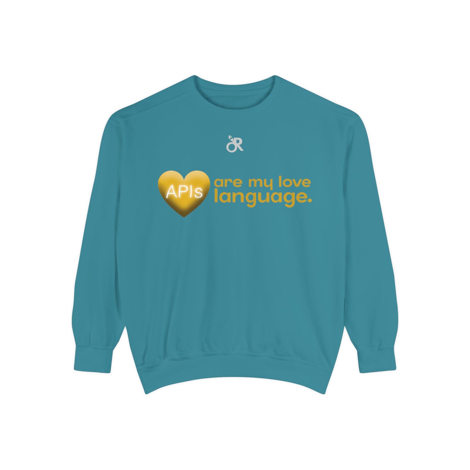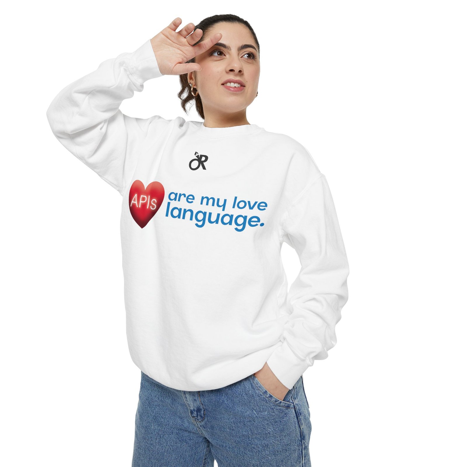 Soft, lived-in warmth meets coder humor. This relaxed-fit sweatshirt carries a subtle, modern print that says what you feel when you’d rather debug than talk: a glossy heart graphic labeled “APIs” beside the phrase “are my love language.” It settles comfortably over hoodies or tees, the medium-heavy fabric giving a cozy weight without feeling bulky. Thoughtful details — ribbed collar, cuffs and hem that stretch and return, a half-moon neck patch, and a sewn-in twill label — keep it feeling neat after wear. The ring-spun cotton blend is smooth and soft against skin and holds printed or embroidered artwork cleanly. OEKO-TEX low-impact dyes and durable construction make it a dependable piece for late-night deploys, conference meetups, or casual office days.