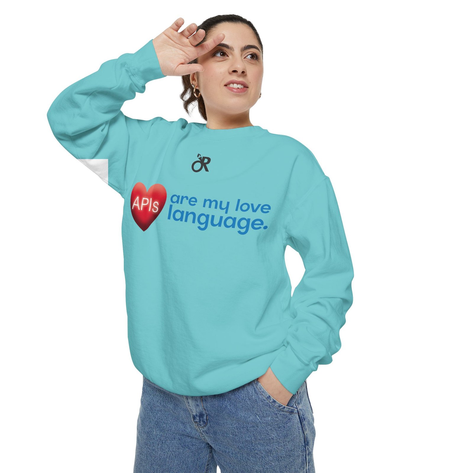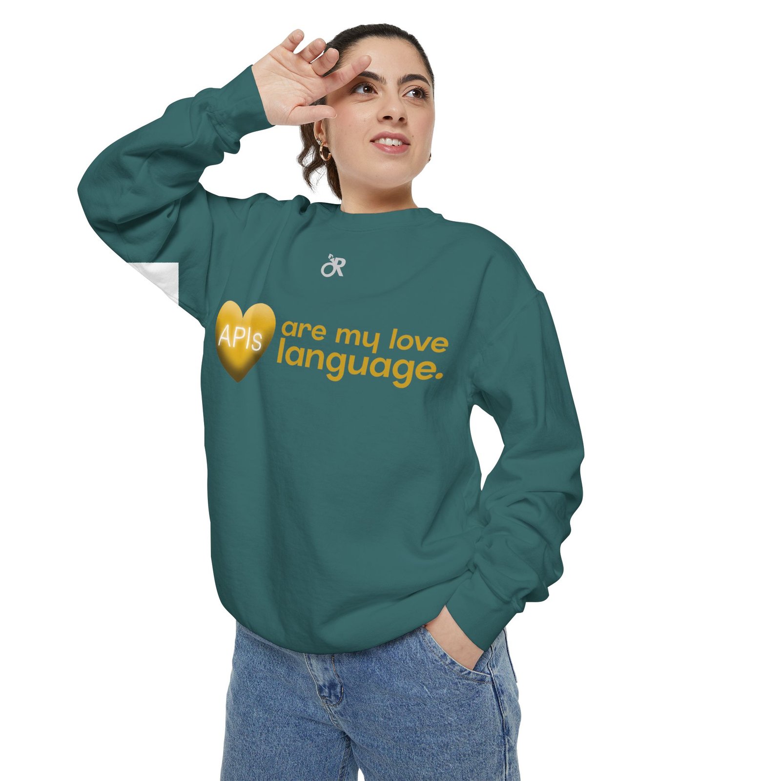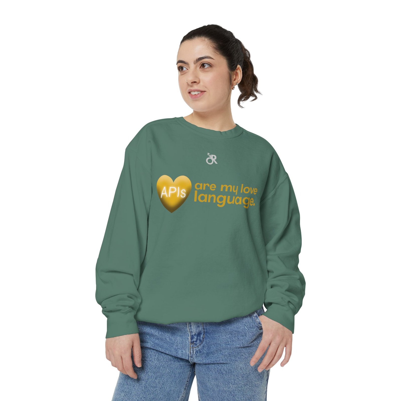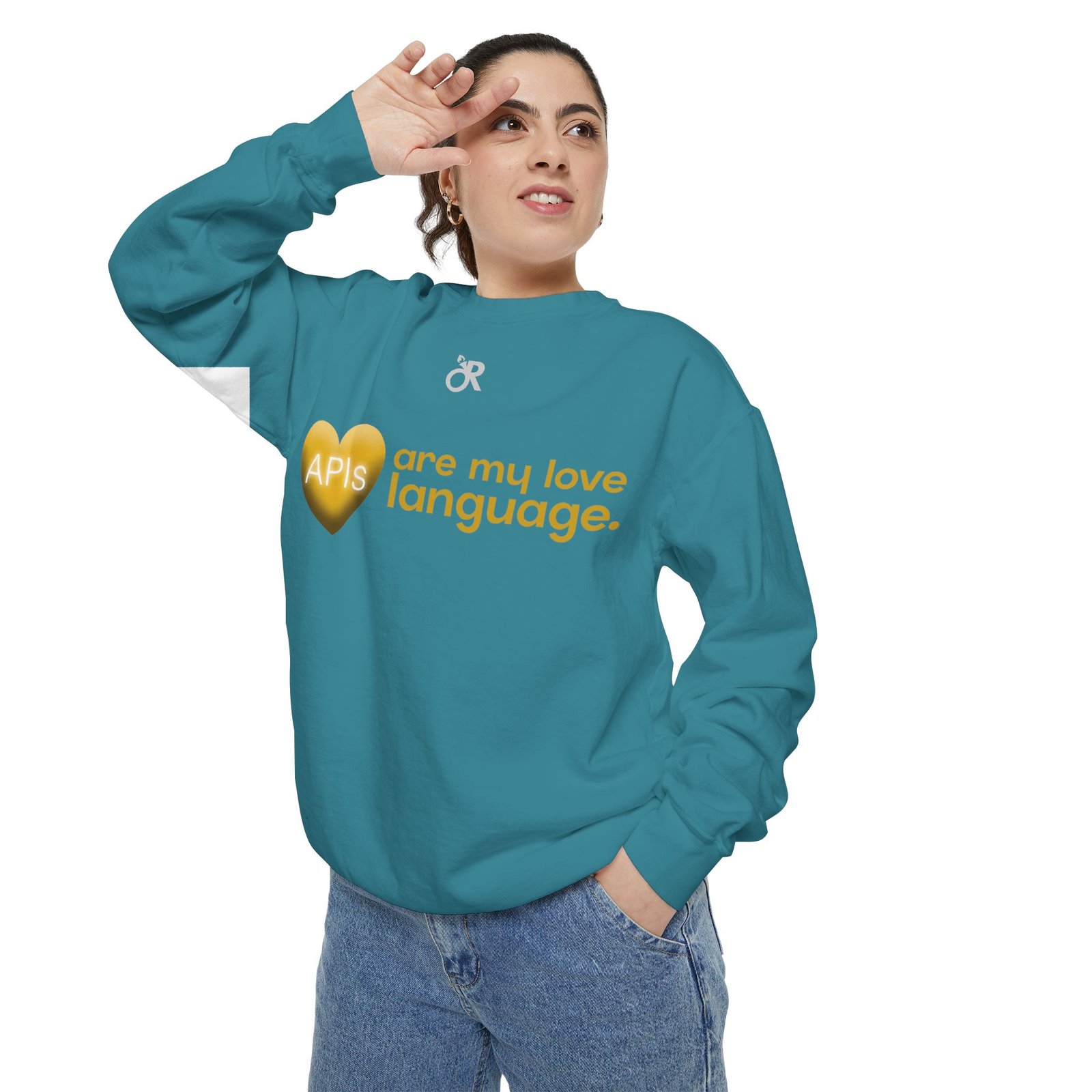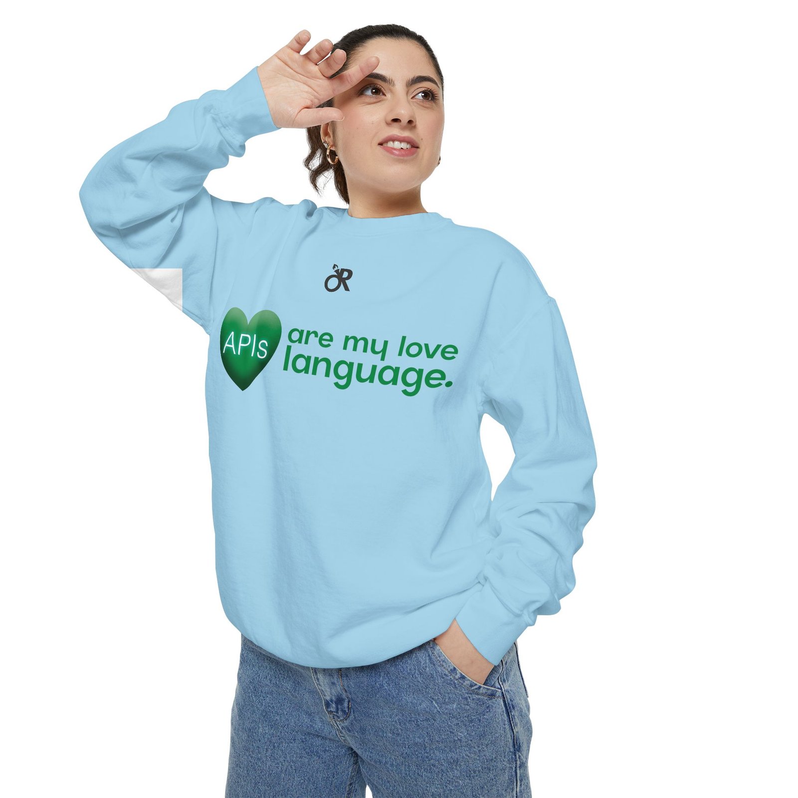 Soft, lived-in warmth meets coder humor. This relaxed-fit sweatshirt carries a subtle, modern print that says what you feel when you’d rather debug than talk: a glossy heart graphic labeled “APIs” beside the phrase “are my love language.” It settles comfortably over hoodies or tees, the medium-heavy fabric giving a cozy weight without feeling bulky. Thoughtful details — ribbed collar, cuffs and hem that stretch and return, a half-moon neck patch, and a sewn-in twill label — keep it feeling neat after wear. The ring-spun cotton blend is smooth and soft against skin and holds printed or embroidered artwork cleanly. OEKO-TEX low-impact dyes and durable construction make it a dependable piece for late-night deploys, conference meetups, or casual office days.
