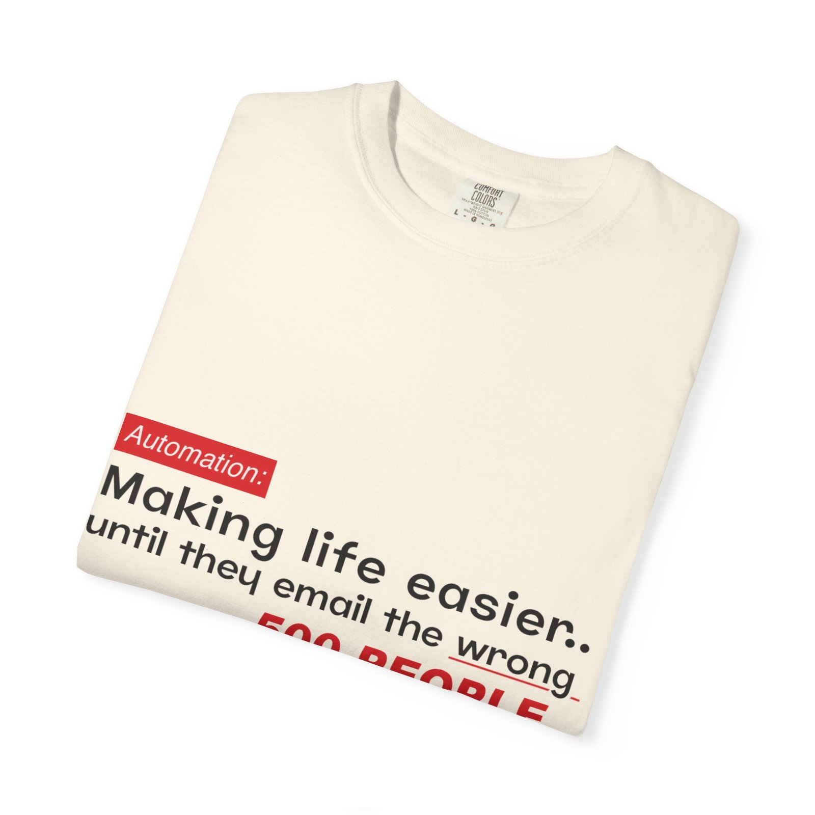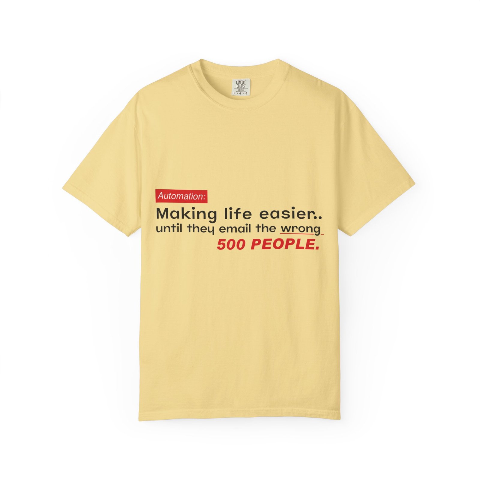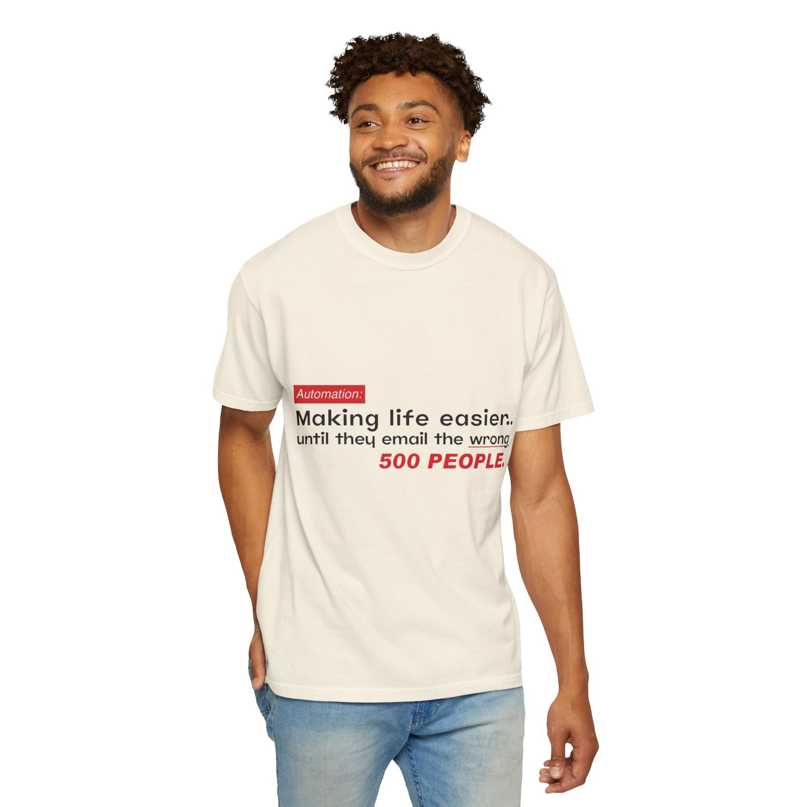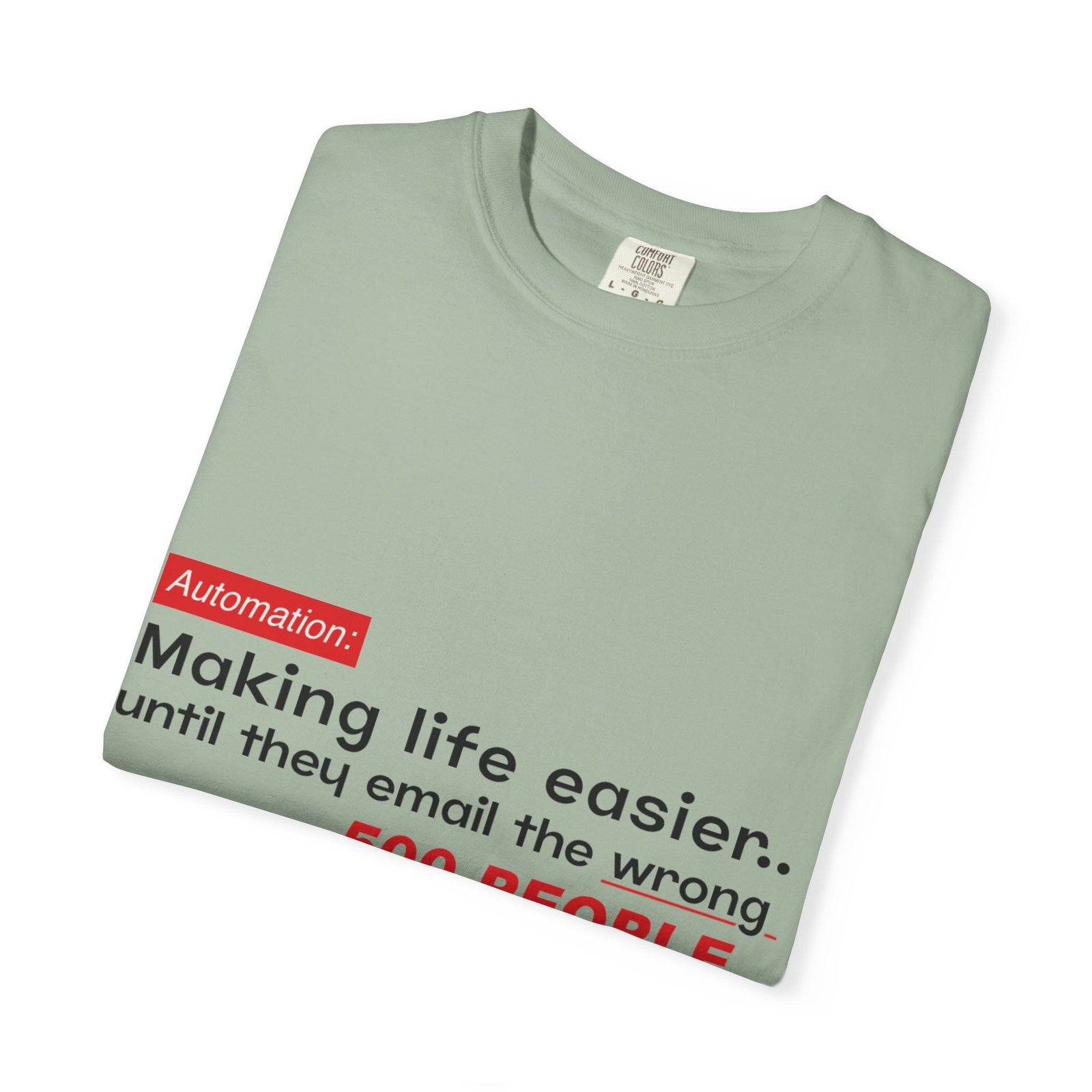 A relaxed, garment-dyed cotton tee that speaks to the quietly defiant: simple, comfortable, and a little bit clever. The soft, washed color and heavyweight, pre-shrunk fabric give this shirt a lived-in feel from day one. A minimalist front print — a small, witty line about automation and the chaos of human error — sits low-key on a clean canvas, so the message reads like an inside joke among coworkers, dev teams, and anyone who builds systems that are supposed to make life easier. Wear it to stand meetings, coffee runs, or late-night debugging sessions; it settles into your rotation and keeps earning compliments for being both comfortable and smartly sarcastic.