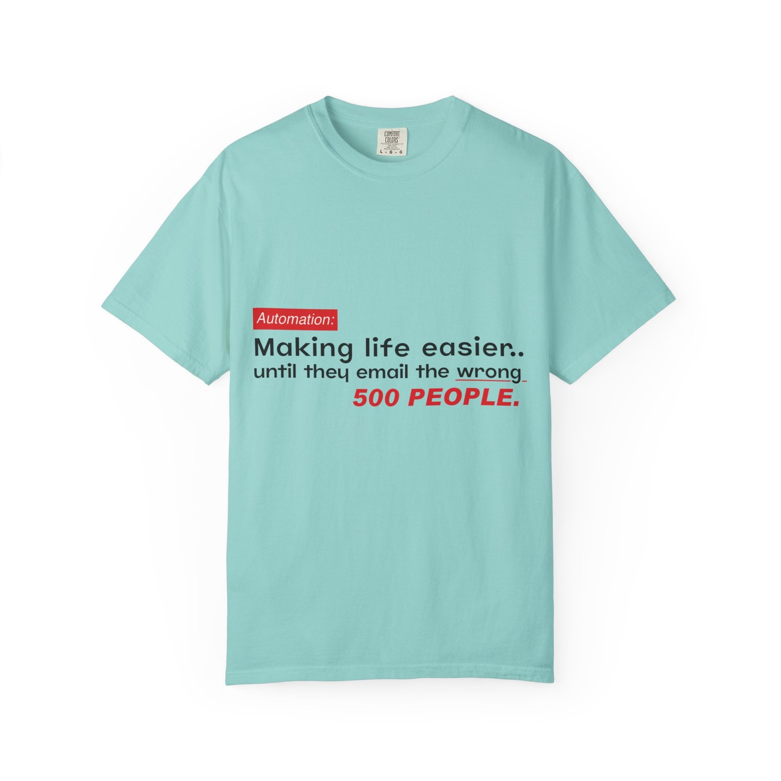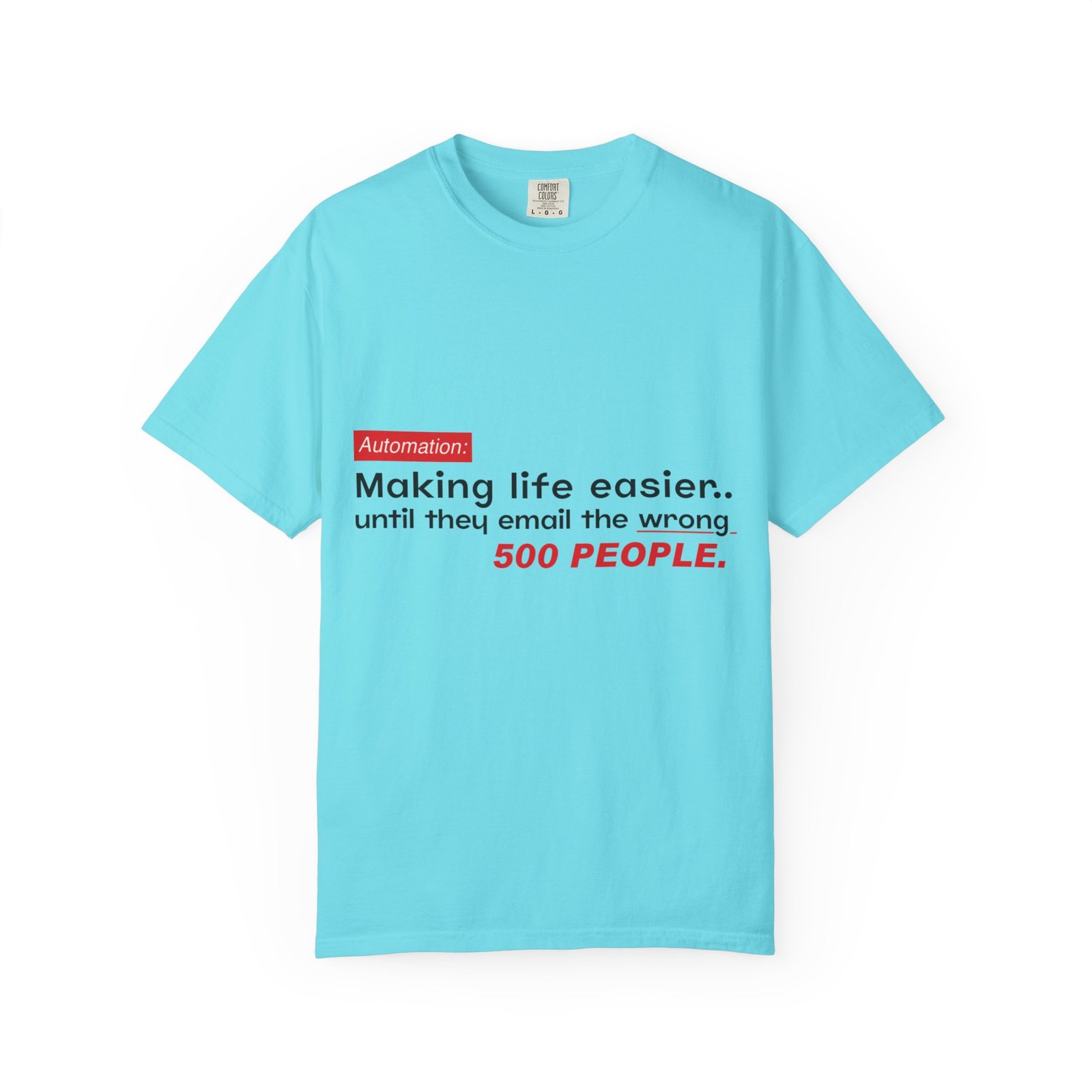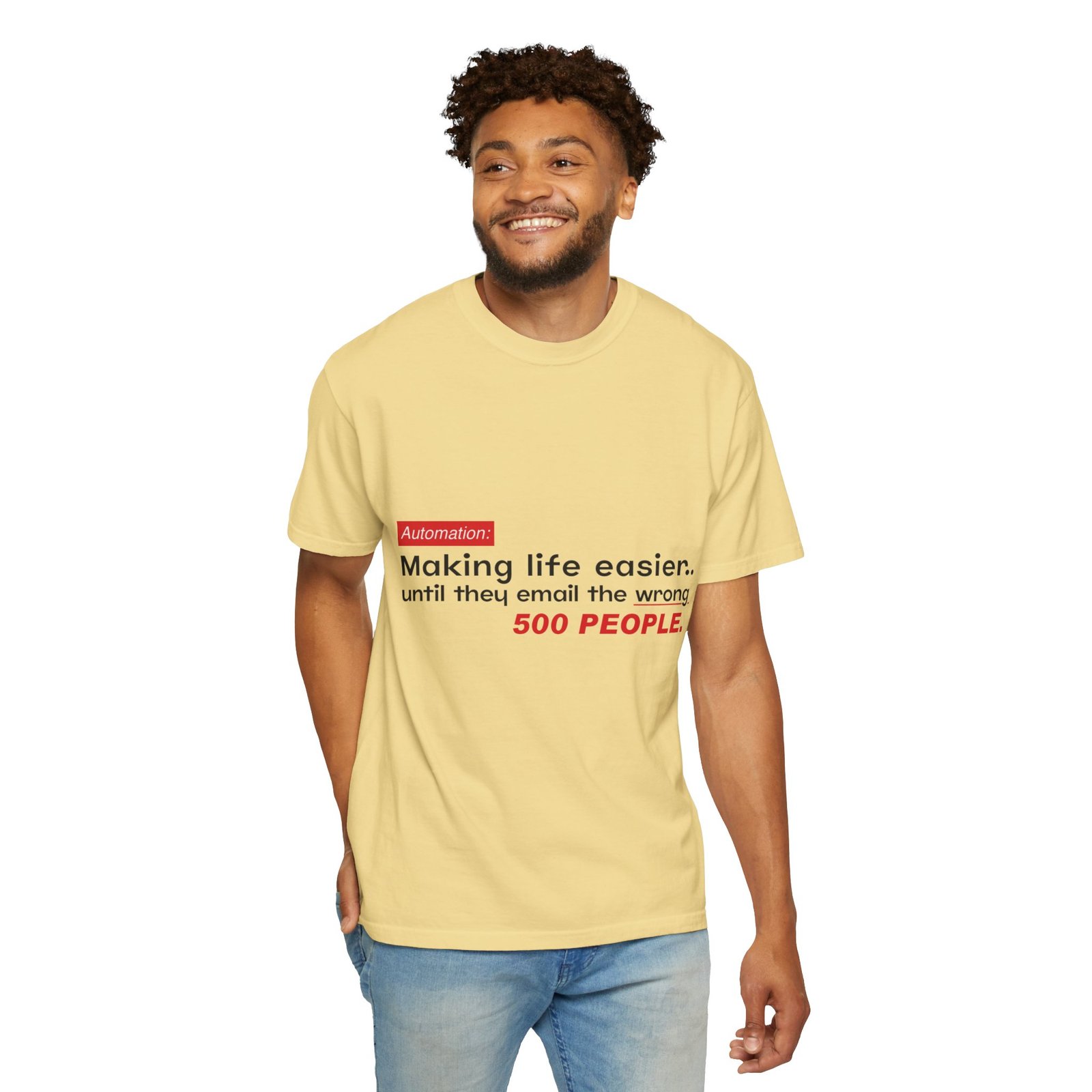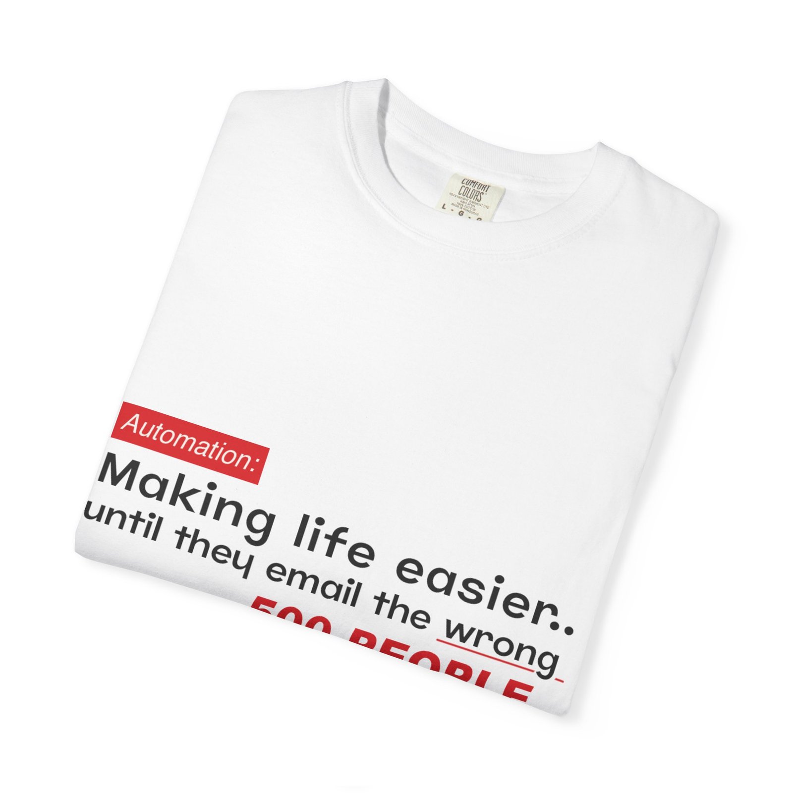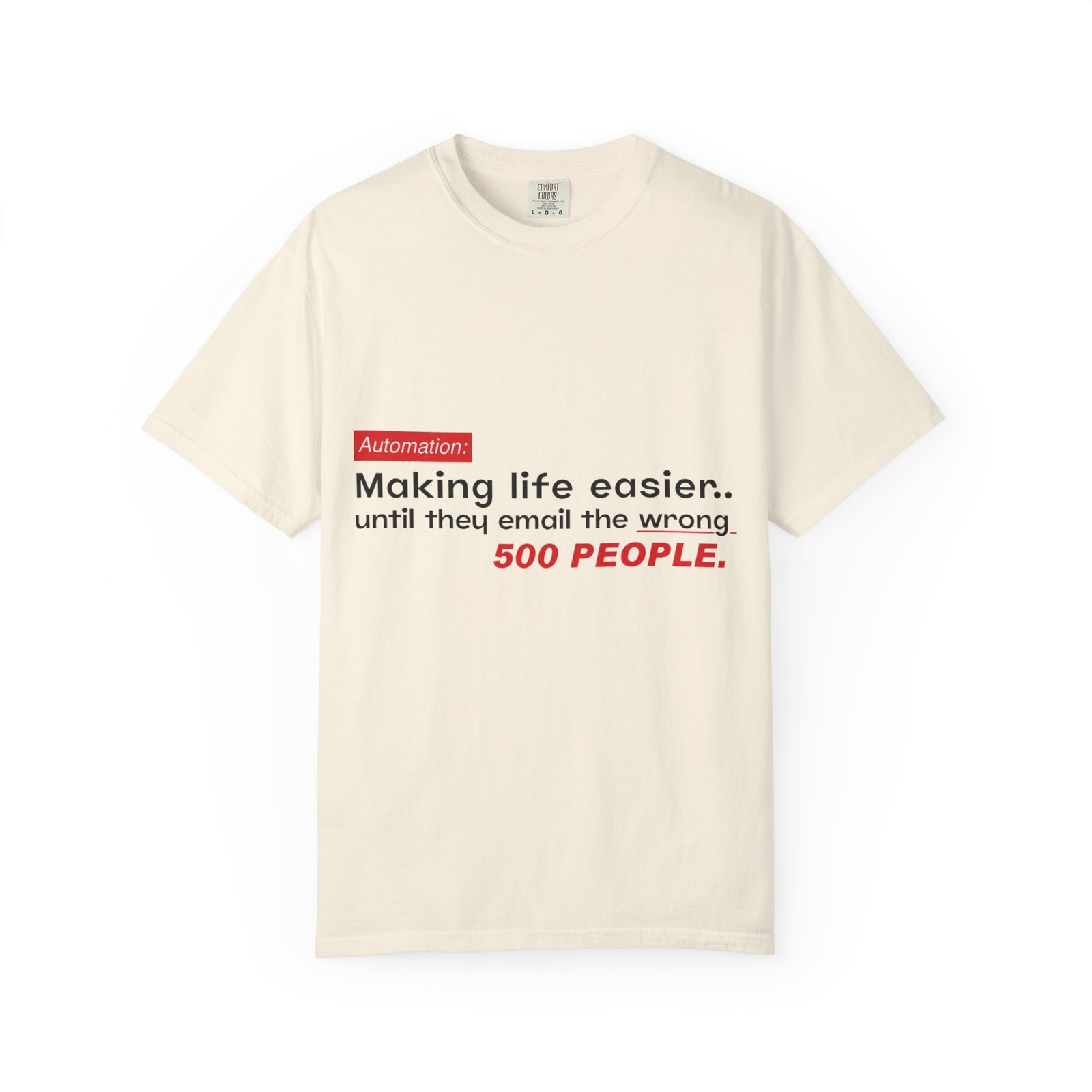 A relaxed, garment-dyed cotton tee that speaks to the quietly defiant: simple, comfortable, and a little bit clever. The soft, washed color and heavyweight, pre-shrunk fabric give this shirt a lived-in feel from day one. A minimalist front print — a small, witty line about automation and the chaos of human error — sits low-key on a clean canvas, so the message reads like an inside joke among coworkers, dev teams, and anyone who builds systems that are supposed to make life easier. Wear it to stand meetings, coffee runs, or late-night debugging sessions; it settles into your rotation and keeps earning compliments for being both comfortable and smartly sarcastic.