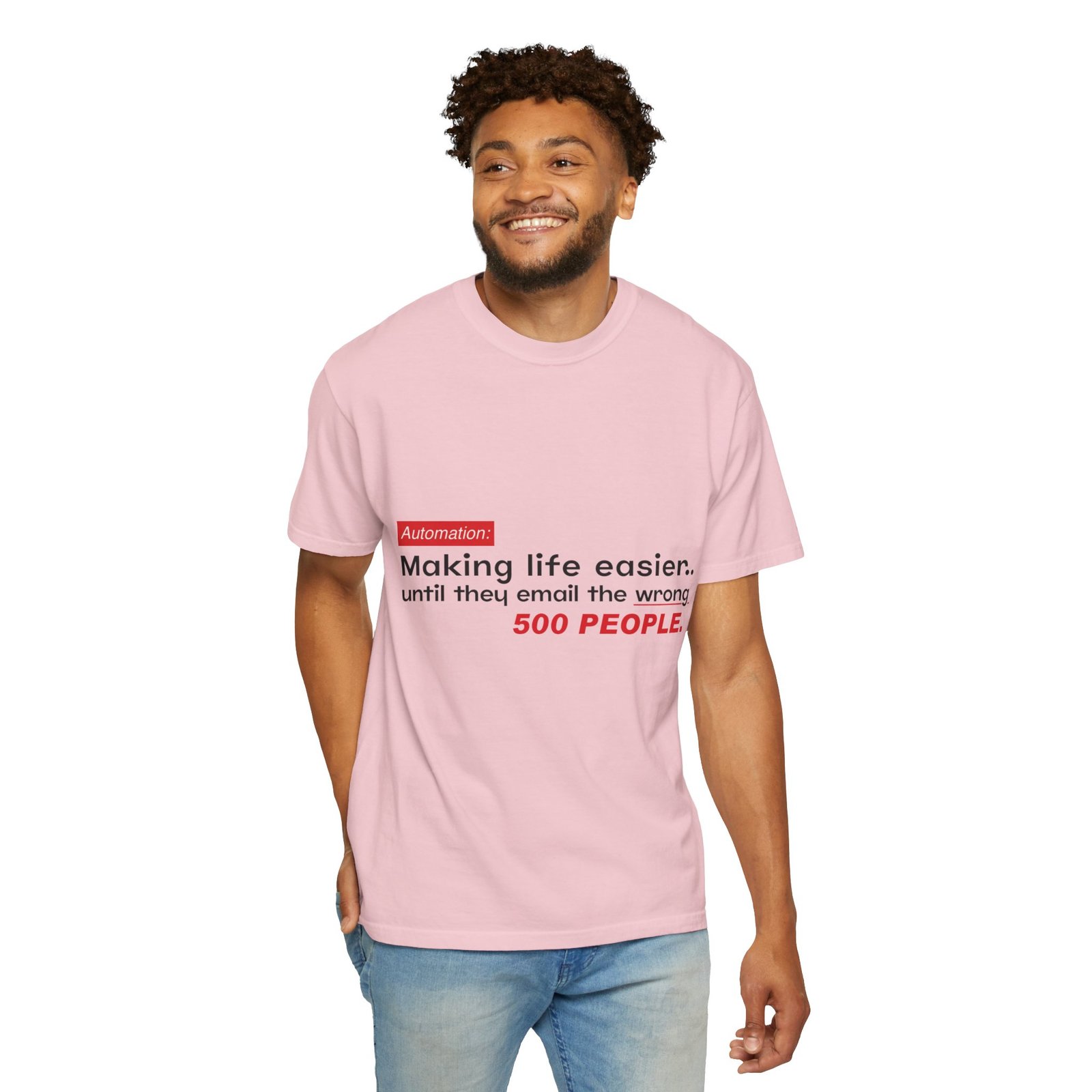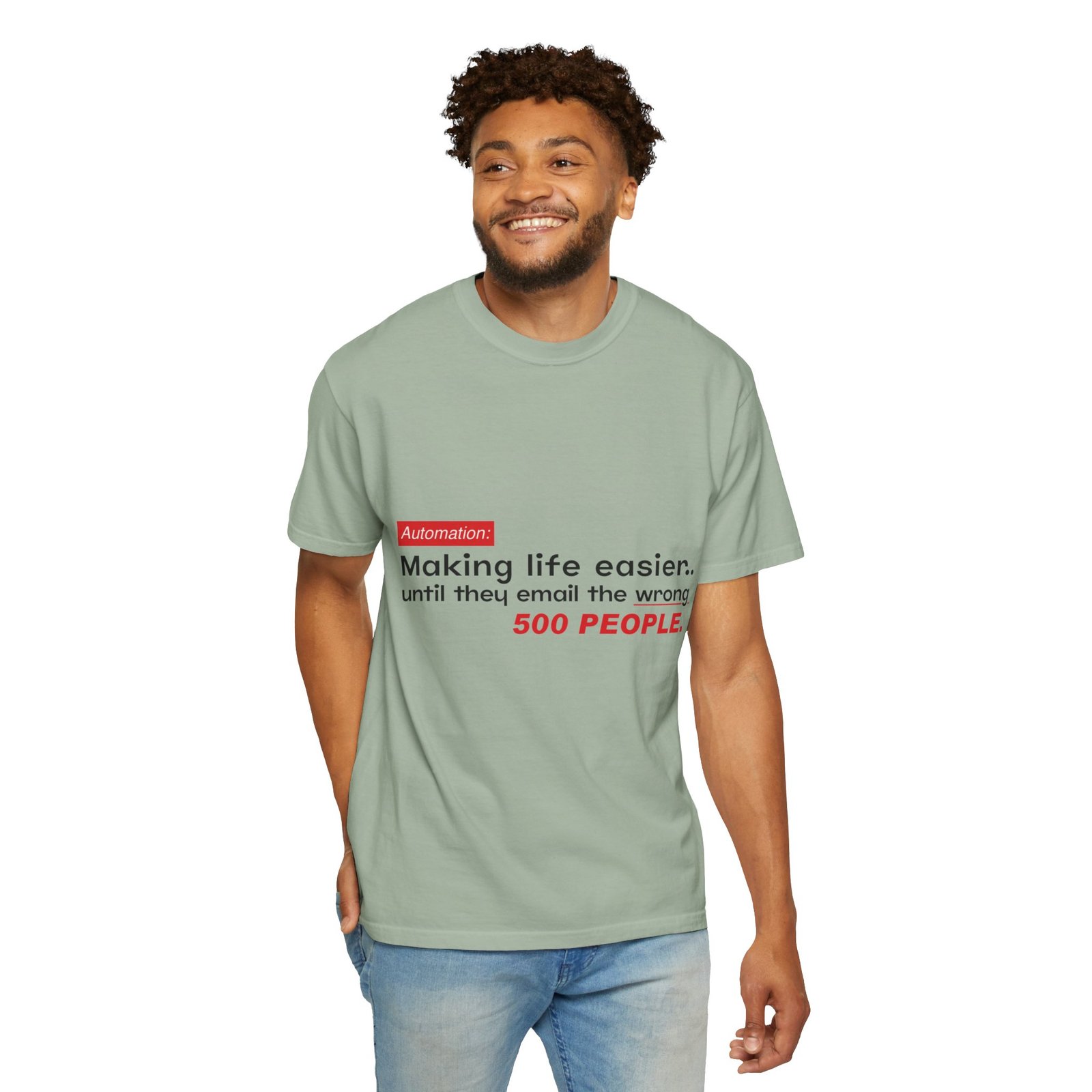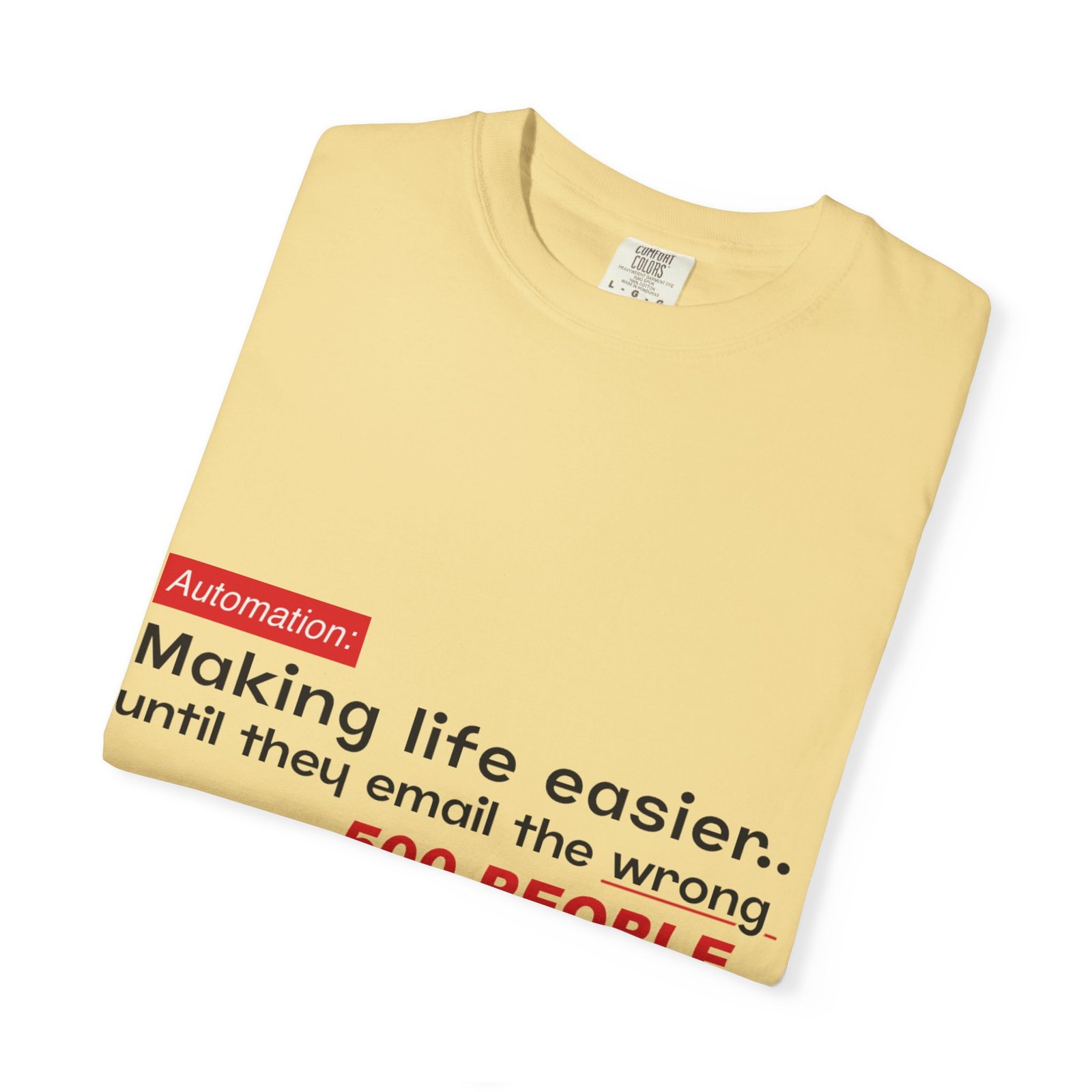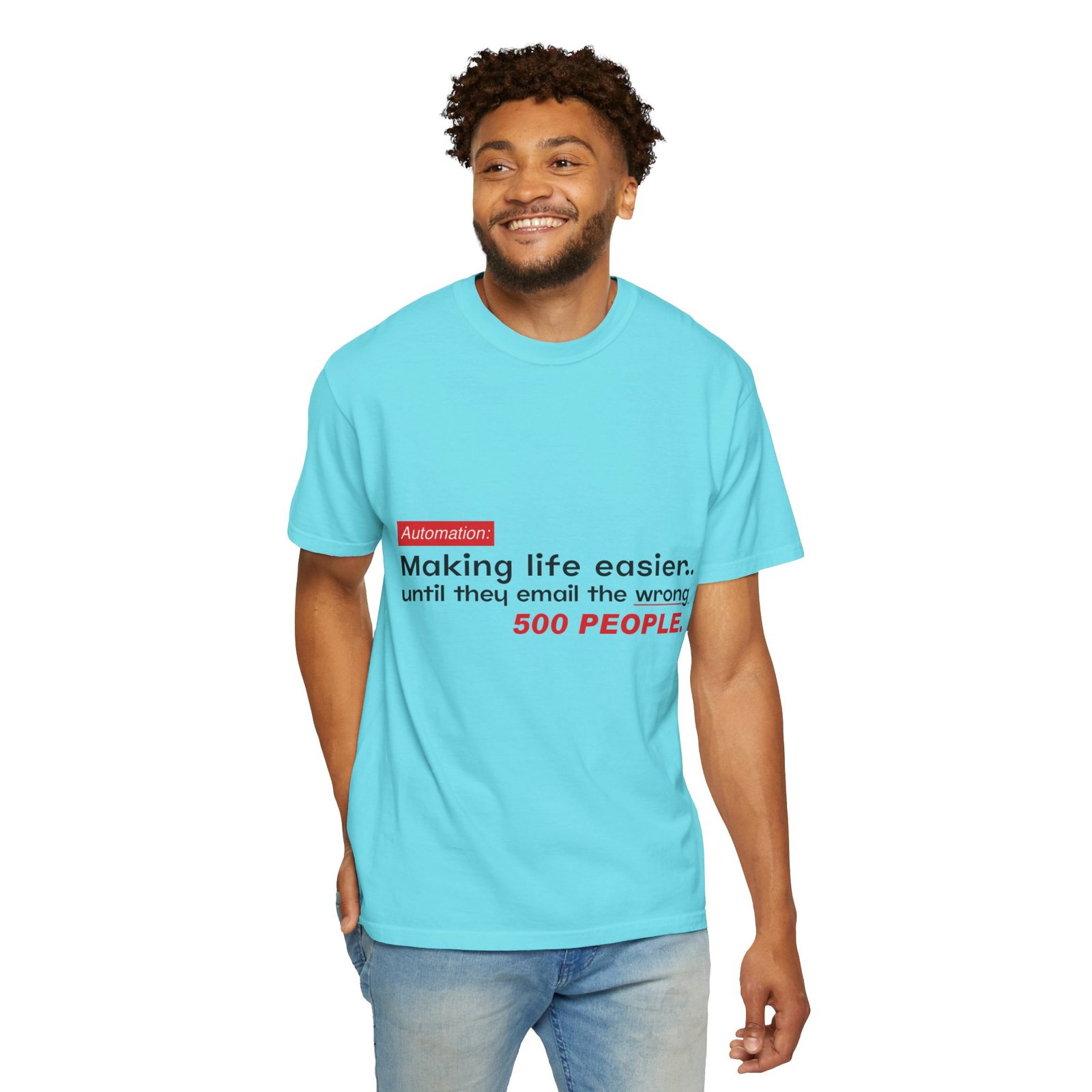 A relaxed, garment-dyed cotton tee that speaks to the quietly defiant: simple, comfortable, and a little bit clever. The soft, washed color and heavyweight, pre-shrunk fabric give this shirt a lived-in feel from day one. A minimalist front print — a small, witty line about automation and the chaos of human error — sits low-key on a clean canvas, so the message reads like an inside joke among coworkers, dev teams, and anyone who builds systems that are supposed to make life easier. Wear it to stand meetings, coffee runs, or late-night debugging sessions; it settles into your rotation and keeps earning compliments for being both comfortable and smartly sarcastic.