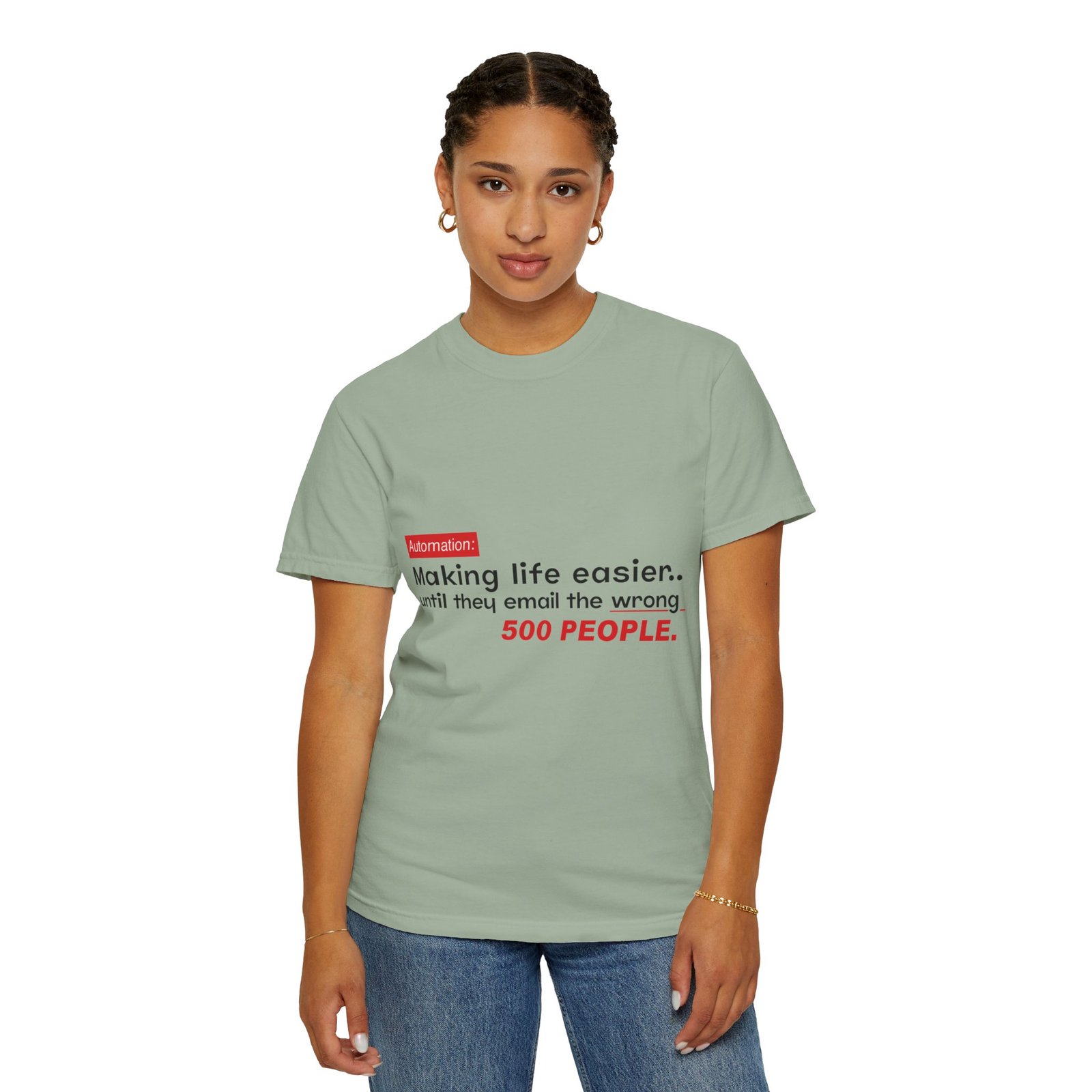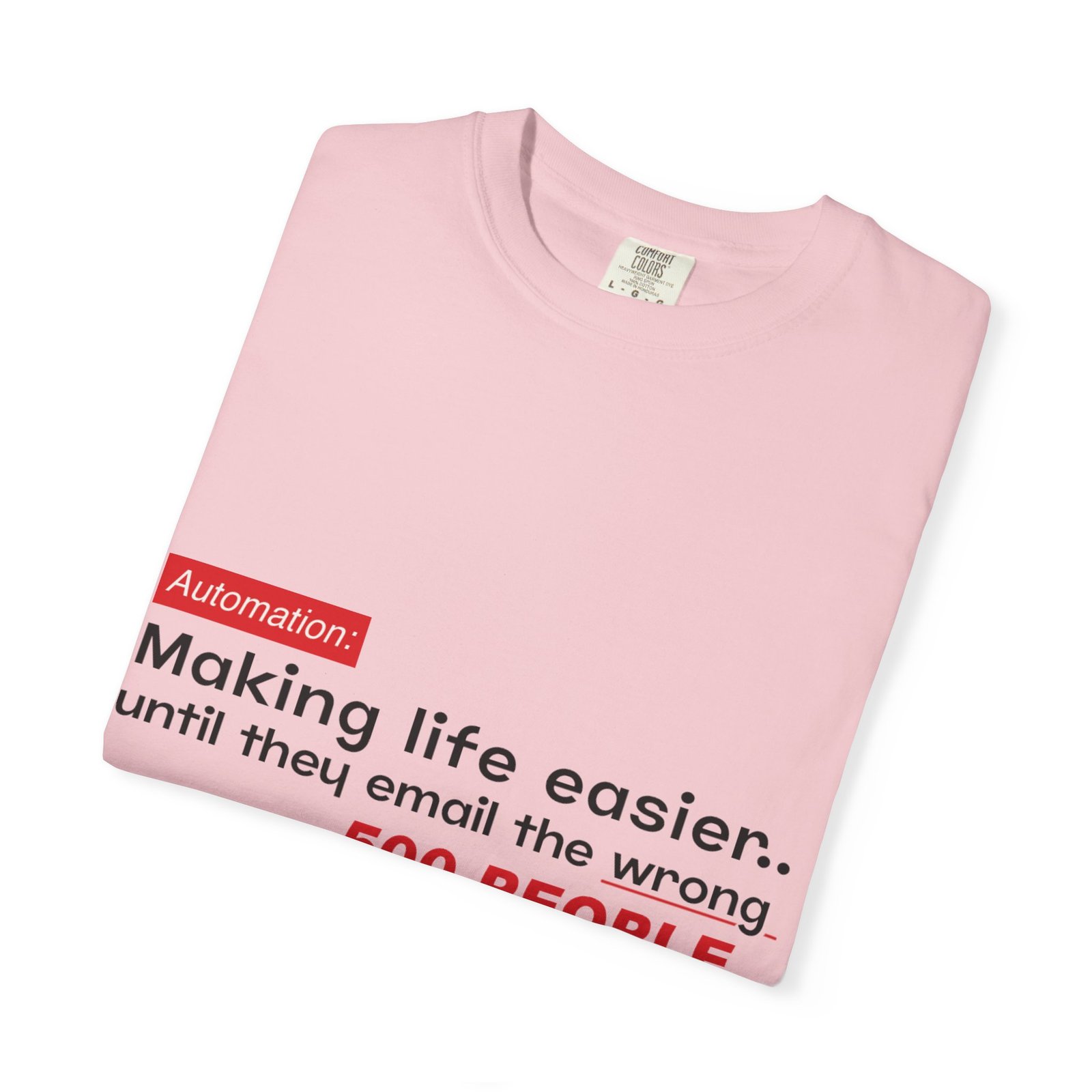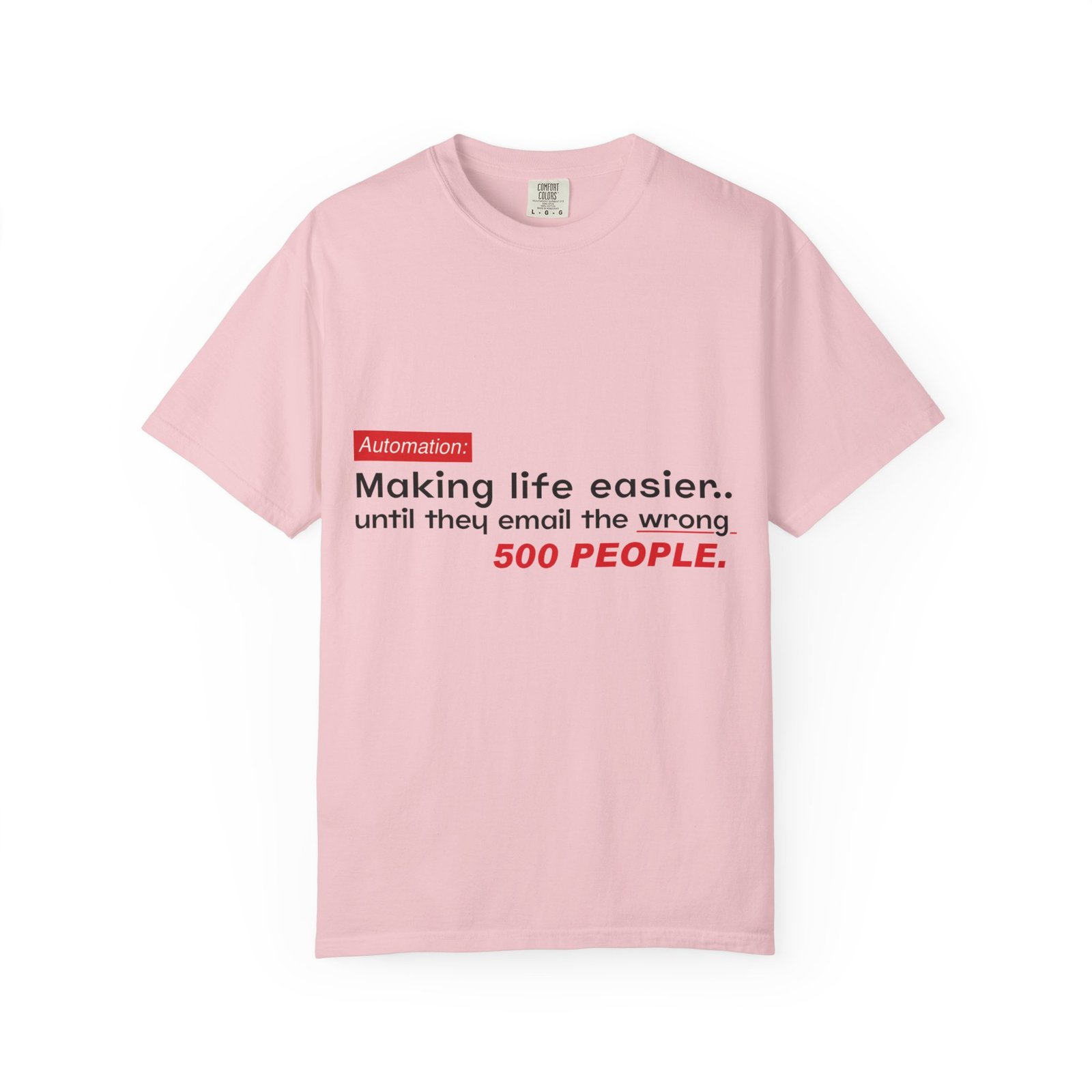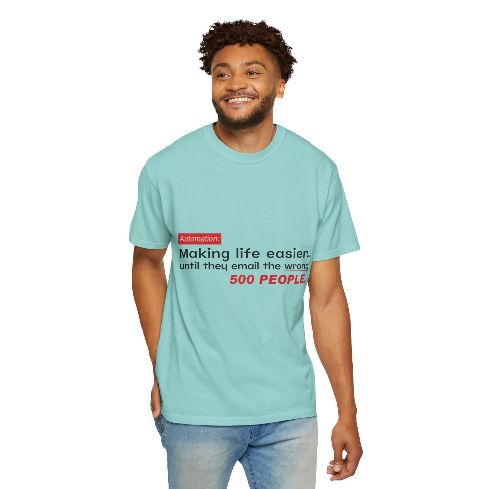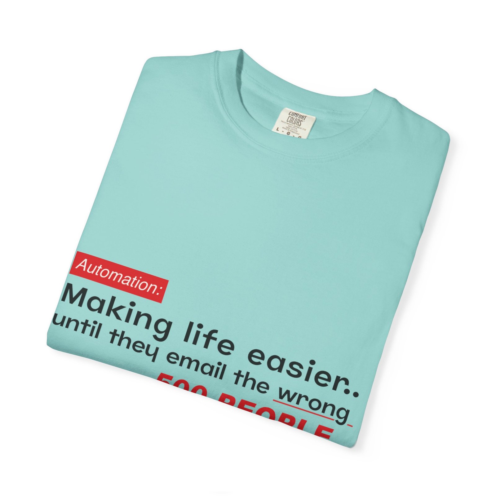A relaxed, garment-dyed cotton tee that speaks to the quietly defiant: simple, comfortable, and a little bit clever. The soft, washed color and heavyweight, pre-shrunk fabric give this shirt a lived-in feel from day one. A minimalist front print — a small, witty line about automation and the chaos of human error — sits low-key on a clean canvas, so the message reads like an inside joke among coworkers, dev teams, and anyone who builds systems that are supposed to make life easier. Wear it to stand meetings, coffee runs, or late-night debugging sessions; it settles into your rotation and keeps earning compliments for being both comfortable and smartly sarcastic.
