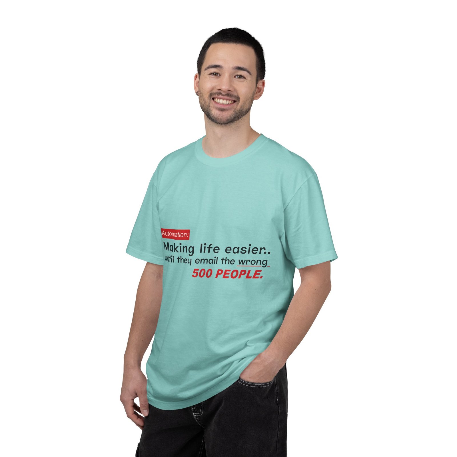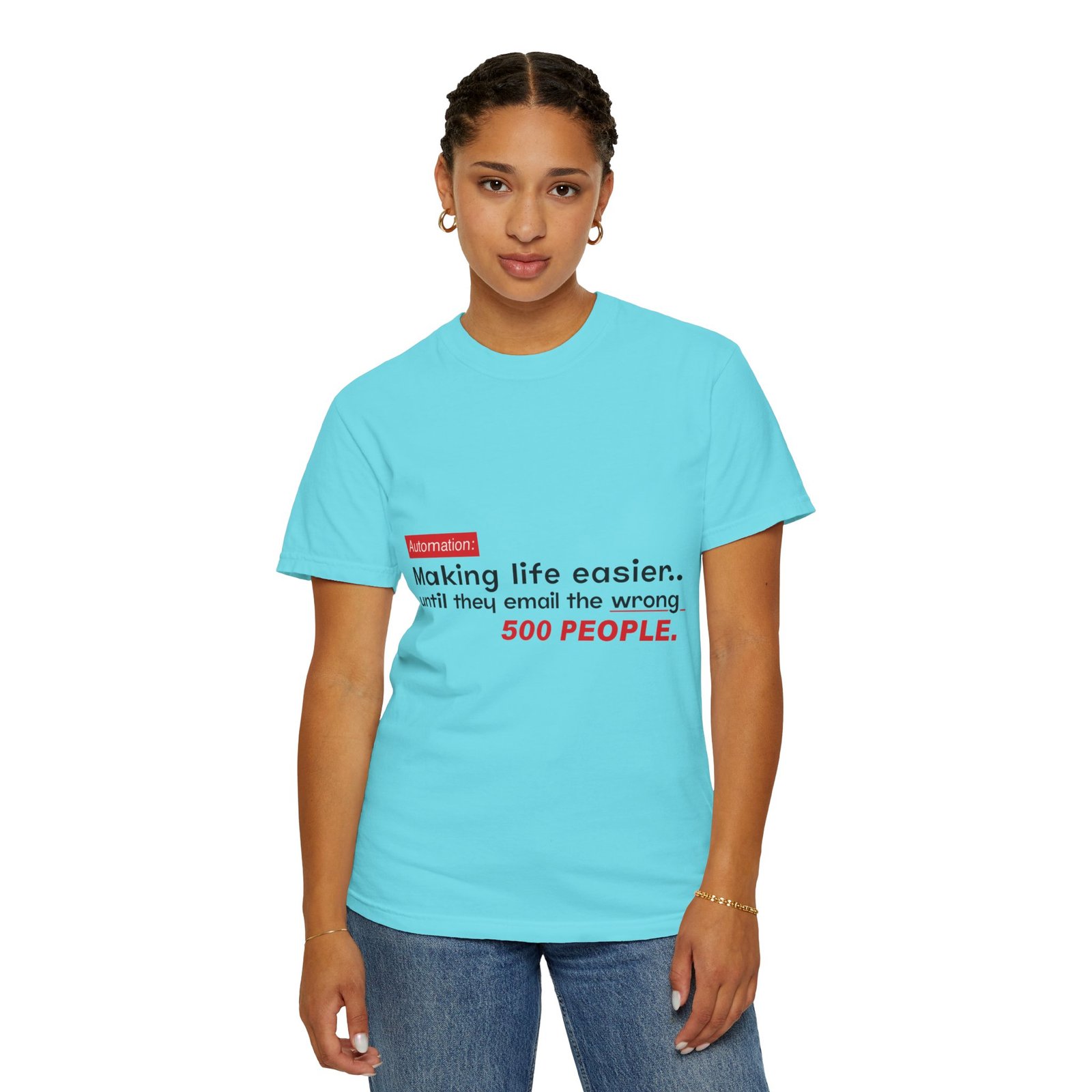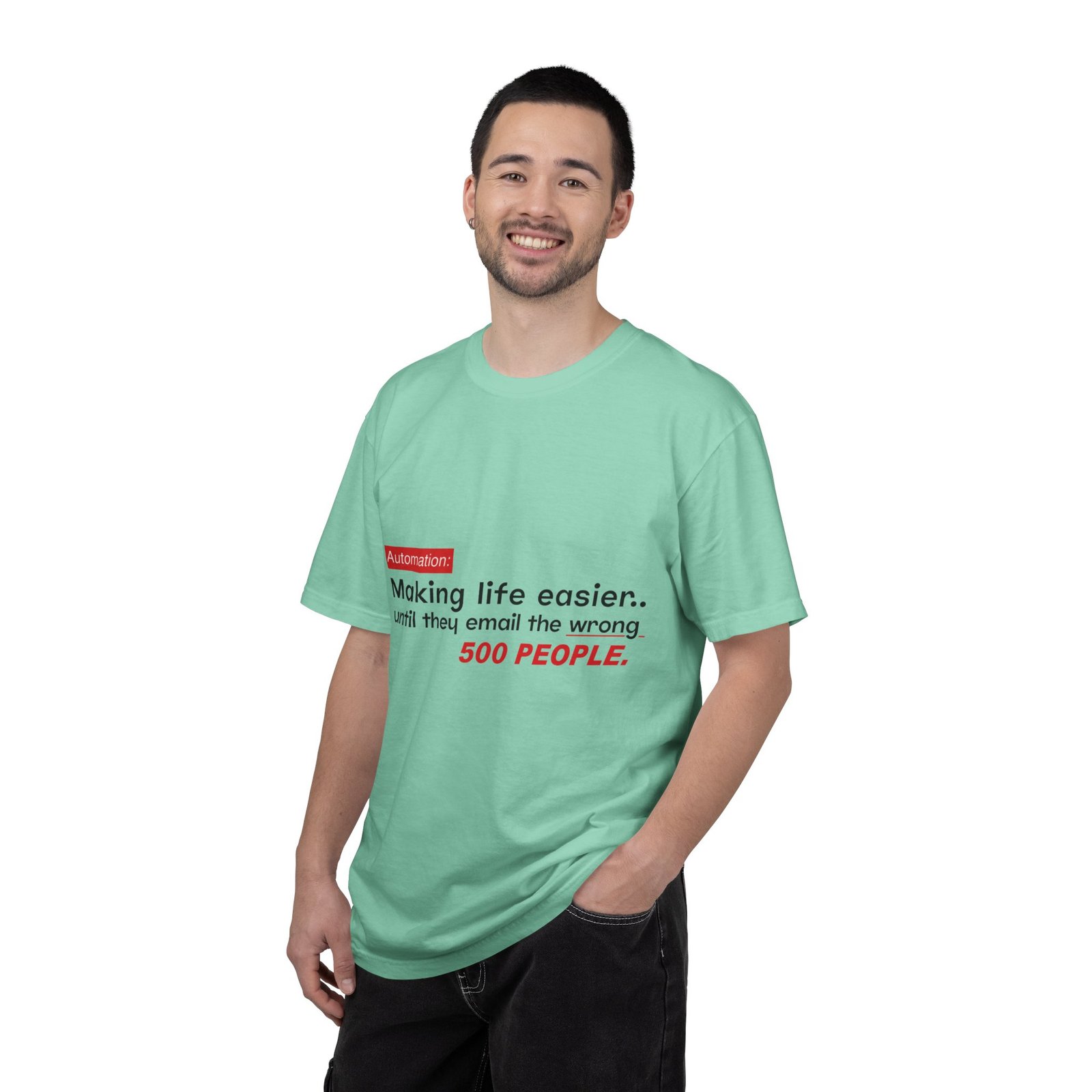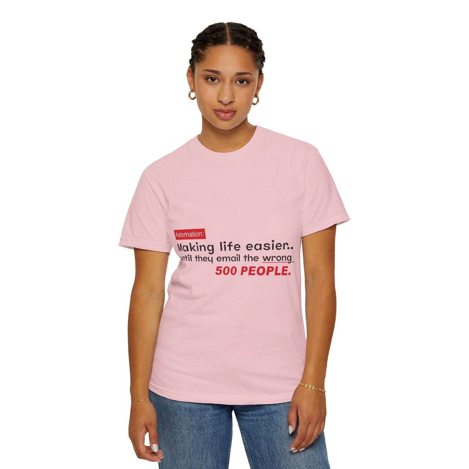 A relaxed, garment-dyed cotton tee that speaks to the quietly defiant: simple, comfortable, and a little bit clever. The soft, washed color and heavyweight, pre-shrunk fabric give this shirt a lived-in feel from day one. A minimalist front print — a small, witty line about automation and the chaos of human error — sits low-key on a clean canvas, so the message reads like an inside joke among coworkers, dev teams, and anyone who builds systems that are supposed to make life easier. Wear it to stand meetings, coffee runs, or late-night debugging sessions; it settles into your rotation and keeps earning compliments for being both comfortable and smartly sarcastic.