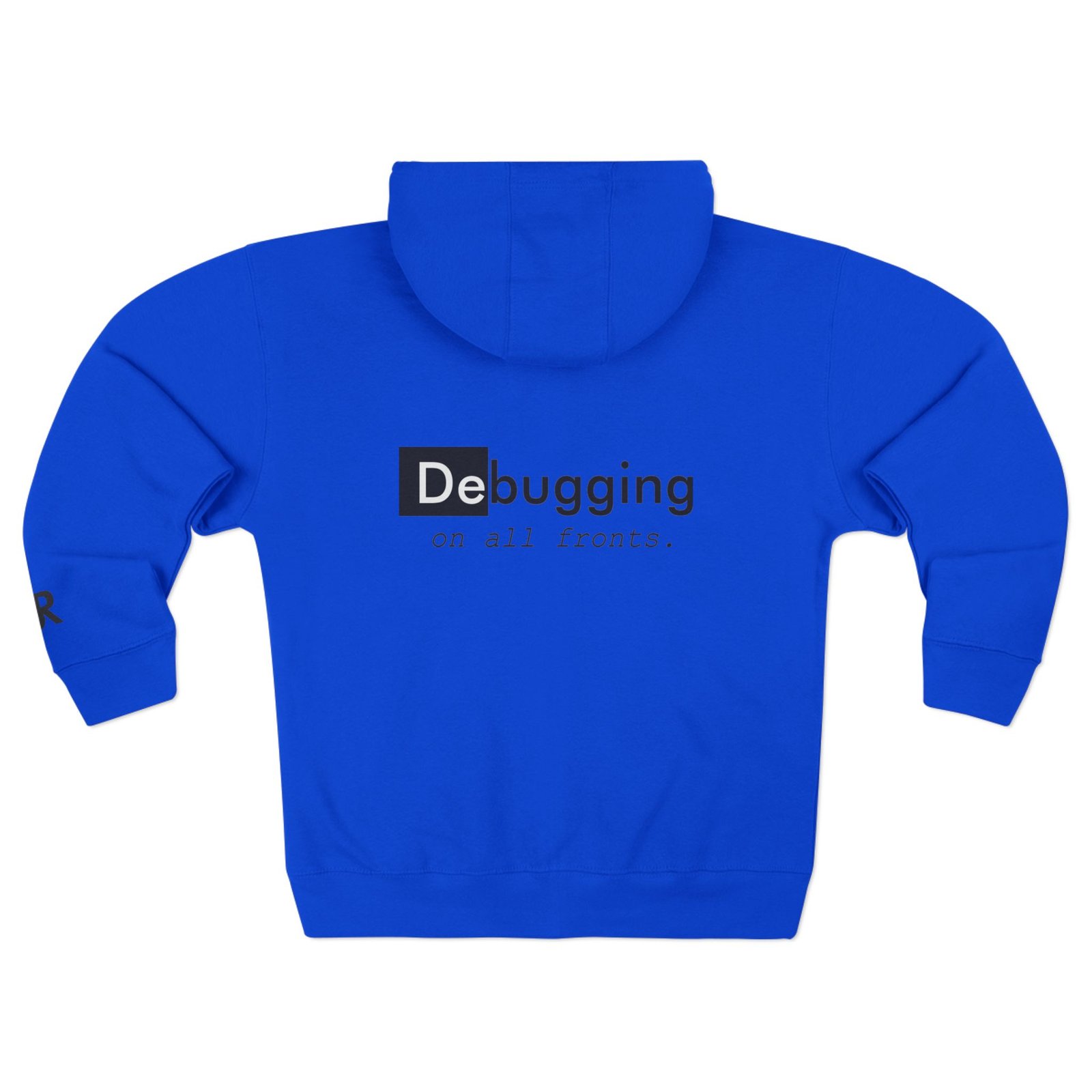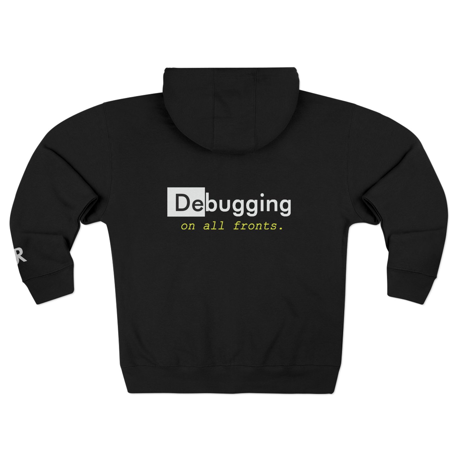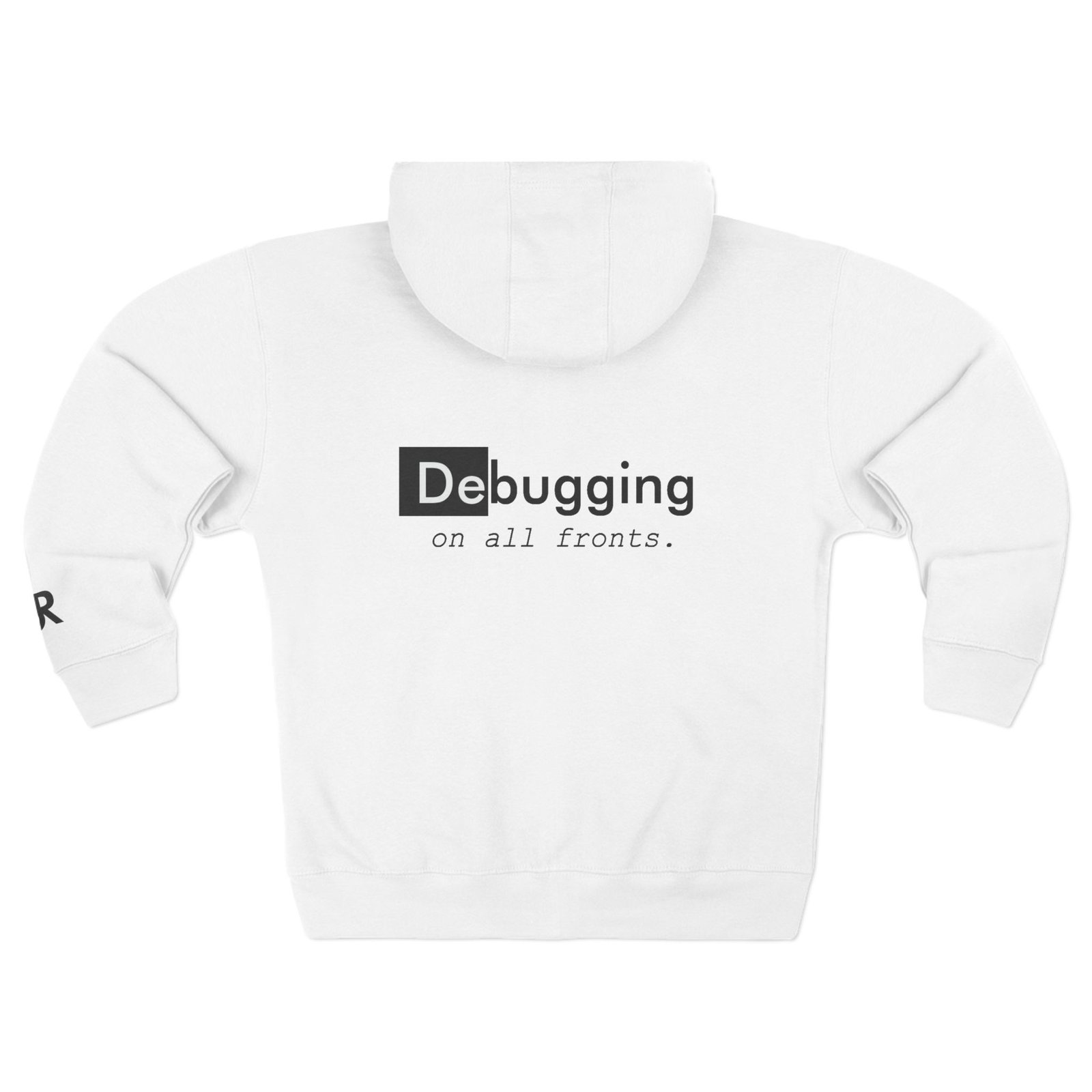 This zip-up hoodie blends everyday comfort with a quietly clever tech sensibility. Soft, midweight fleece wraps you in warmth while the three-panel hood and adjustable drawcords shelter you from wind and coffee-shop drafts. The back shows a minimalist, tongue-in-cheek “Debugging on all fronts.” motif that reads like an inside nod between developers, while small chest and wrist prints add subtle detail. Wear it during late-night coding sessions, sprint demos, or casual meetups—it’s built to move with you, keep pockets full, and endure repeated washes without losing shape.